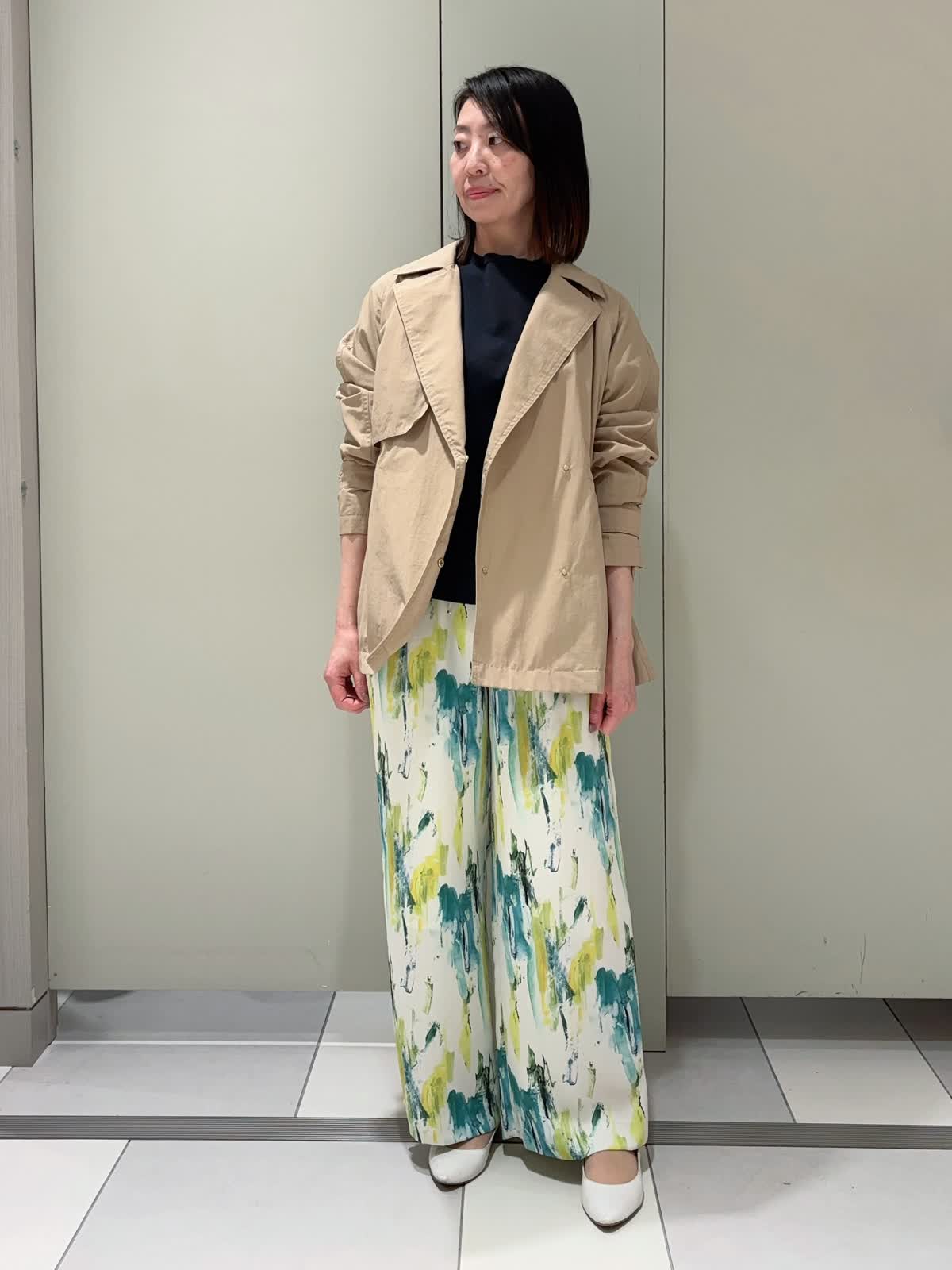 【着用サイズ】コート:9号 ニット:9号 パンツ:7号 【着用カラー】コート:キャメル ニット:ネイビー パンツ:ペパーミント ナイロン100%のハリ感のあるショートコート。ウエストはドロストで絞ってシルエット調整もできる。軽くてシワになりにくく、裏地なしなので長いシーズン使える一枚。 合わせたのは白地にグリーンやイエローが映える春らしい柄パンツ。軽やかな明るいカラーで季節感をプラス。春のお出かけにぴったりな大人可愛いスタイリングです。