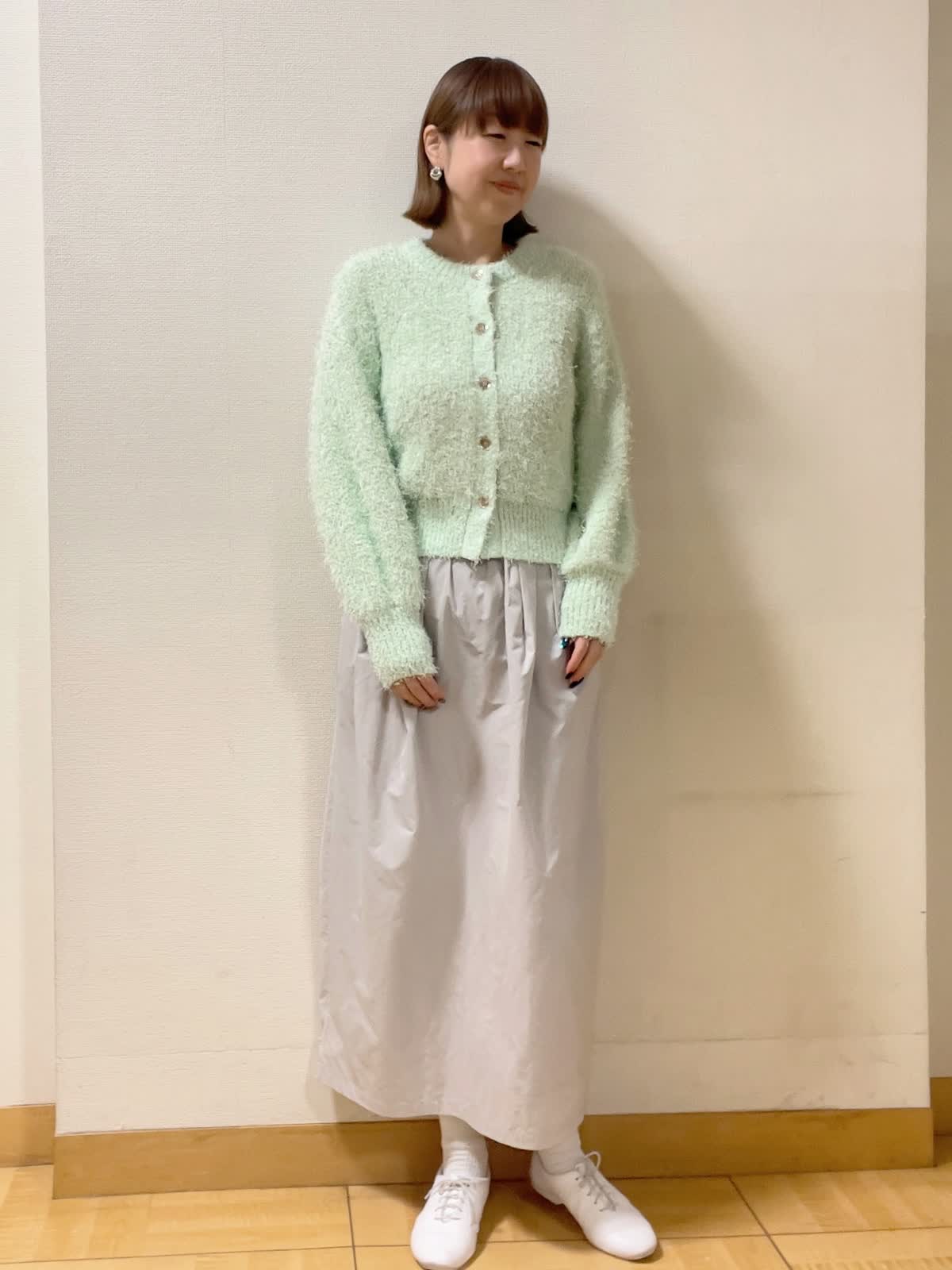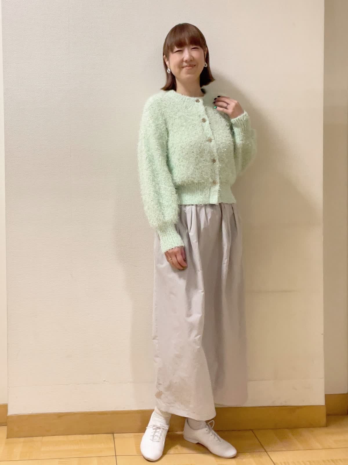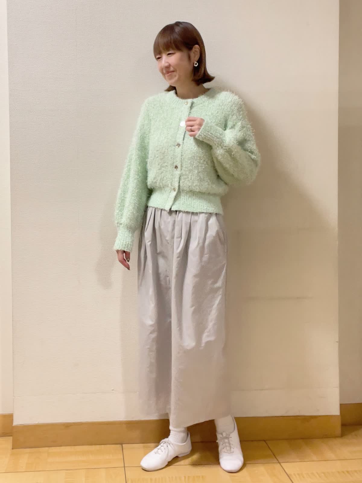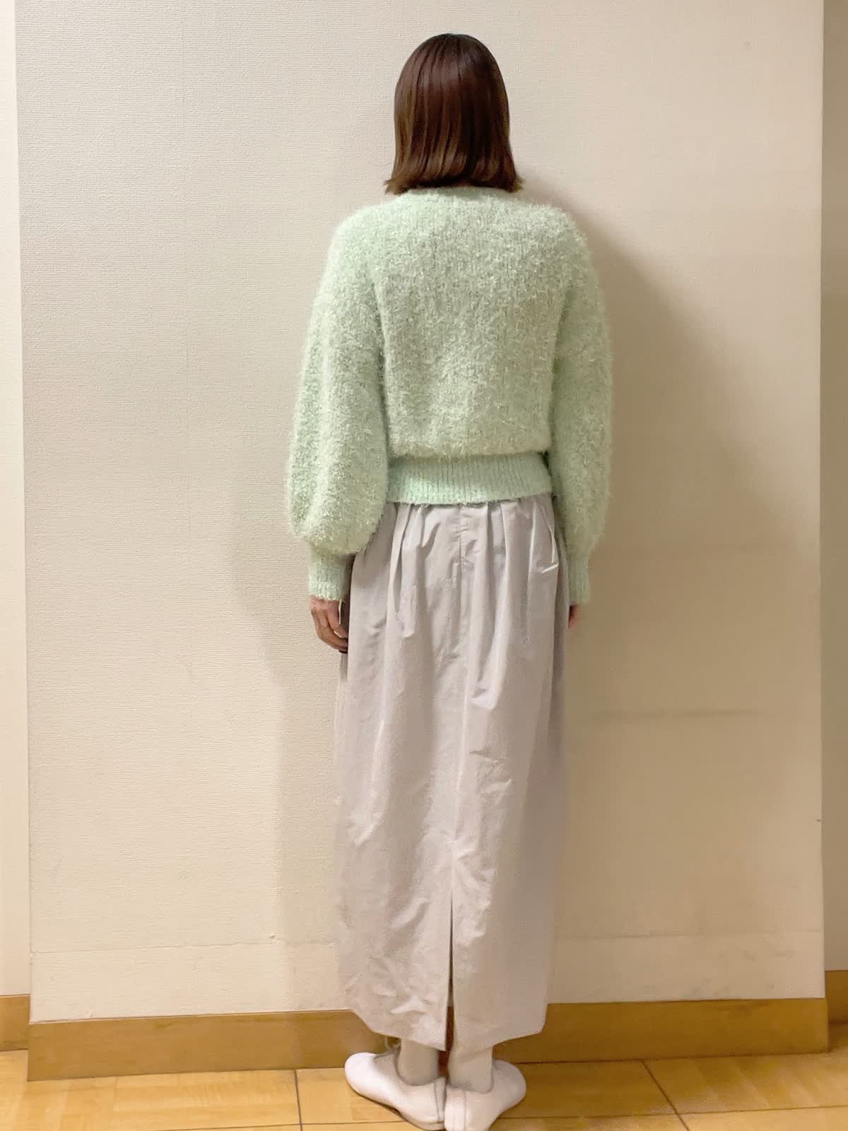 【着用サイズ】ニット:フリー スカート:9号【着用カラー】ニット:グリーン スカート:グレー お出かけスタイル ふんわりと 毛足の長さが可愛らしいカーディガン。着丈が程よくロングスカートとバランス良くスタイリングできます。グリーンカラーで春気分。