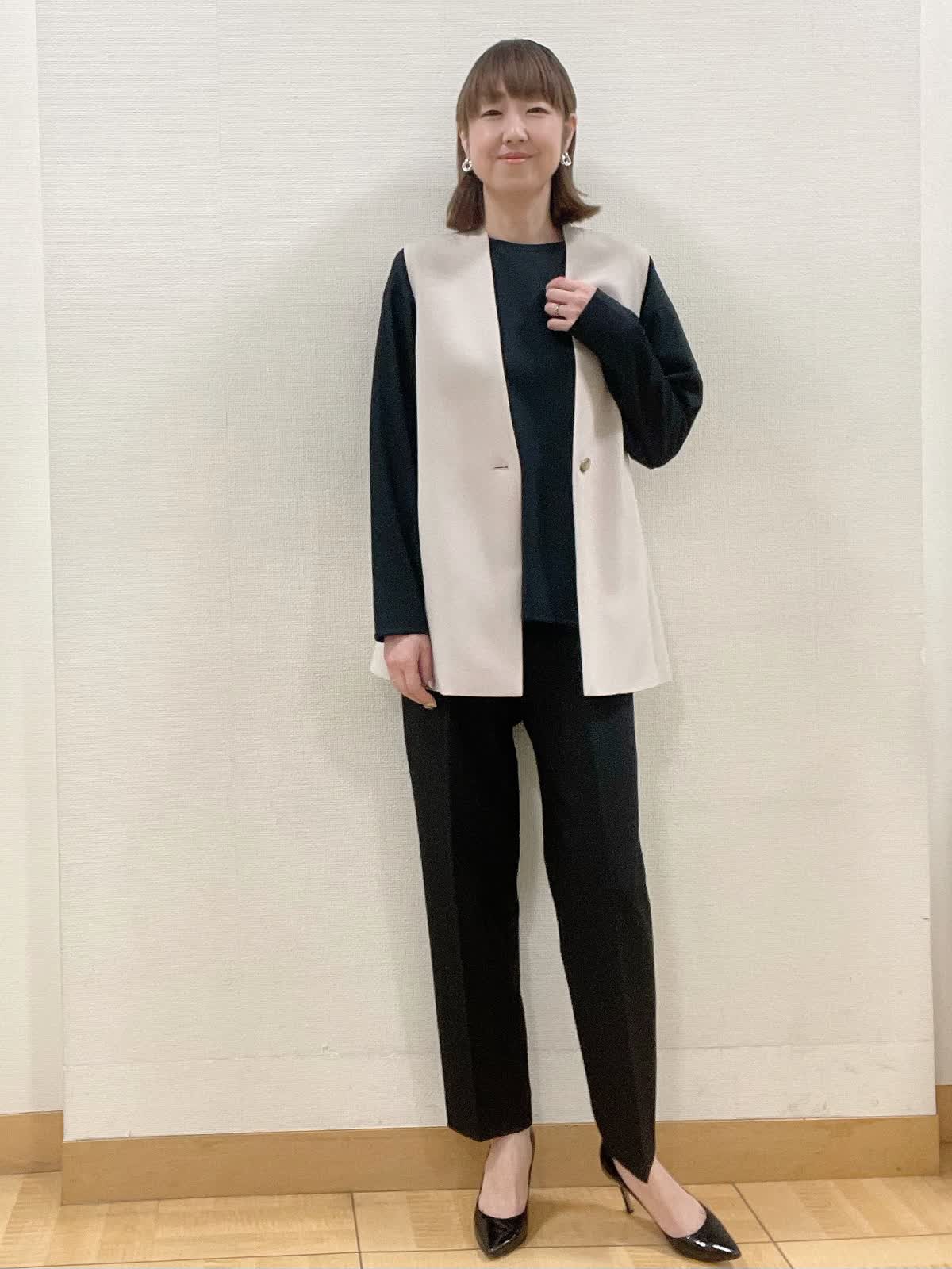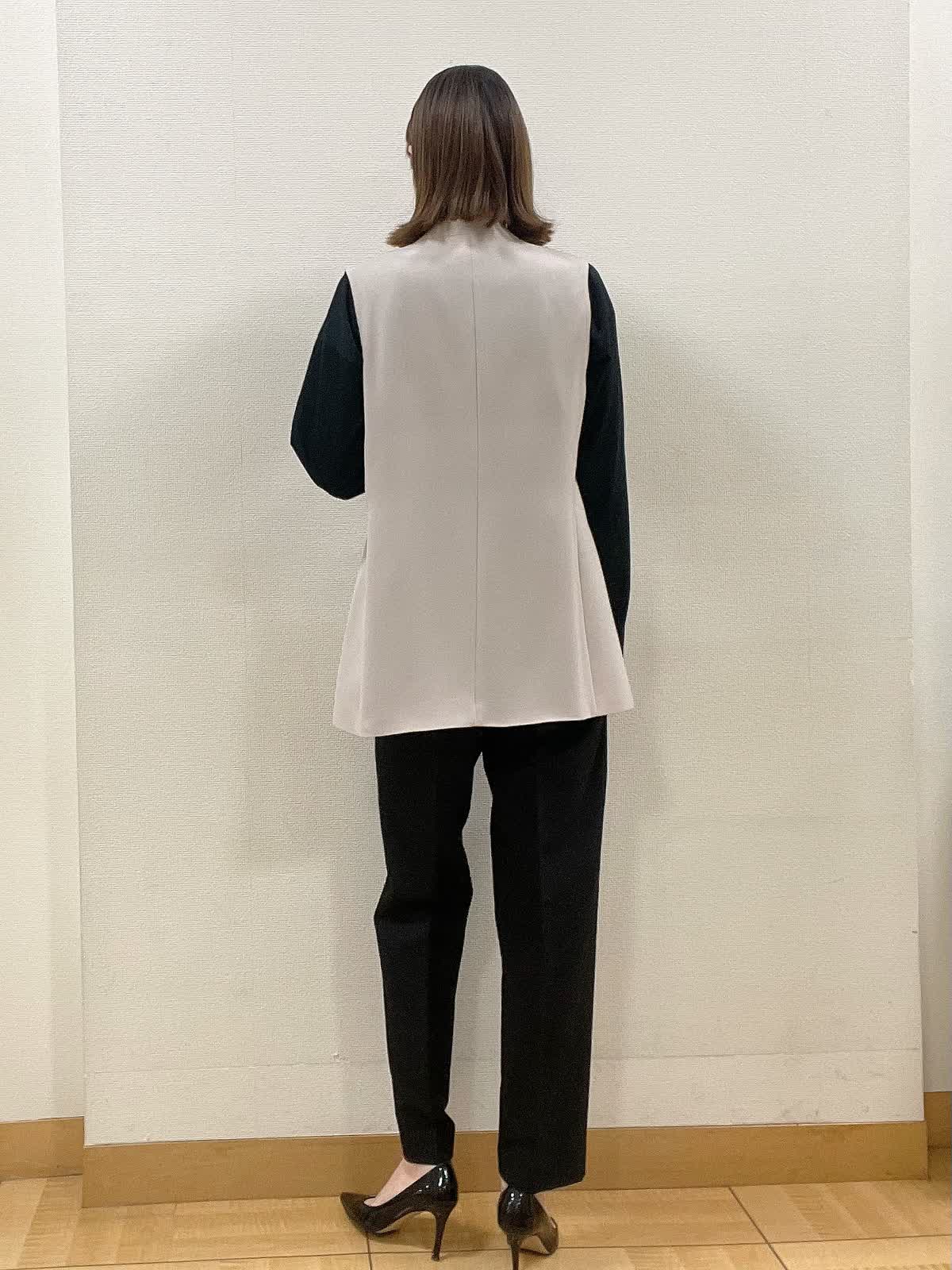 【着用サイズ】ジレ、パンツ共に9号カットソー:フリー【着用カラー】ジレ:グレージュカットソー:ブラック パンツ:ネイビーお出かけスタイル ベーシックなデザインのジレ。インナーにロンTを合わせて抜け感を出しつつも綺麗めスタイルが決まります。1枚でも様になるアイテムでおすすめ。