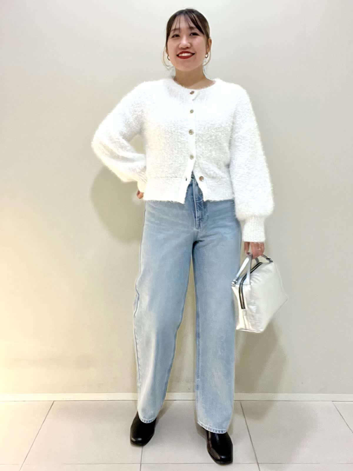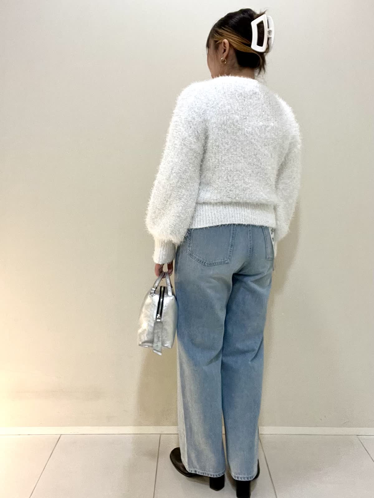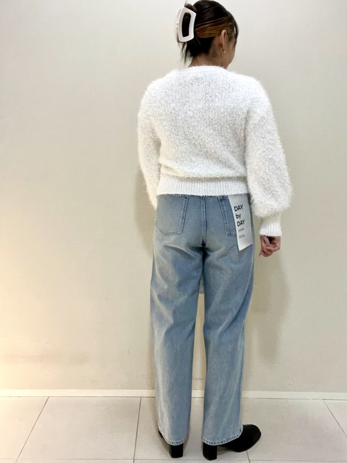 【着用サイズ】カーディガン:フリー デニムパンツ:M 【着用カラー】カーディガン:オホワイト デニムパンツ:サックス バッグ:シルバー コラボSTORYで休日コーデ。フェザーのカーディガンはコラボSTORYのカーディガンで、着るだけで可愛い印象になります。甘さを少し抑える為にデニムで合わせました。DAY by DAYオリジナルのデニムです。ストレートの型を履いています。ストレッチが効いており柔らかい生地感です。股上深めです。デニムで可愛い雰囲気のコーディネートをしたい日におすすめのアイテム達です。ぜひお試しください?