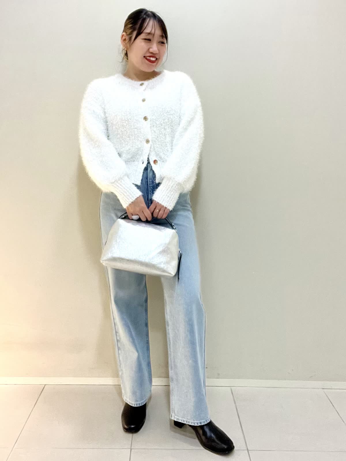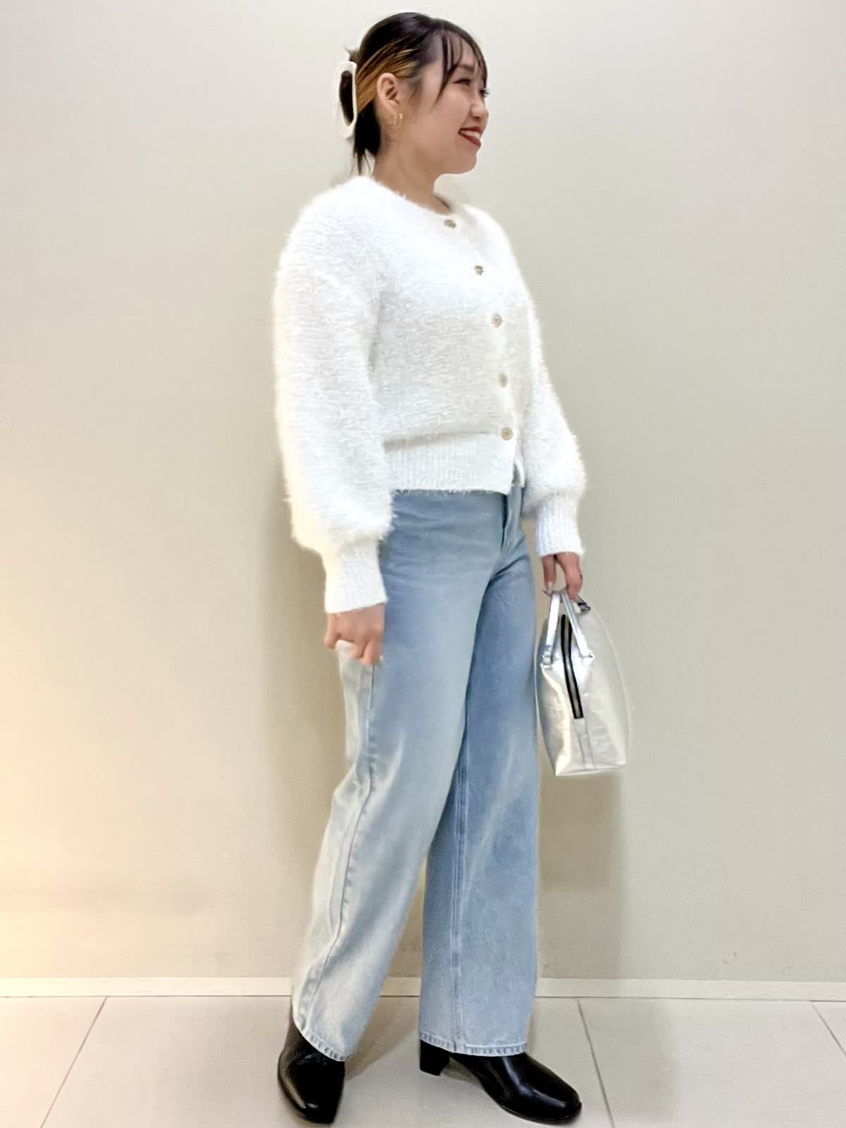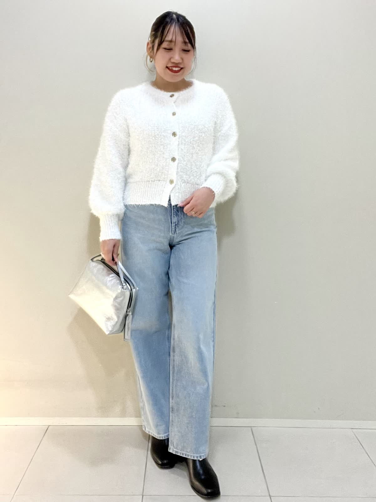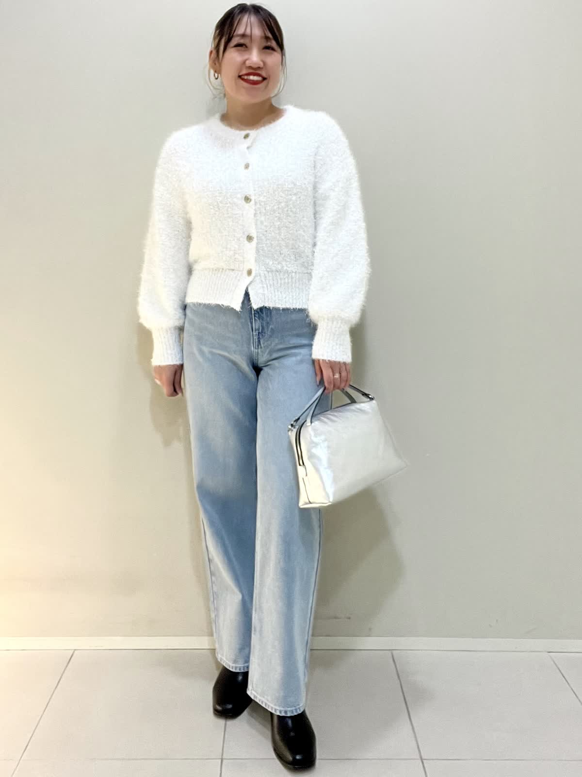 【着用サイズ】カーディガン:フリー デニムパンツ:M 【着用カラー】カーディガン:オホワイト デニムパンツ:サックス バッグ:シルバー コラボSTORYで休日コーデ。フェザーのカーディガンはコラボSTORYのカーディガンで、着るだけで可愛い印象になります。甘さを少し抑える為にデニムで合わせました。DAY by DAYオリジナルのデニムです。ストレートの型を履いています。ストレッチが効いており柔らかい生地感です。股上深めです。デニムで可愛い雰囲気のコーディネートをしたい日におすすめのアイテム達です。ぜひお試しください?