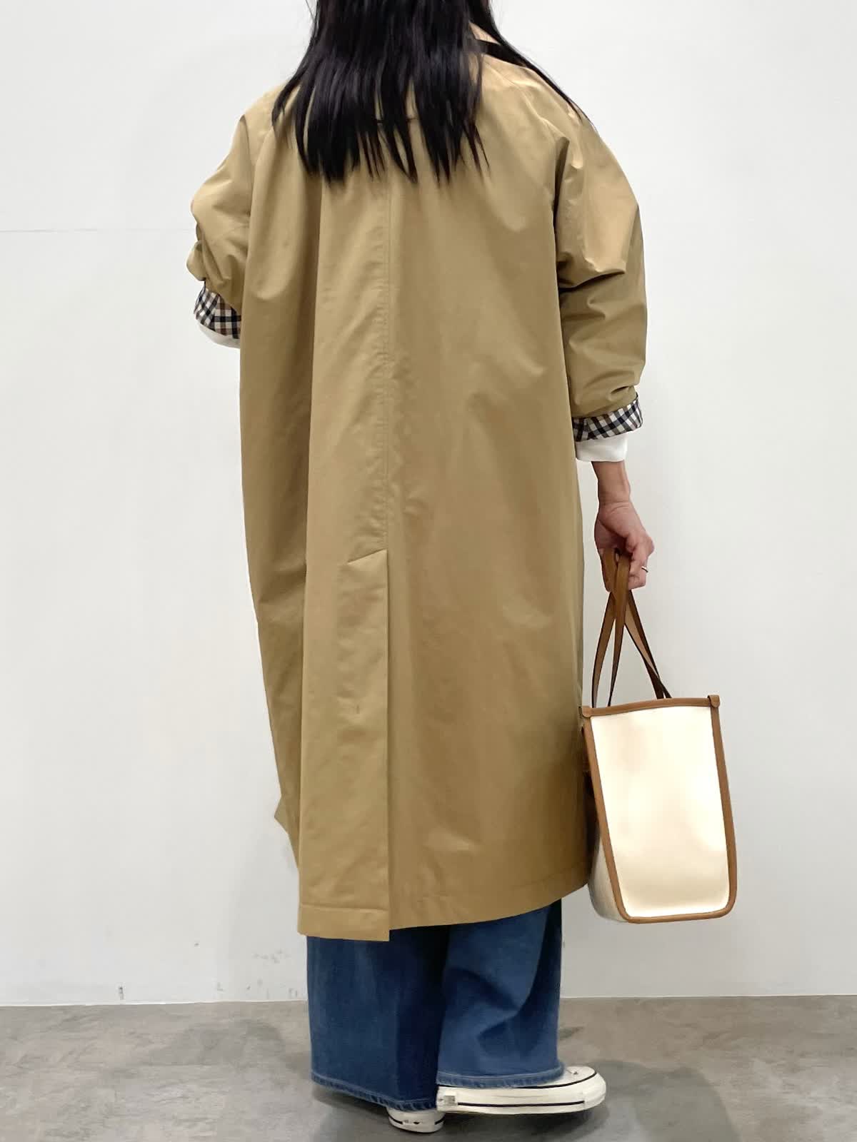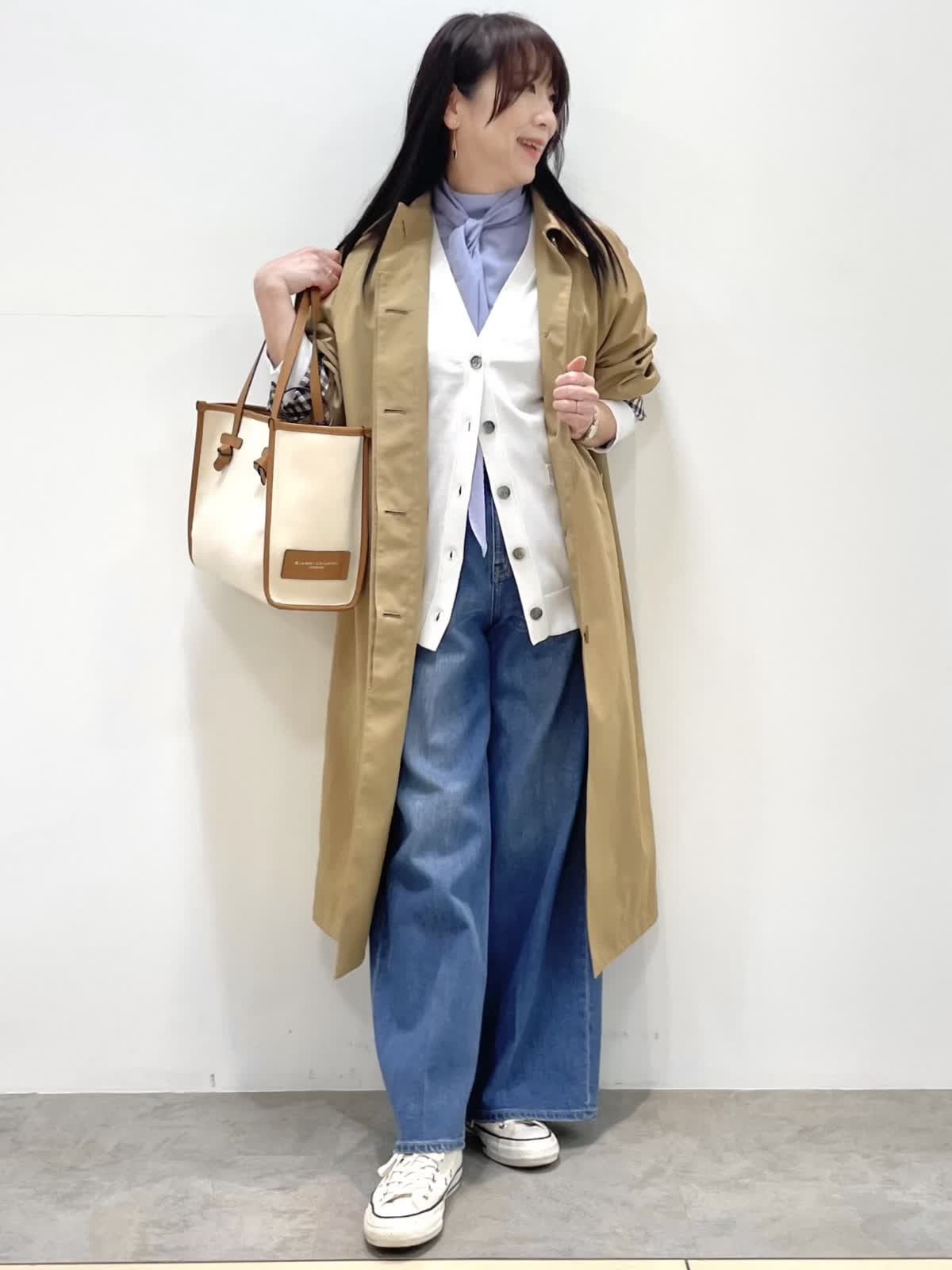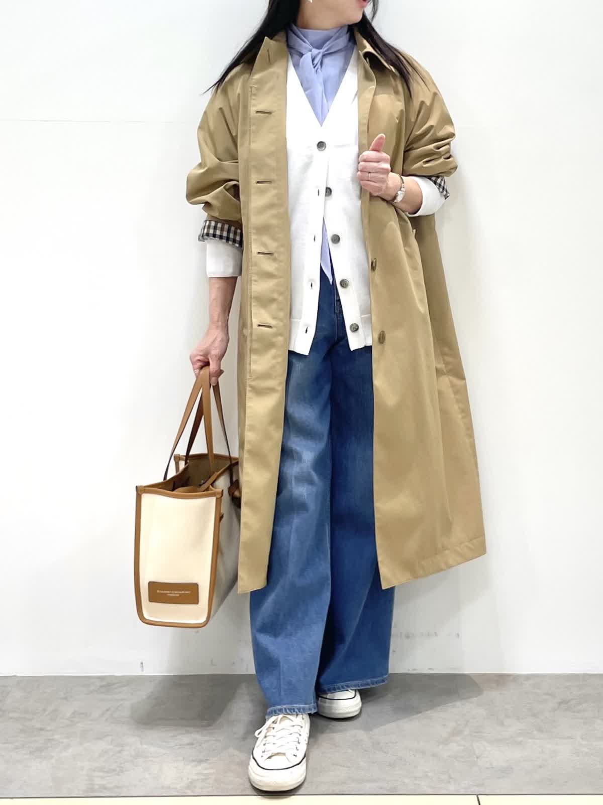 【着用サイズ】全て9号 【着用カラー】コート: キャメル ブラウス: サックス カーディガン: オフホワイト デニム:インディゴ 休日のお出かけスタイル。Aquascutum×INEDのコラボレーションコート。羽織るだけでスタイリングが決まる優秀コートです。コクーンシルエットでゆったりとしたサイズ感なのでインナーを選びません。裏地のクラブチェックがポイントです。