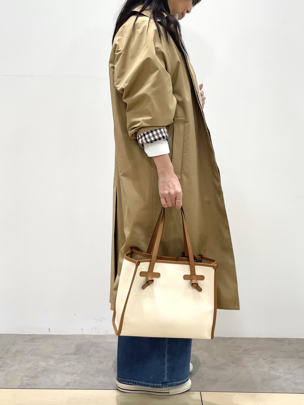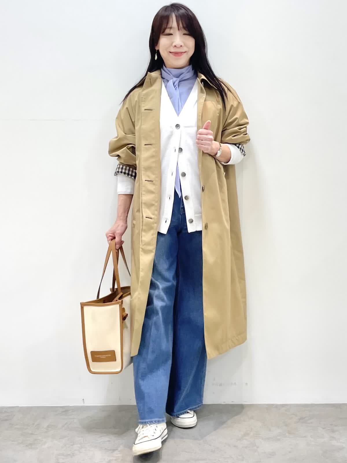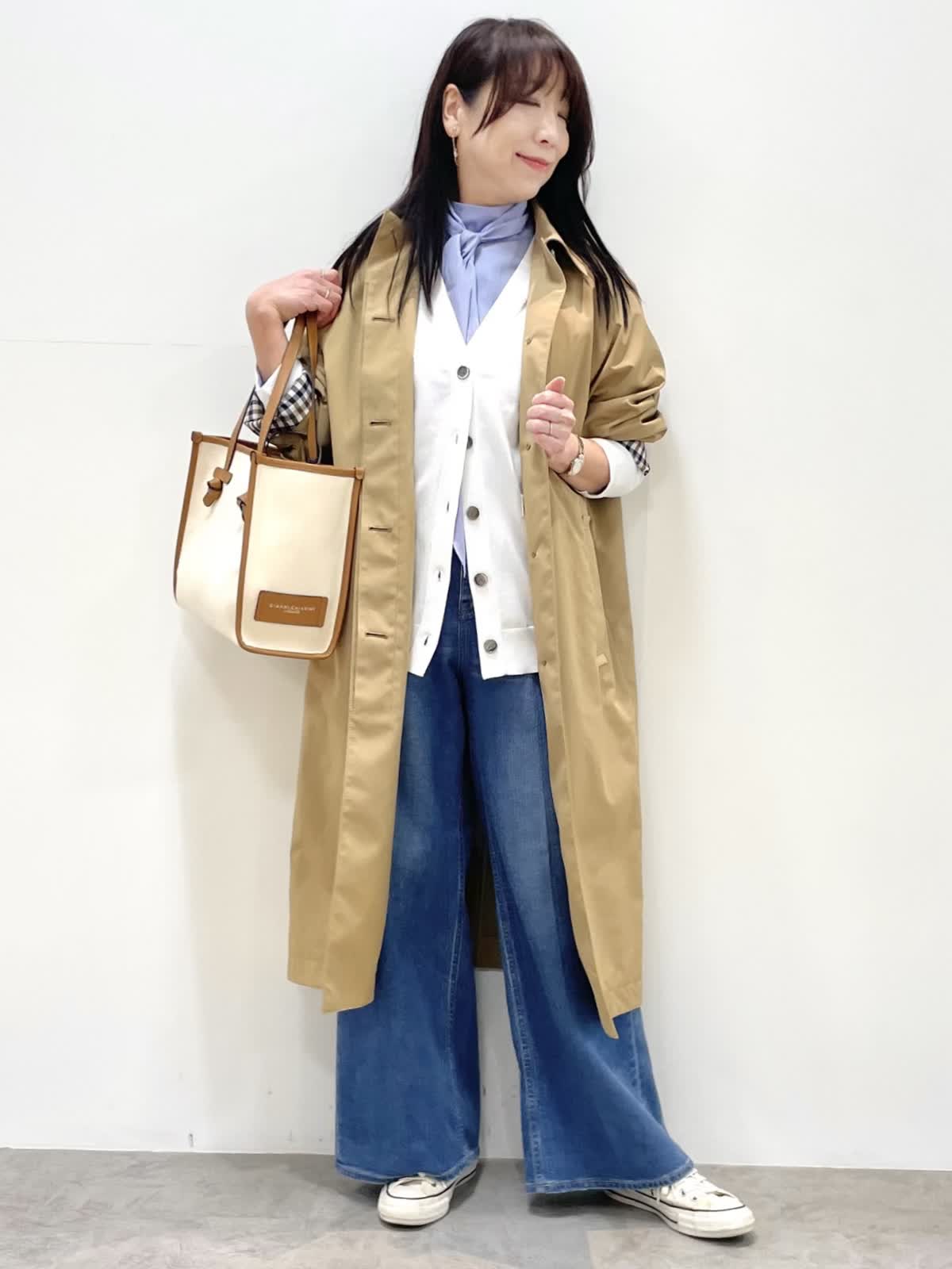【着用サイズ】全て9号 【着用カラー】コート: キャメル ブラウス: サックス カーディガン: オフホワイト デニム:インディゴ 休日のお出かけスタイル。Aquascutum×INEDのコラボレーションコート。羽織るだけでスタイリングが決まる優秀コートです。コクーンシルエットでゆったりとしたサイズ感なのでインナーを選びません。裏地のクラブチェックがポイントです。