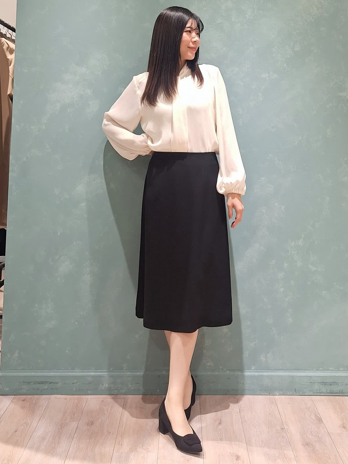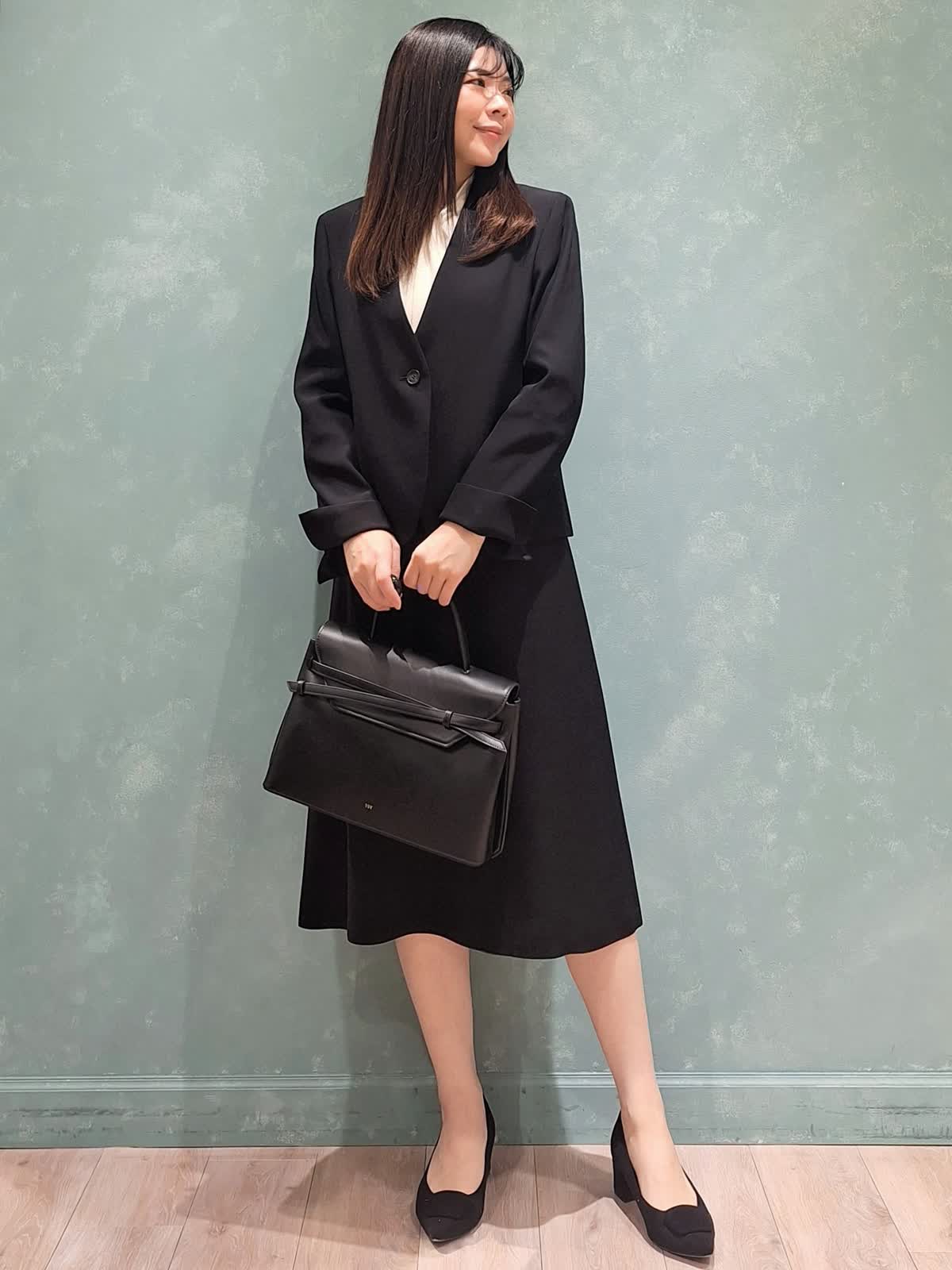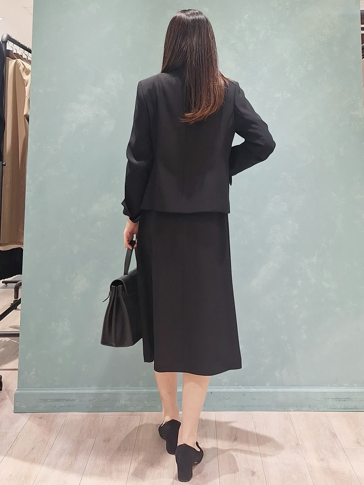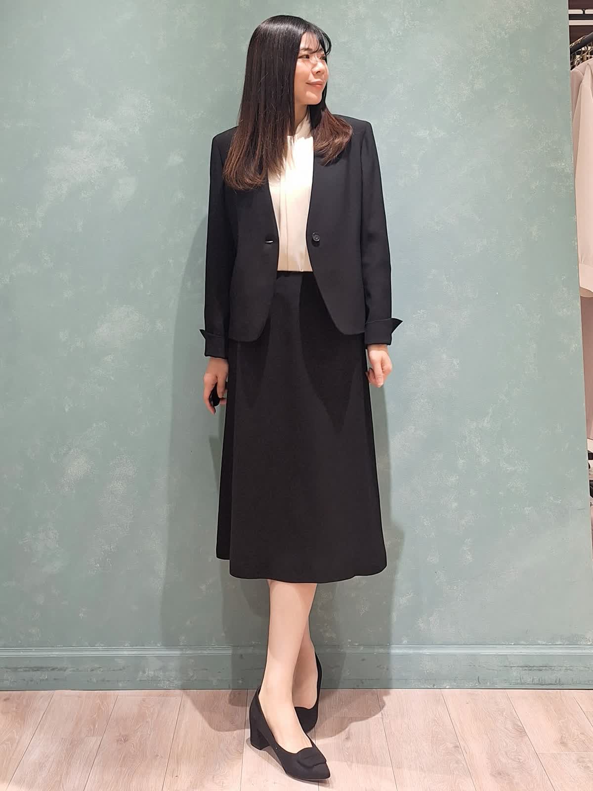 【着用サイズ、カラー】全て7号 ジャケット、スカート/ブラック ブラウス、オフホワイト 大学の入学式や、新社会人にお勧めのスーツスタイルです。ジャケットはカラーレスでコンパクト、スカートはベーシックな膝丈、Aラインシルエットで歩きやすいデザインです。ブラウスは、前開きタイプのボウタイブラウス。着脱が楽チンです。袖口はゴム仕様で、フワッとボリュームのあるお袖も作れます。全て洗えてシワになりにくいイージーケアタイプなのもお勧めのポイントです!