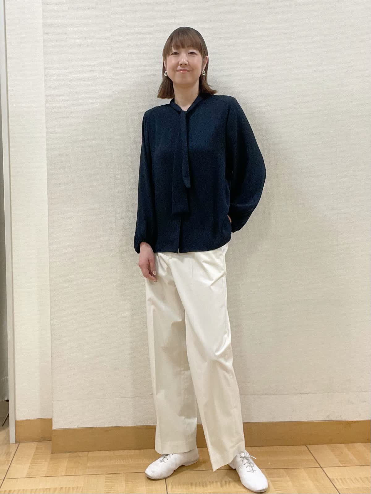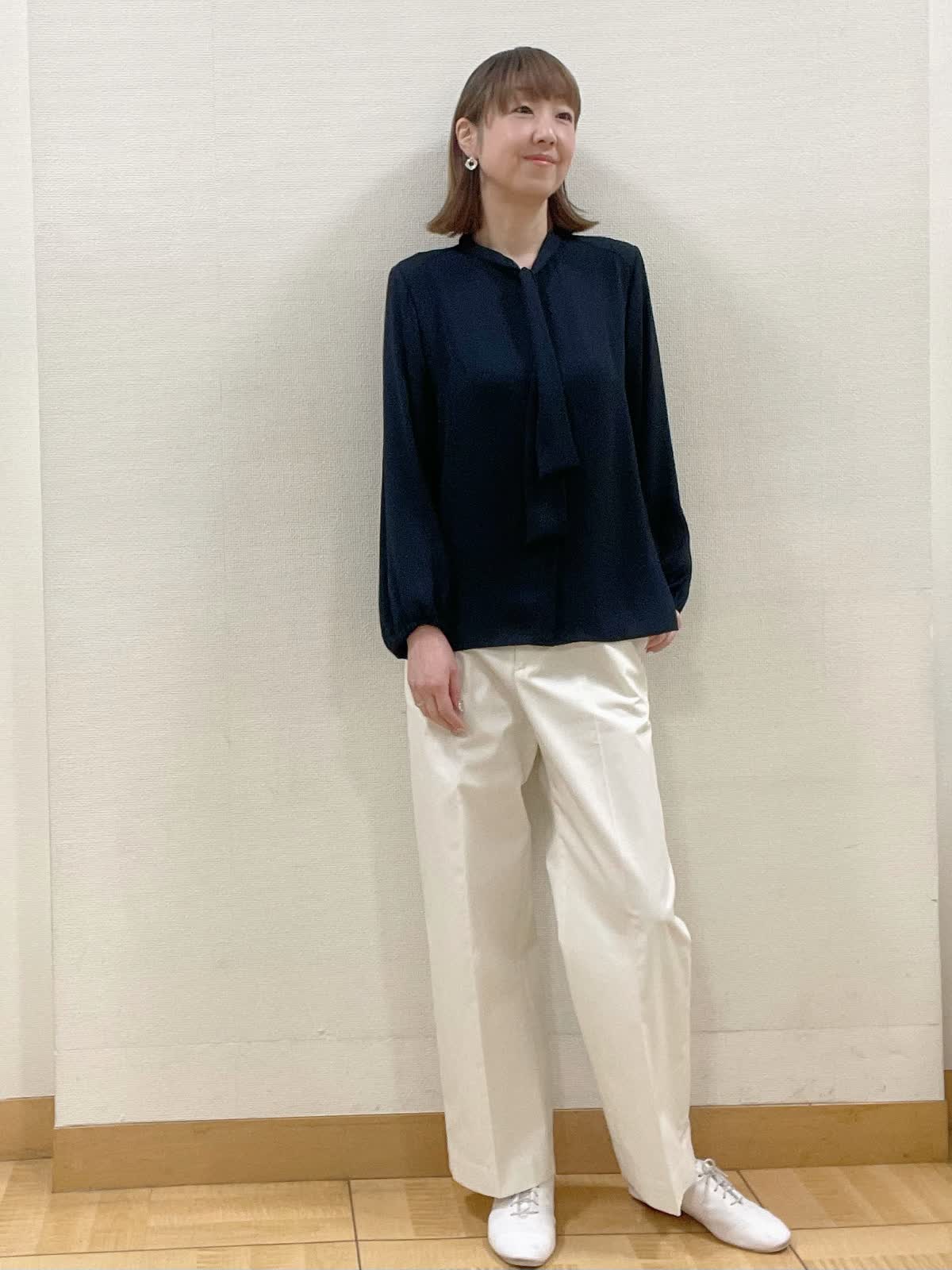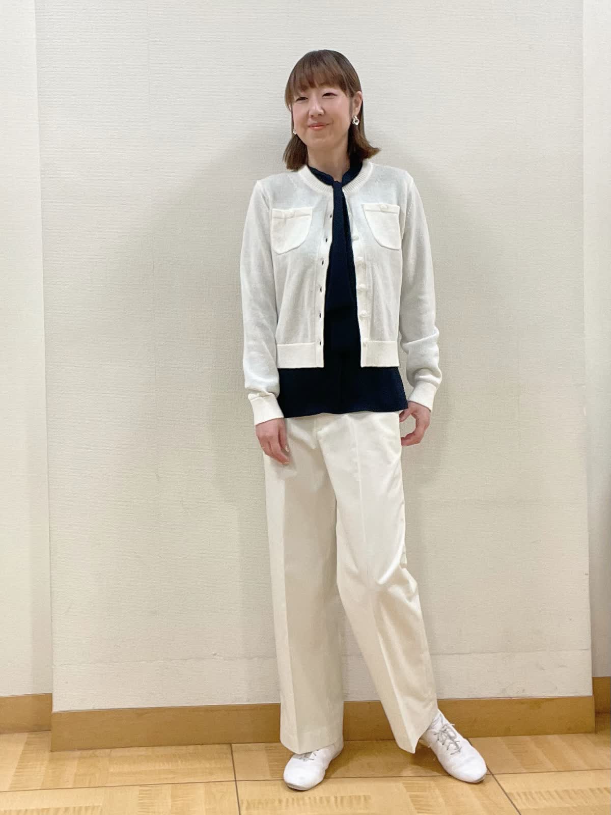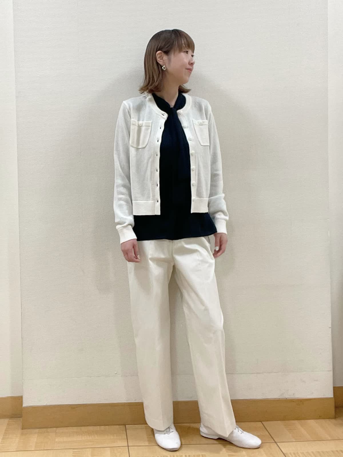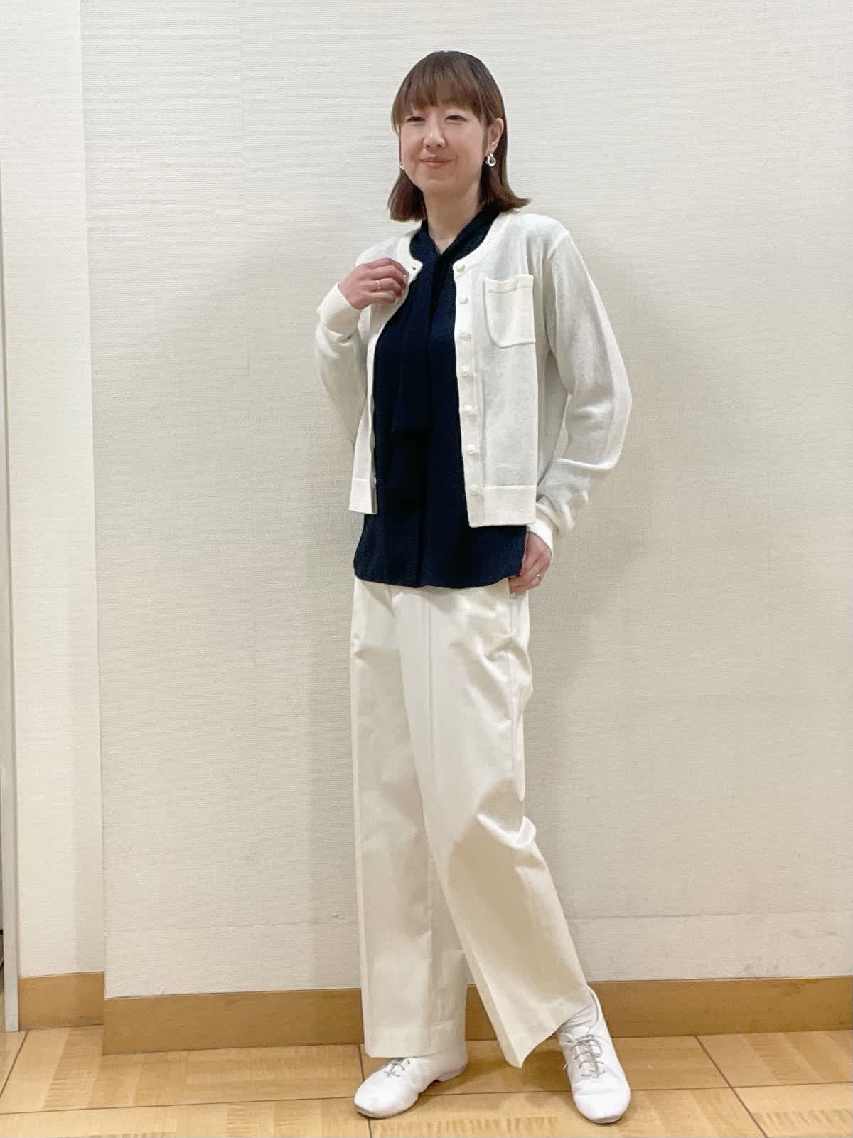 【着用サイズ】カーディガン:フリー ブラウス、パンツ共に9号【着用カラー】カーディガン、パンツ共にオフホワイト ブラウス:ネイビー 綺麗めになりがちなボウタイブラウスにニットカーディガンを合わせて休日スタイルに。パンツも同系色にすることで清涼感をプラス。