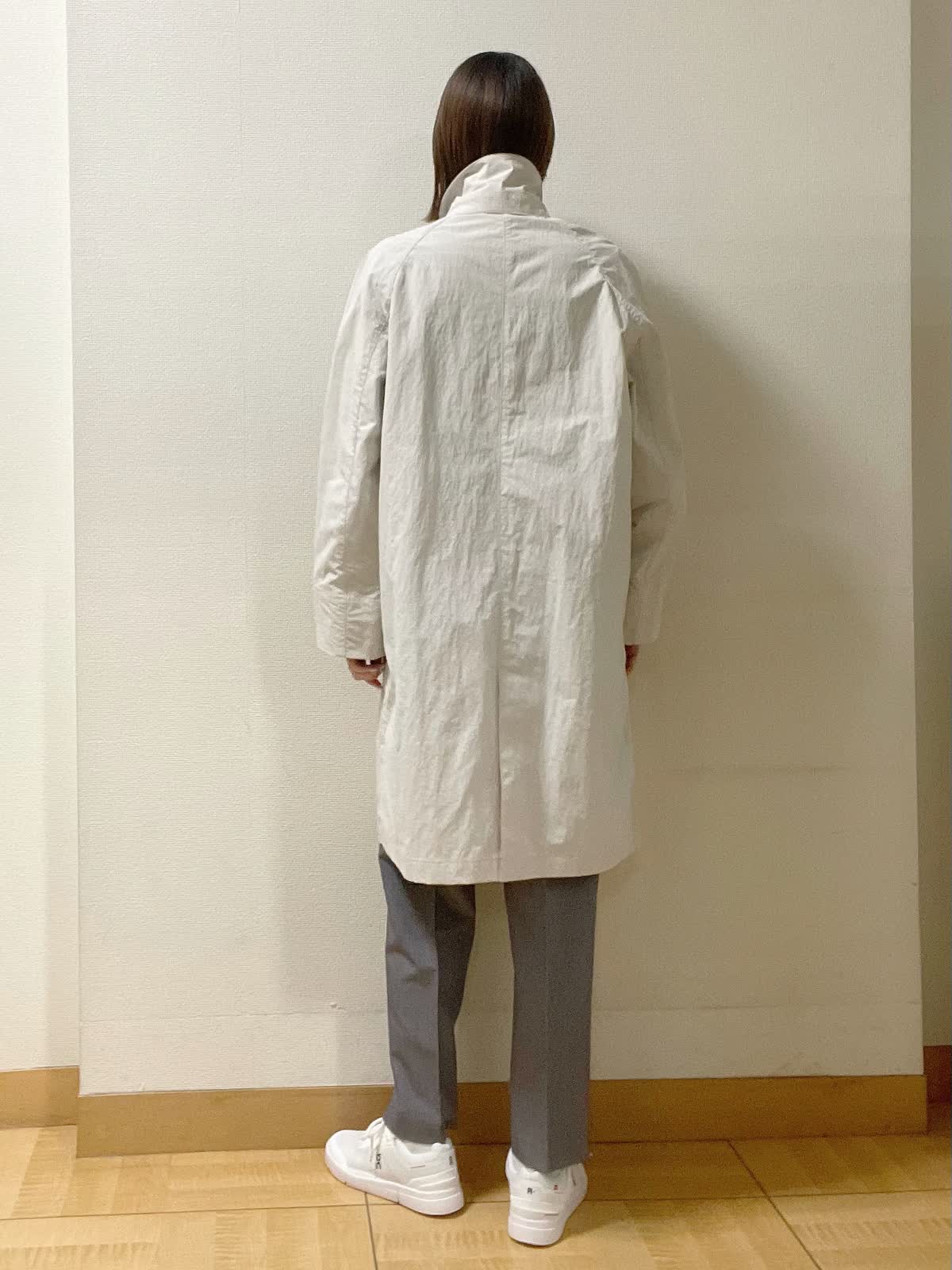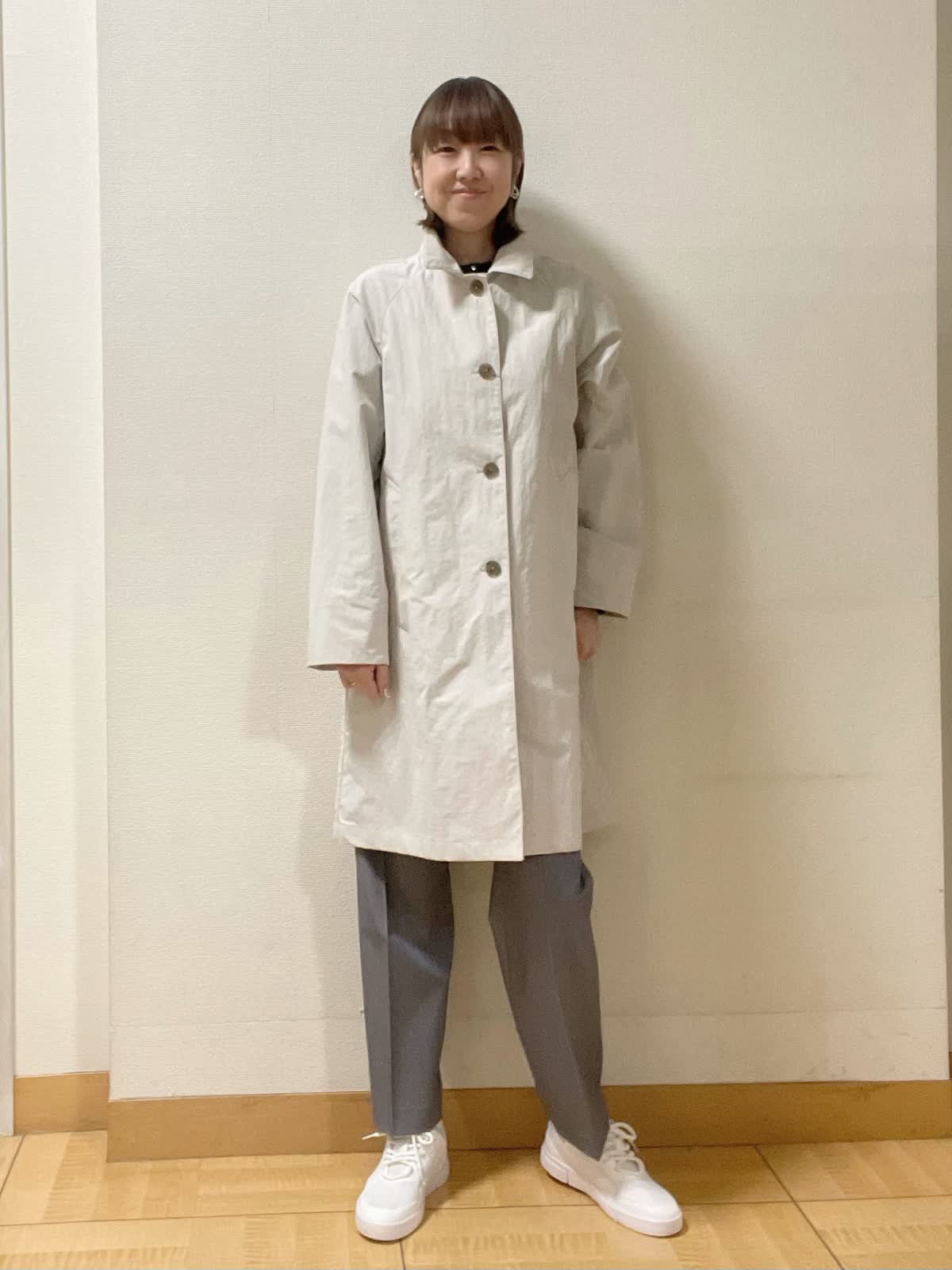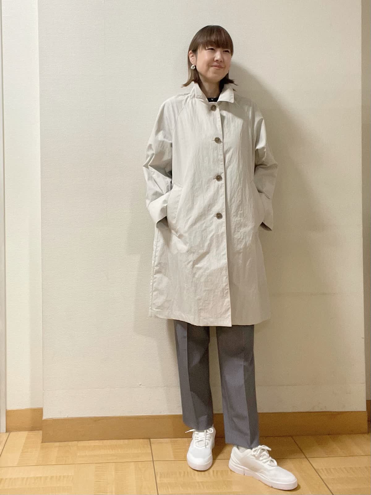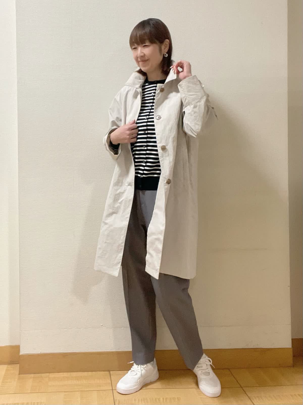 【着用サイズ】コート:フリー アンサンブル、パンツ共に9号 スニーカー:24【着用カラー】コート:アイボリー アンサンブル:ボーダー パンツ:モクグレー シューズ:オフホワイトベーシックでサッと羽織るだけでスタイリングが決まるステンカラーコート。インナーはボーダー柄、足元はスニーカーにしてスポーティお出かけスタイルに。