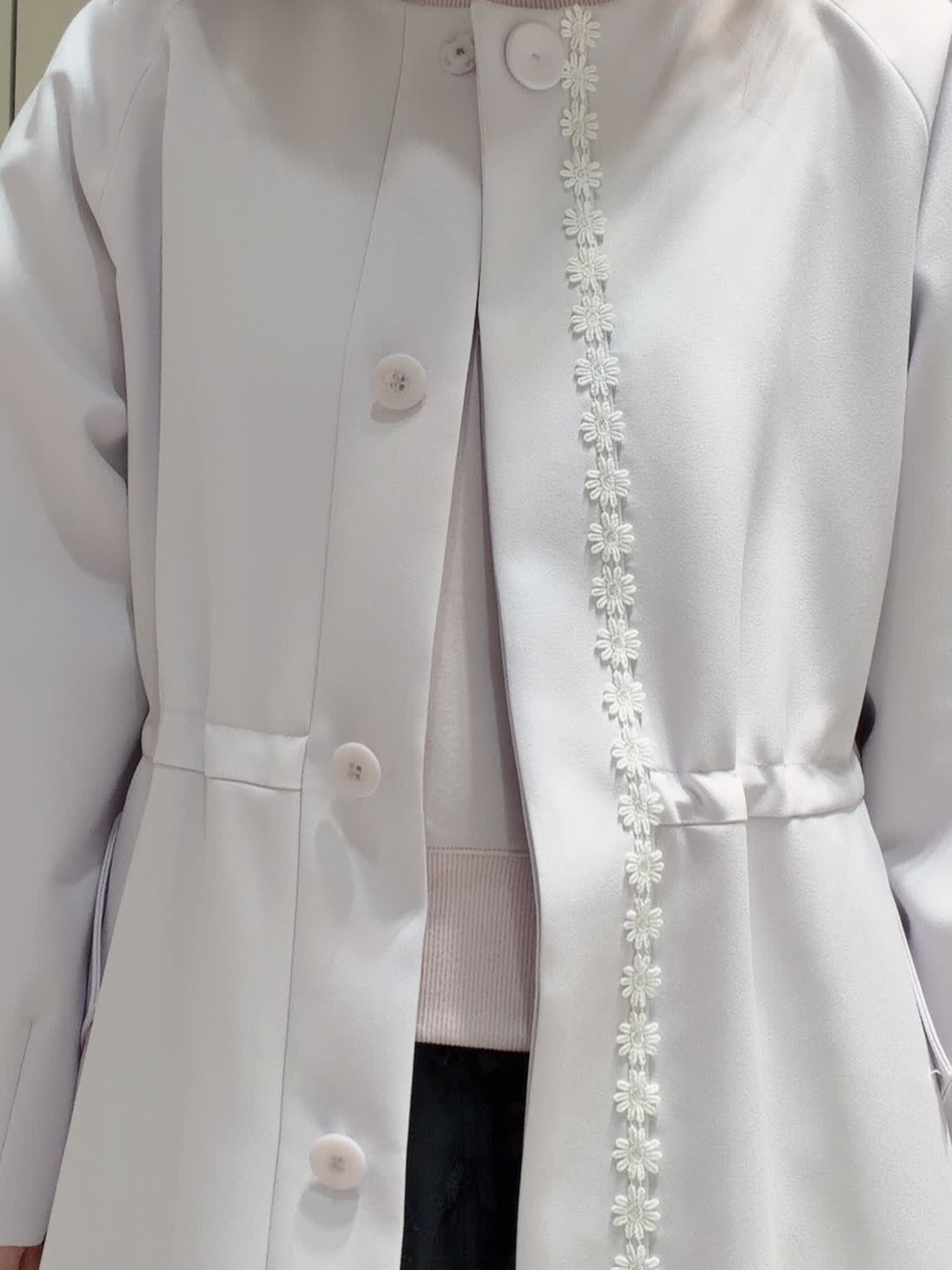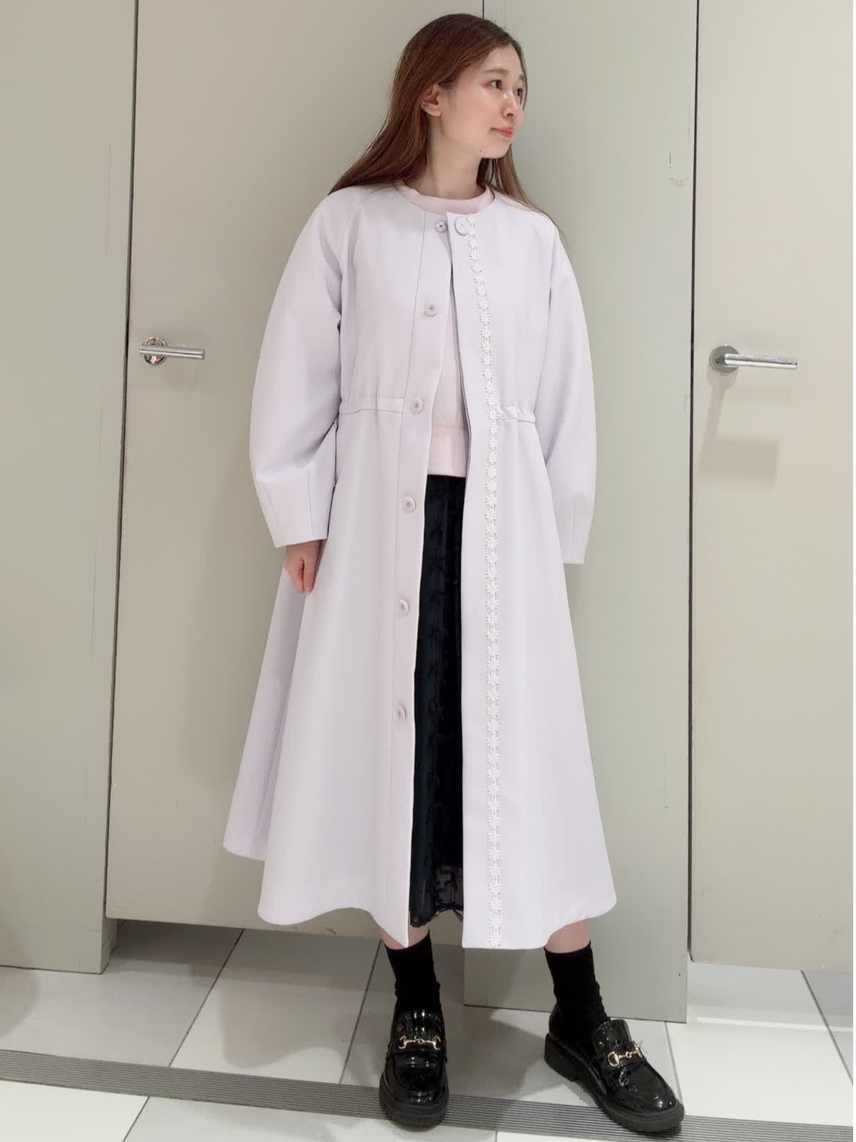 【着用サイズ】コート:9号 カットソー:9号 スカート:5号 【着用カラー】コート:ラベンダー カットソー:ラベンダー スカート:ネイビー 春のお出かけコーディネート。白の刺繍にラベンダーが華やかなおすすめコート。全体的にゆったりしたシルエットでインナーが外に響かないデザイン。ウエストを絞ったり様々な着方を楽しんで頂けます。