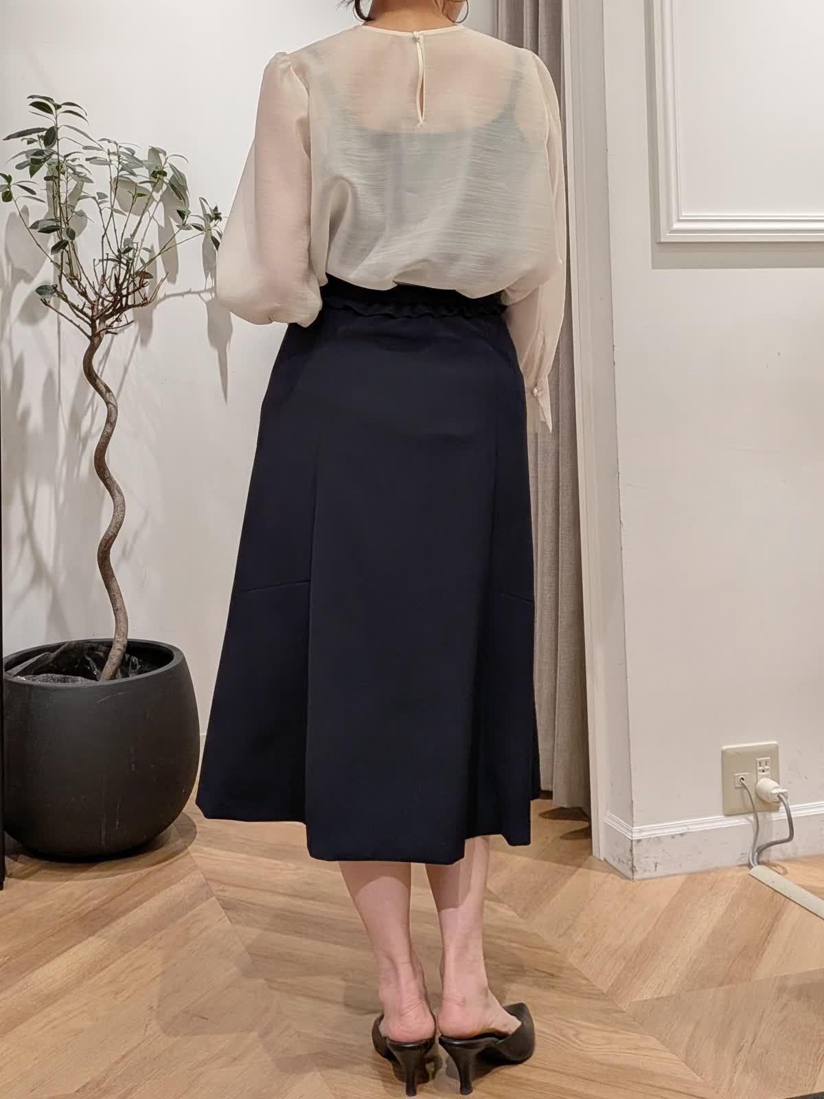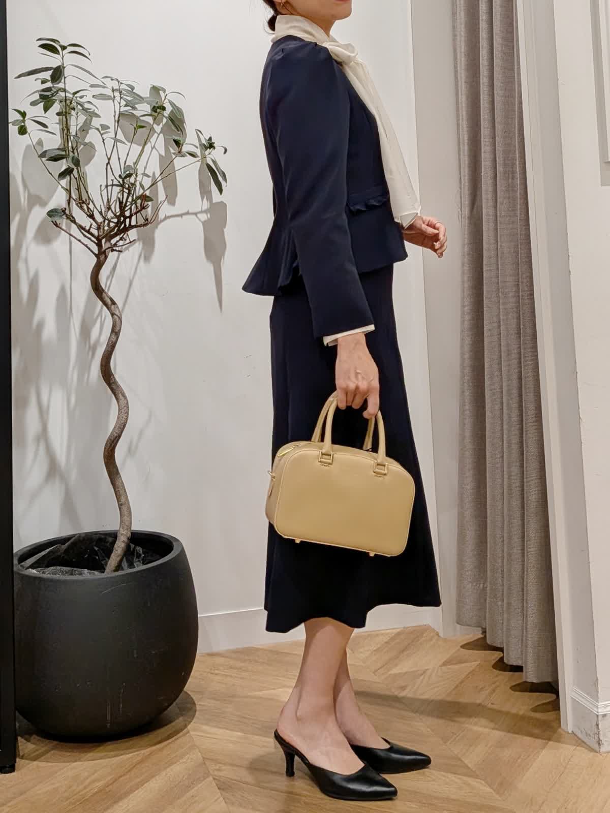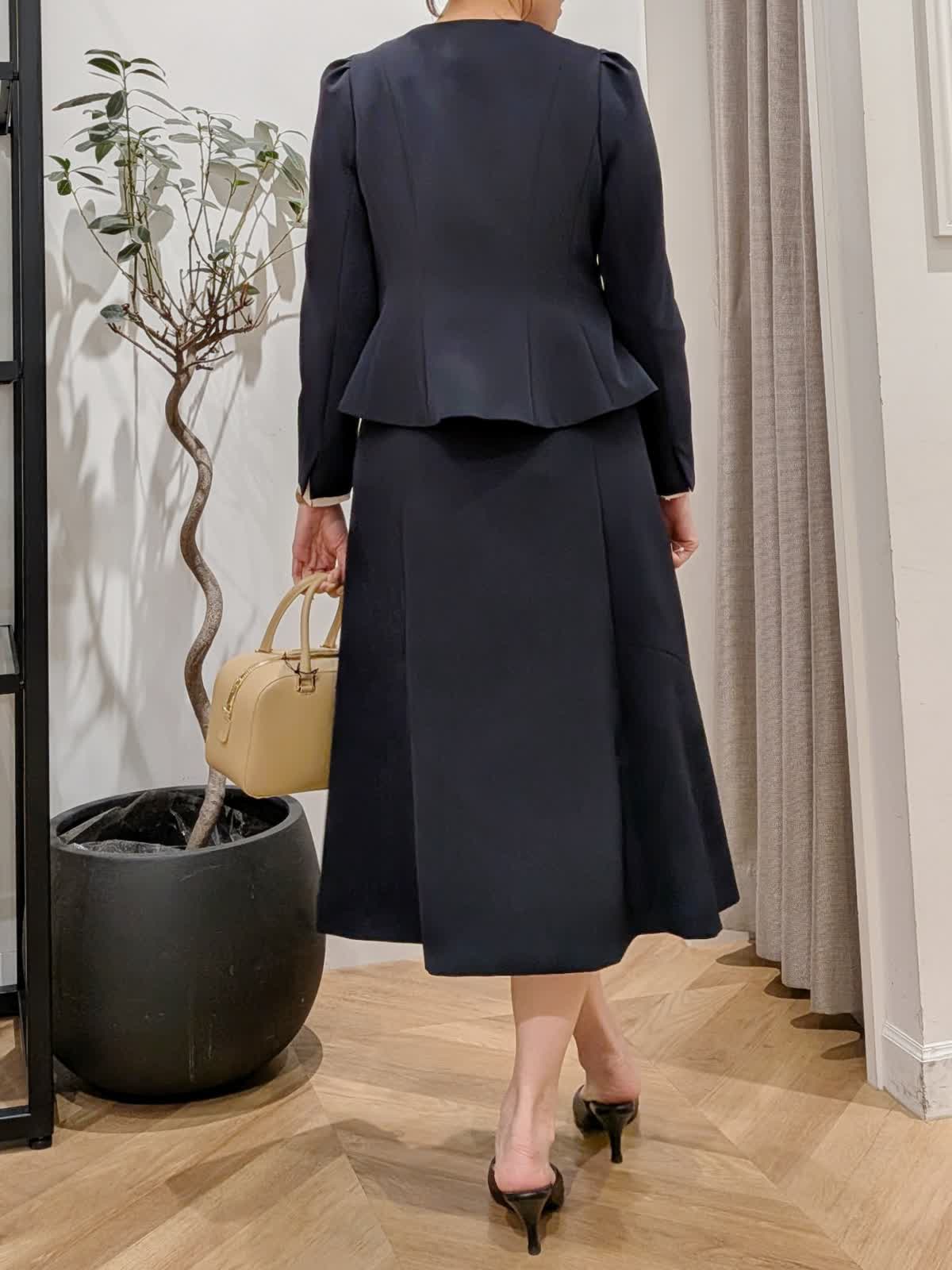 【着用サイズ】ジャケット?ネイビー?7号 スカート?ネイビー?7号 ブラウス?アイボリー?9号 フリルが素敵なセットアップ。定番は持っているし、、いつもと雰囲気変えたい時やセレモニー、フォーマルシーンにもおすすめ。羽織ってもでも素敵ですがパールボタンを止めて一枚着風に着るのもおすすめです。 INEDのリボン取り外しできるシアーブラウスをチョイスしてみました。セレモニーなど華やかな場面では表にリボンを。お時間や面談などはリボンを外してブラウスのでTPOに合わせてコーデをチェンジ。 細見えが叶い、くびれの位置やスカートのデザインに拘ったセットアップです。