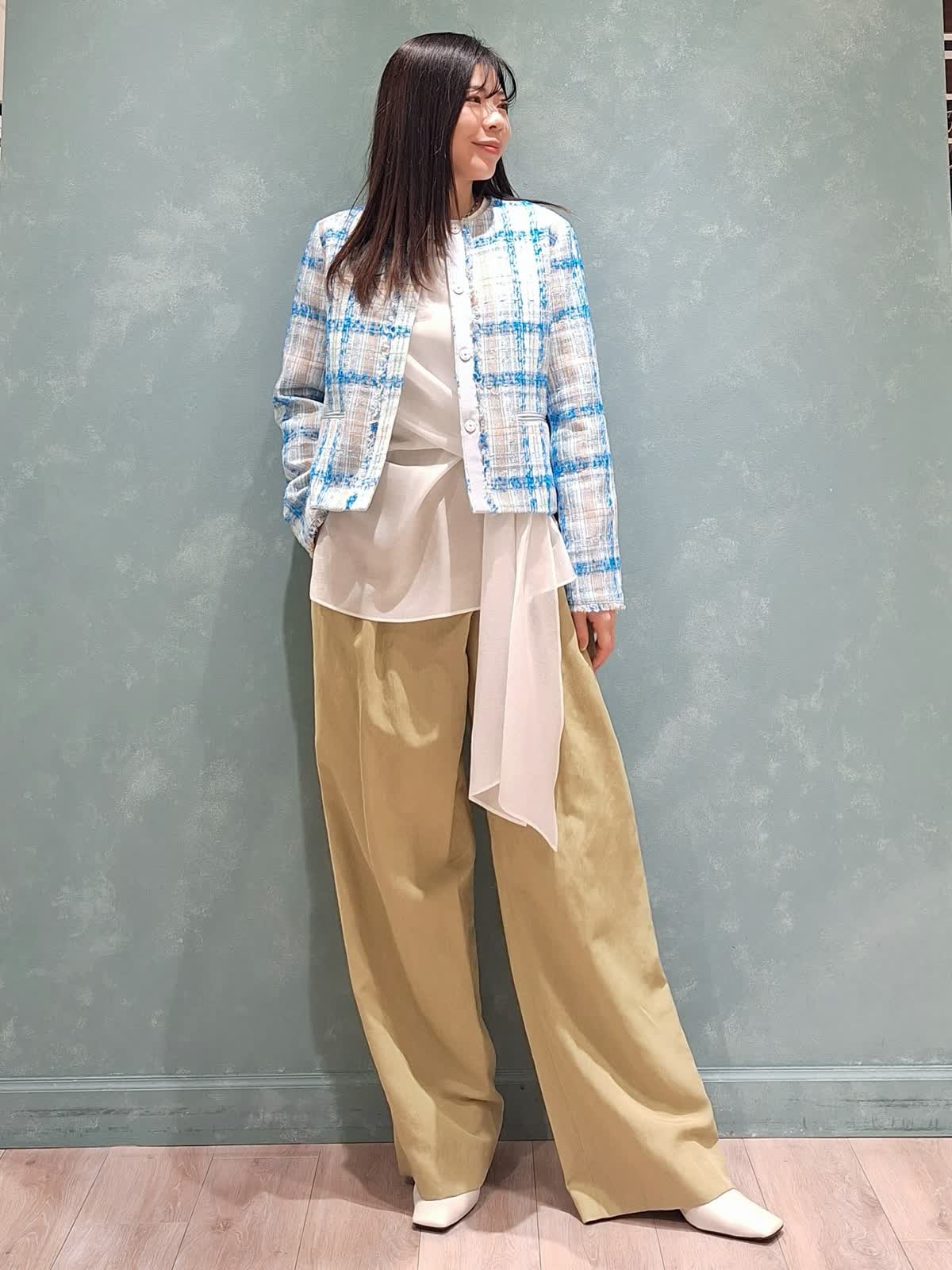 【着用サイズ、カラー】ジャケット:7号、サックス ブラウス:9号、オフホワイト パンツ:9号、キミドリ リントンのツィードジャケットにラヴェイユのブラウス×パンツを合わせたちょっと贅沢な休日スタイル。リントンジャケットはバックに2箇所タックがあり、ブルゾンライクにラフにも着れるデザイン。春らしいブルー、明るくなるお勧めのカラーです!パンツは9号を着用していますが、普段7号の方は7号がお勧めです。ぜひお試し下さいませ☆