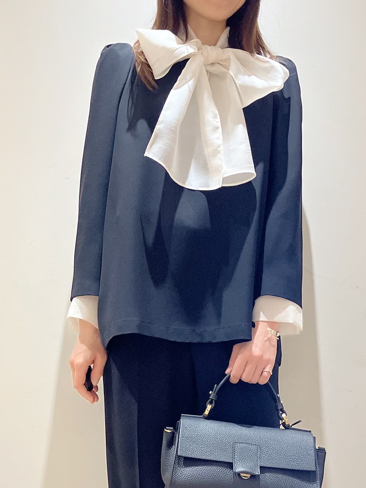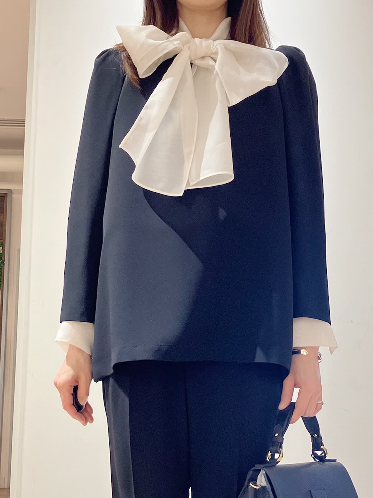 【着用サイズ】ブラウス:9号 ブラウス:9号 パンツ:7号 【着用カラー】ブラウス:ブラック ブラウス:アイボリー パンツ:ブラック コーディネートのテーマはブラウス重ね着のおしゃれセレモニースタイリングです。棒タイ付きのブラウスを重ね着した少し変わったコーディネート。首元の棒タイリボンと袖口のシアー感がアクセントに。肩周りのパフのデザインも華やか。 人と差のつくセレモニースタイルにおすすめです。