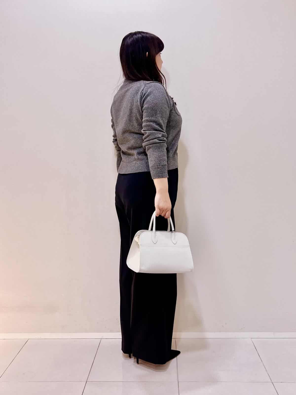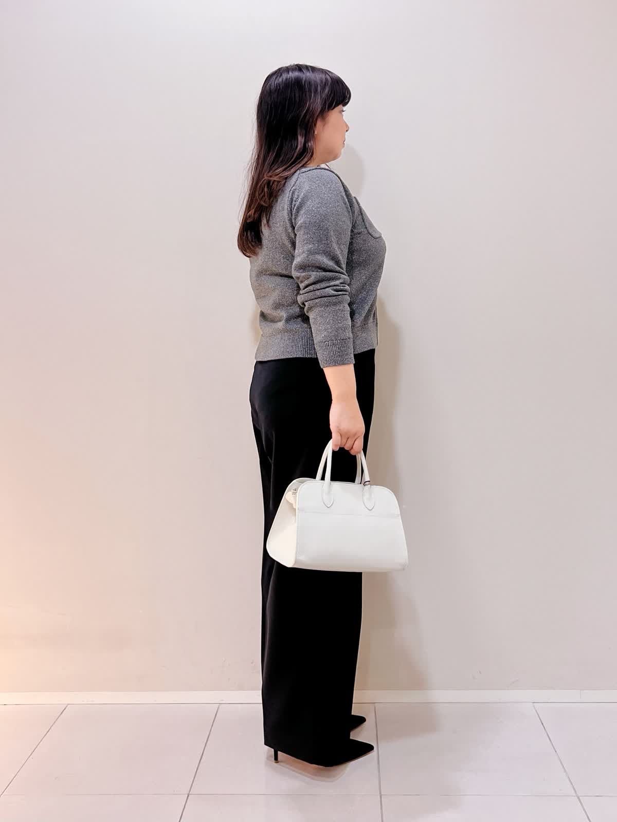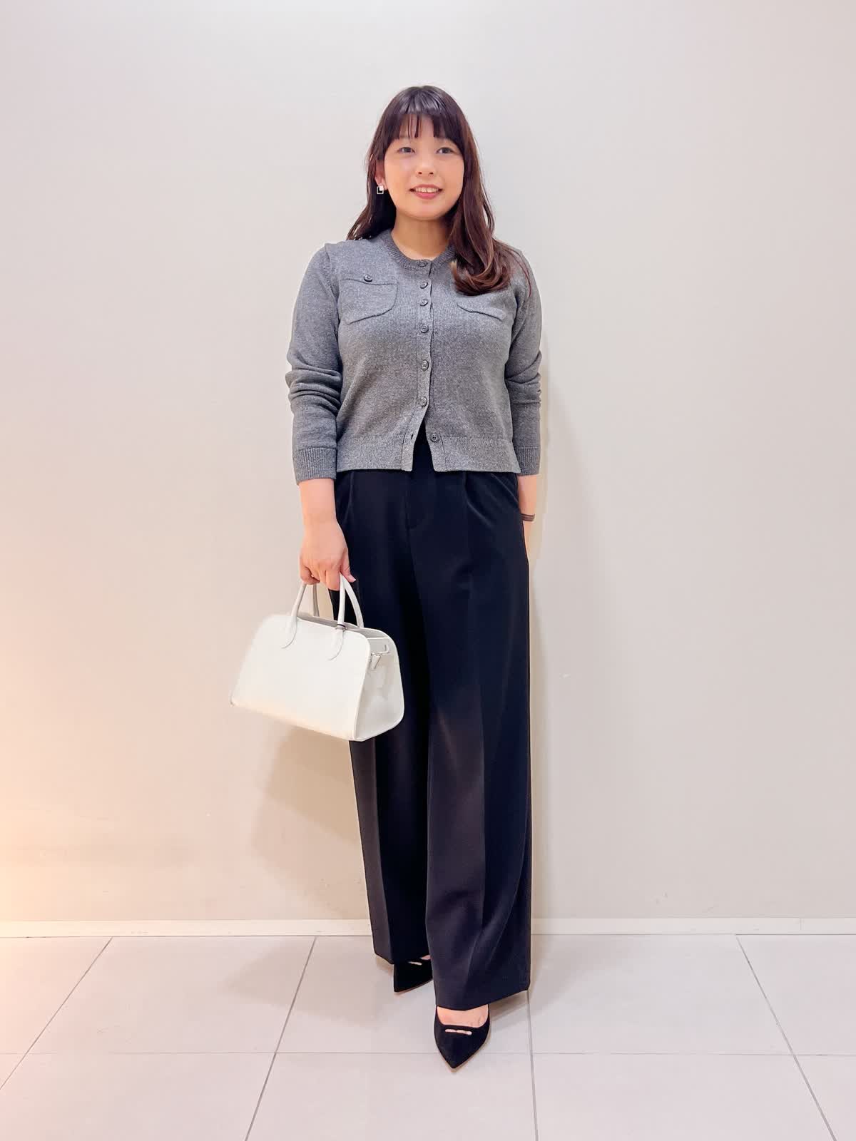 【着用サイズ】カーディガン:フリー パンツ:9号 【着用カラー】カーディガン:ミディアムグレー パンツ:ブラック バッグ:グレー 綺麗めスタイル。 コンパクトなサイズのニットカーディガン。ウールのしなやかさと和紙の適度なハリ感で、さらっとした着心地です。胸ポケットがアクセントとなり、重心高く、綺麗なシルエットが特徴です。通気性に優れ、梅雨時期も含めシーズン長く着用可能。 ワンタックのワイドストレートパンツはストンと落ち感のある素材で、様々なスタイリングともコーディネートしやすい一着。ウエストは後ろゴムでストレッチのある素材なのでストレス無く着用できるので、お仕事にもお勧めです。