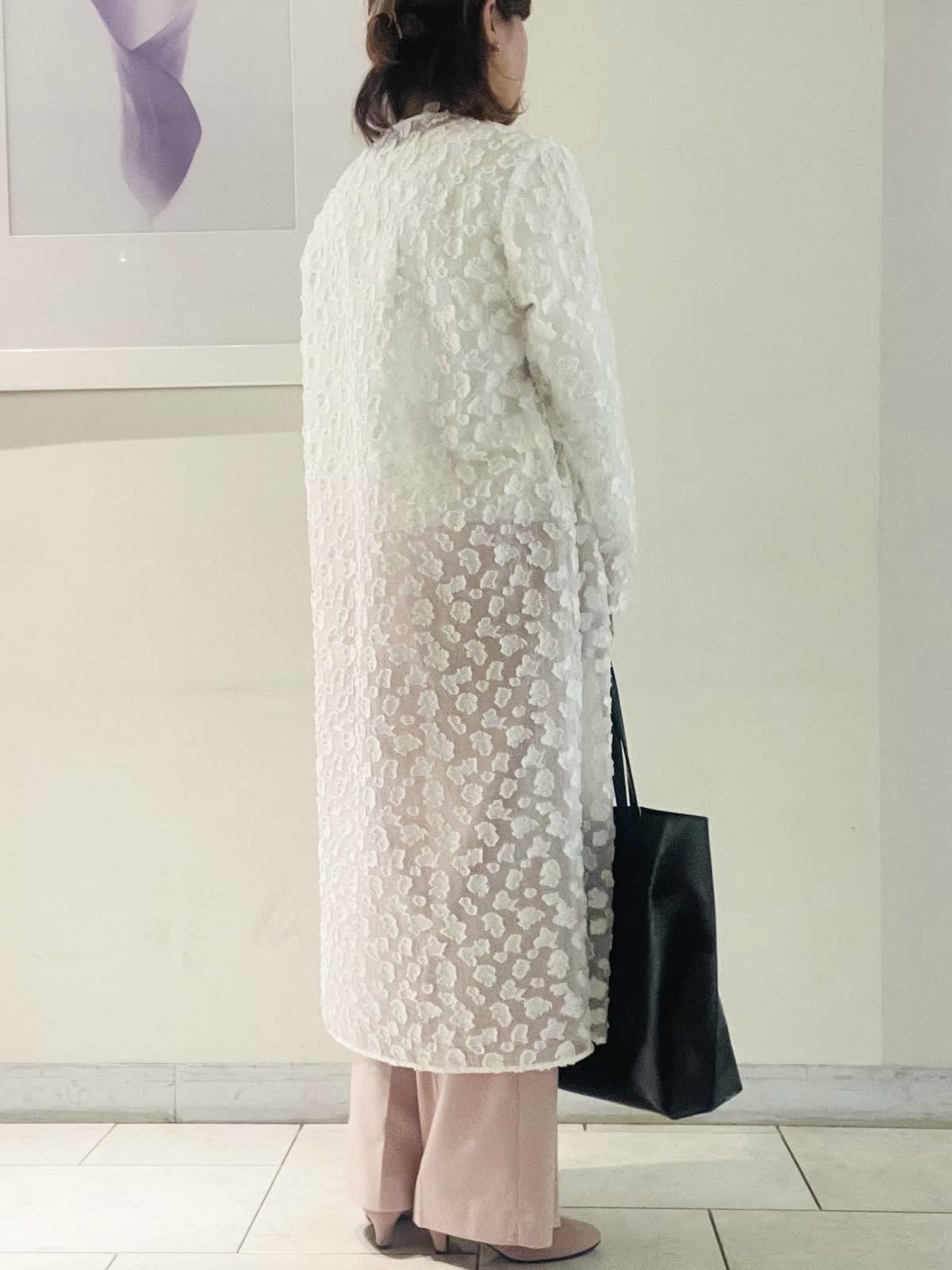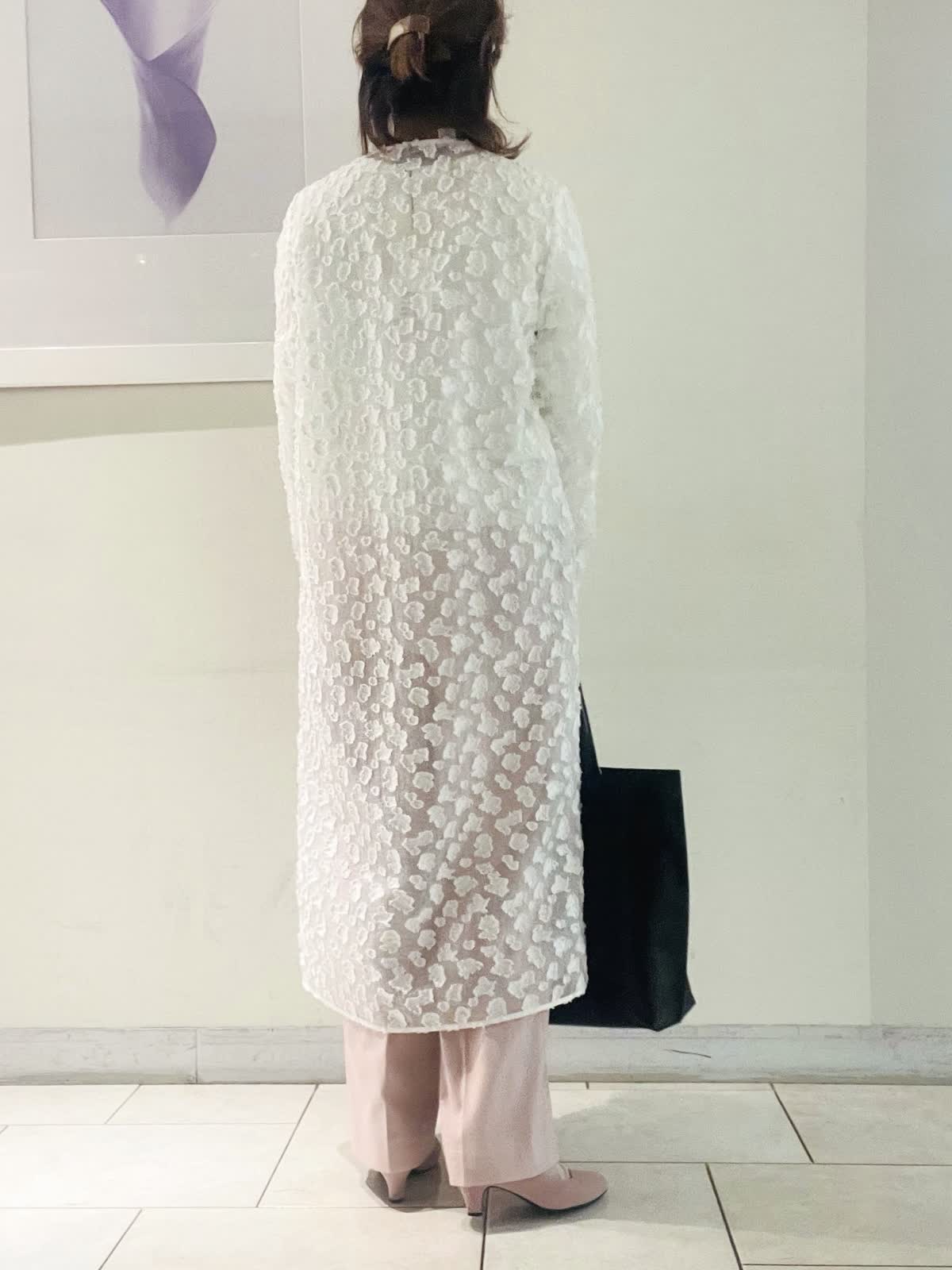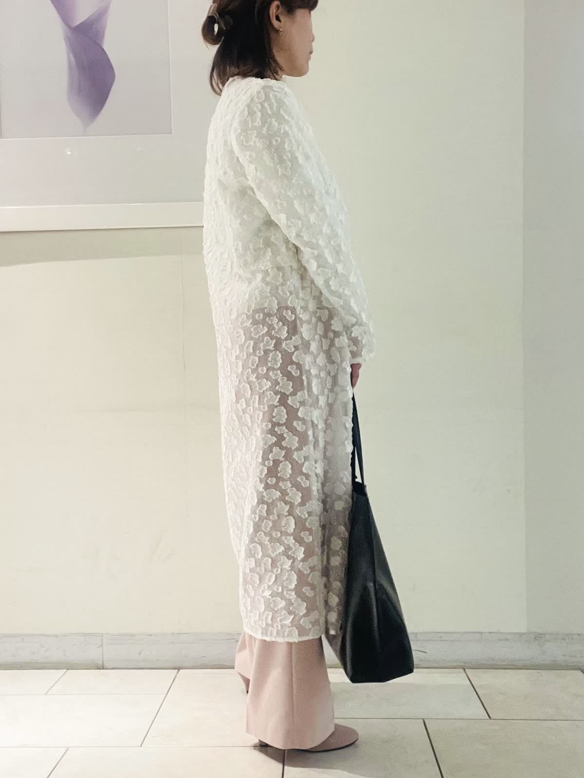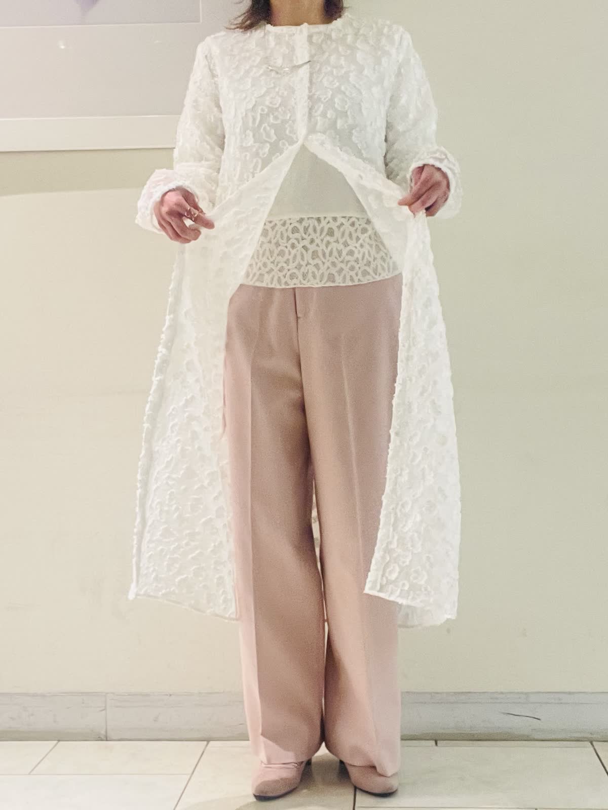 【着用カラー/サイズ】ワンピースホワイト:9号サイズ インナーアイボリー:9号サイズ パンツピンク:9号サイズ 春夏羽織りとしてもワンピースとしても楽しめそうなジャガードワンピース。おしゃれ着洗いできるところが嬉しいポイント。シワも気にせず、ジレ合わせもおすすめ◎。 桜カラーパンツ合わせで春コーデ。