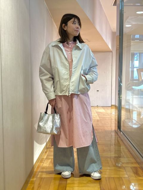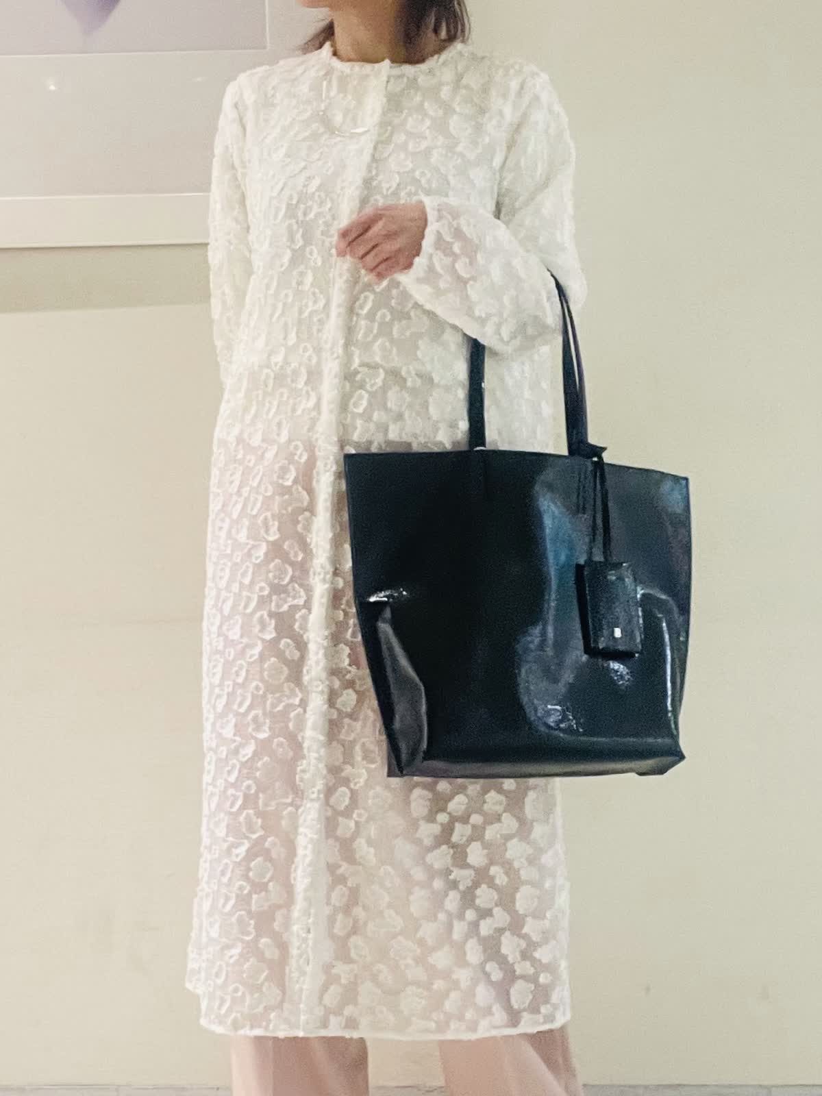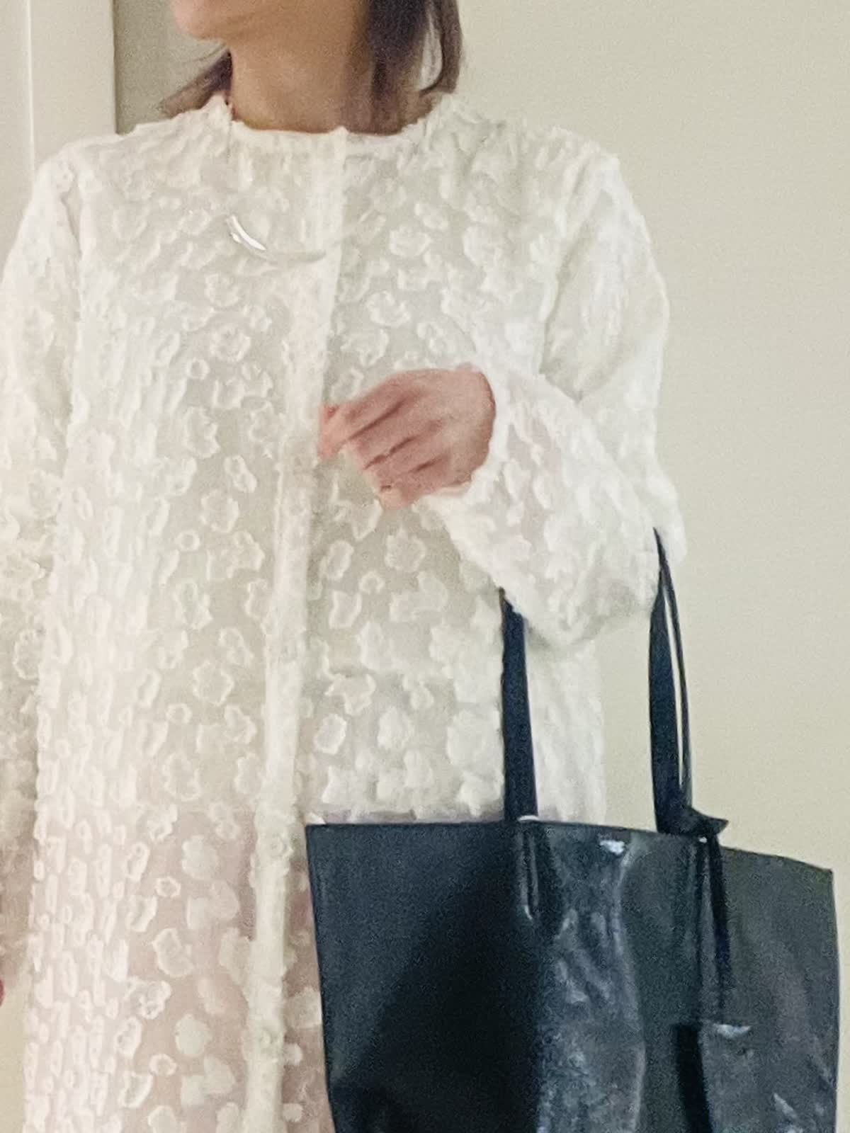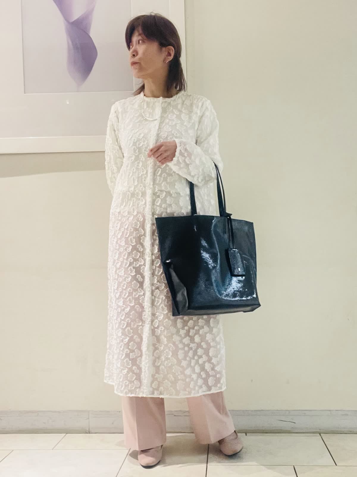 【着用カラー/サイズ】ワンピースホワイト:9号サイズ インナーアイボリー:9号サイズ パンツピンク:9号サイズ 春夏羽織りとしてもワンピースとしても楽しめそうなジャガードワンピース。おしゃれ着洗いできるところが嬉しいポイント。シワも気にせず、ジレ合わせもおすすめ◎。 桜カラーパンツ合わせで春コーデ。