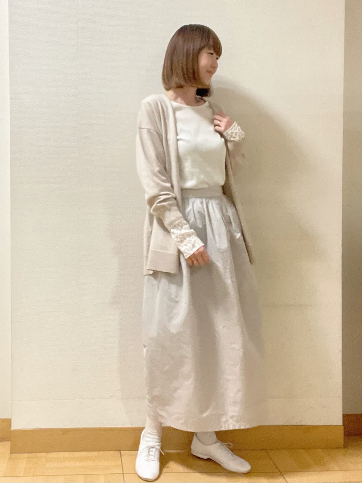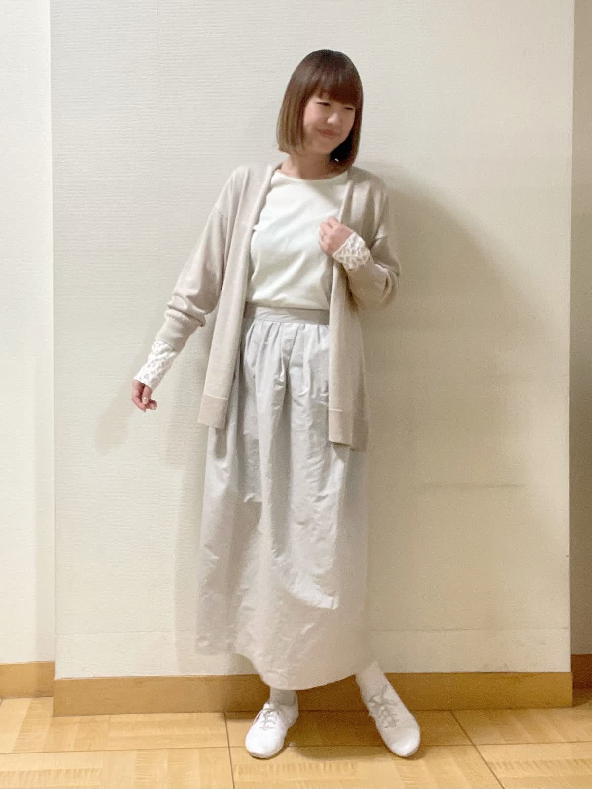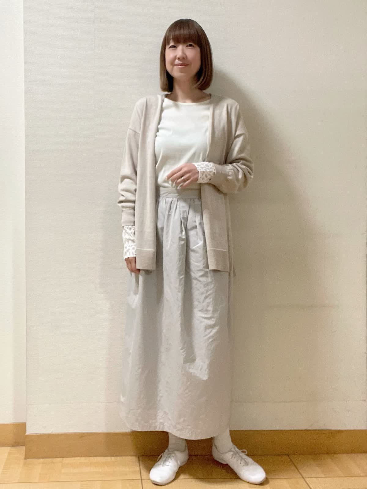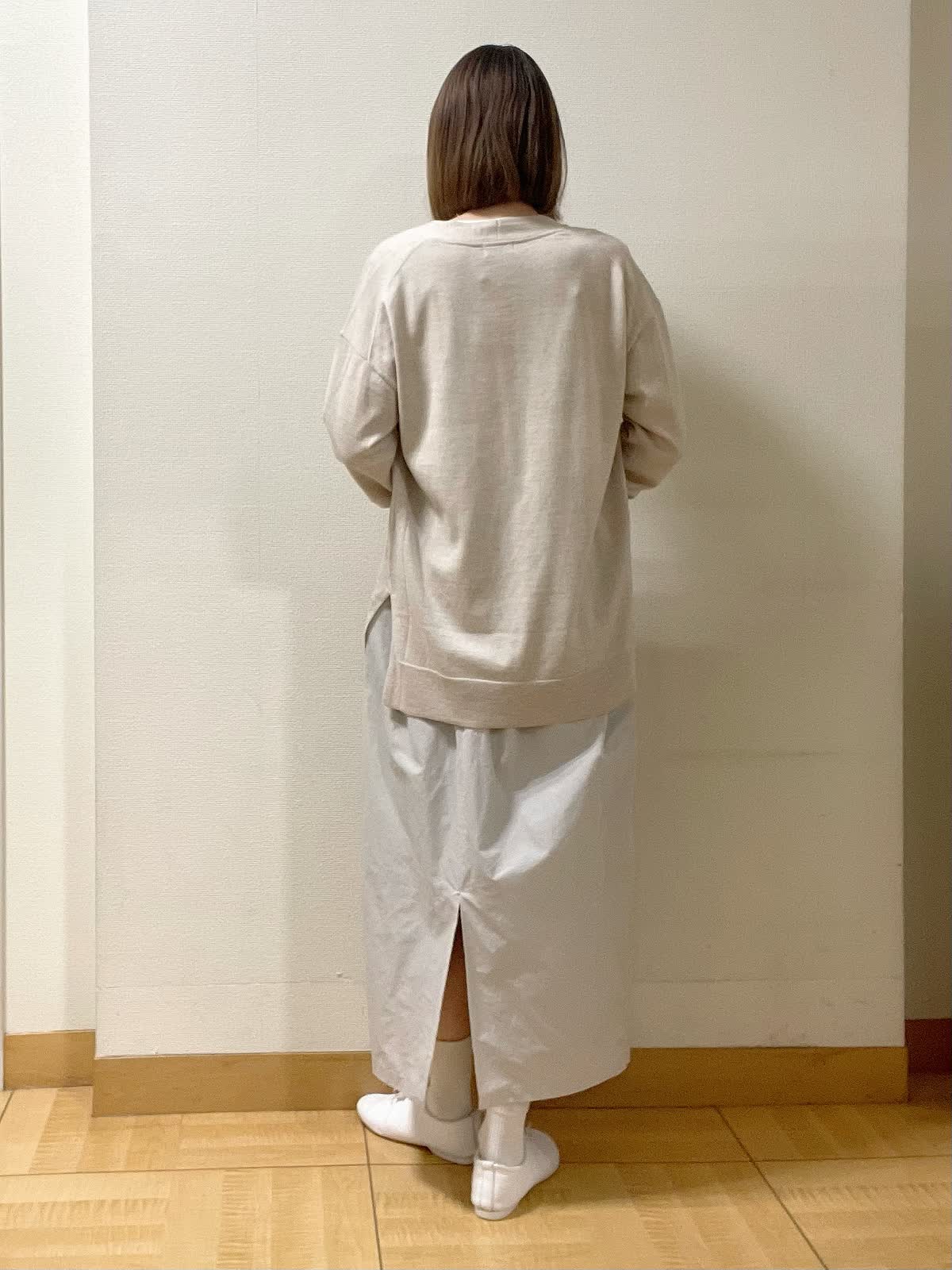 【着用サイズ】カーディガン:フリーカットソー、スカート共に9号【着用カラー】カーディガン:ベージュ カットソー:オフホワイト スカート:グレー 休日スタイル ヒップを丸々隠す着丈の着流しカーディガン。両サイドにスリット入りなのでロングスカートにもバランス良くておすすめ。