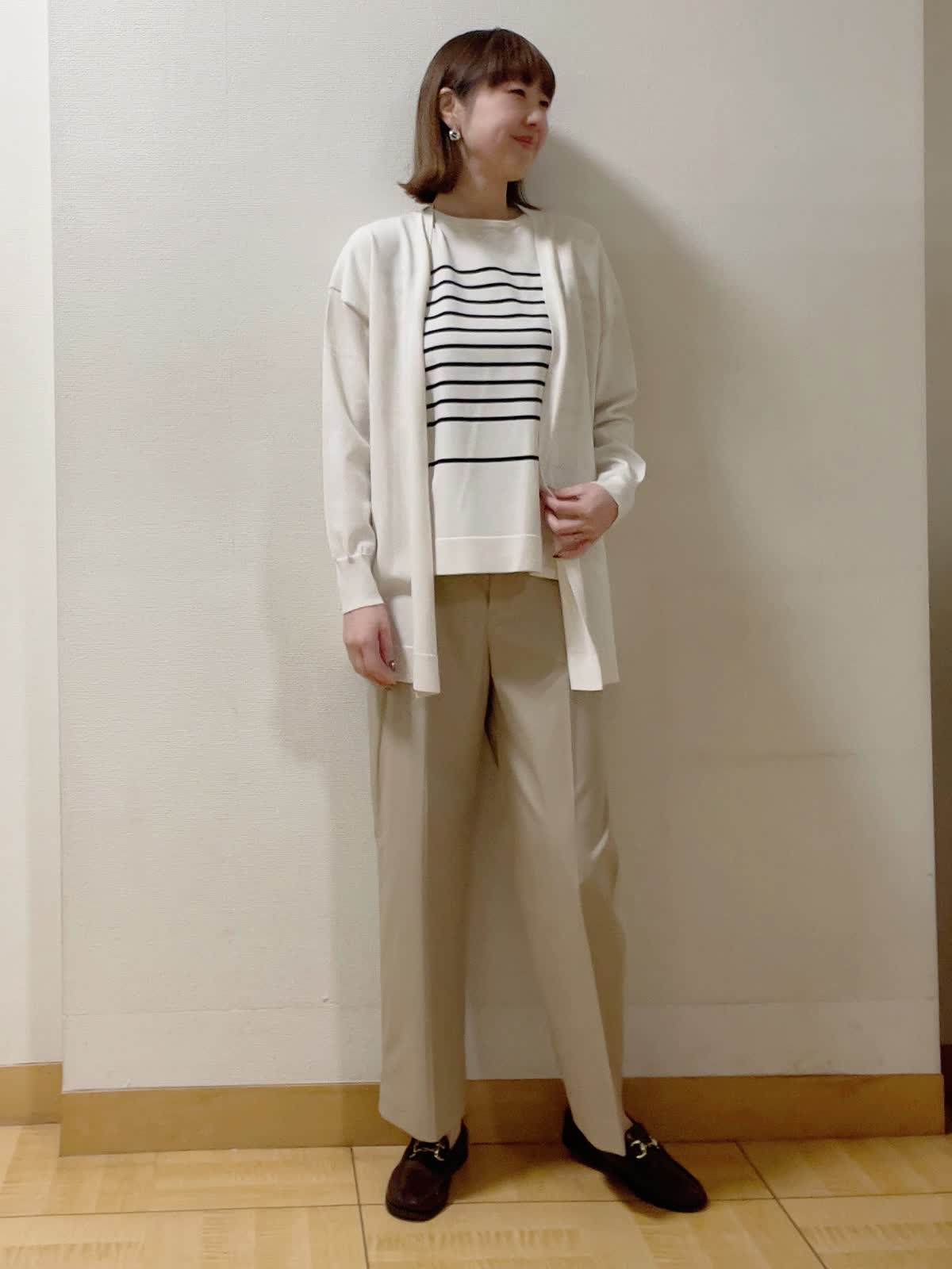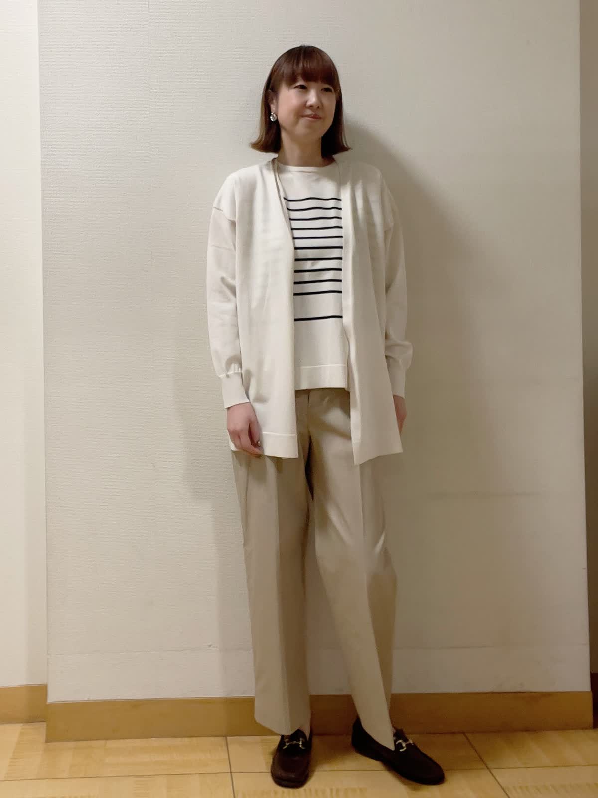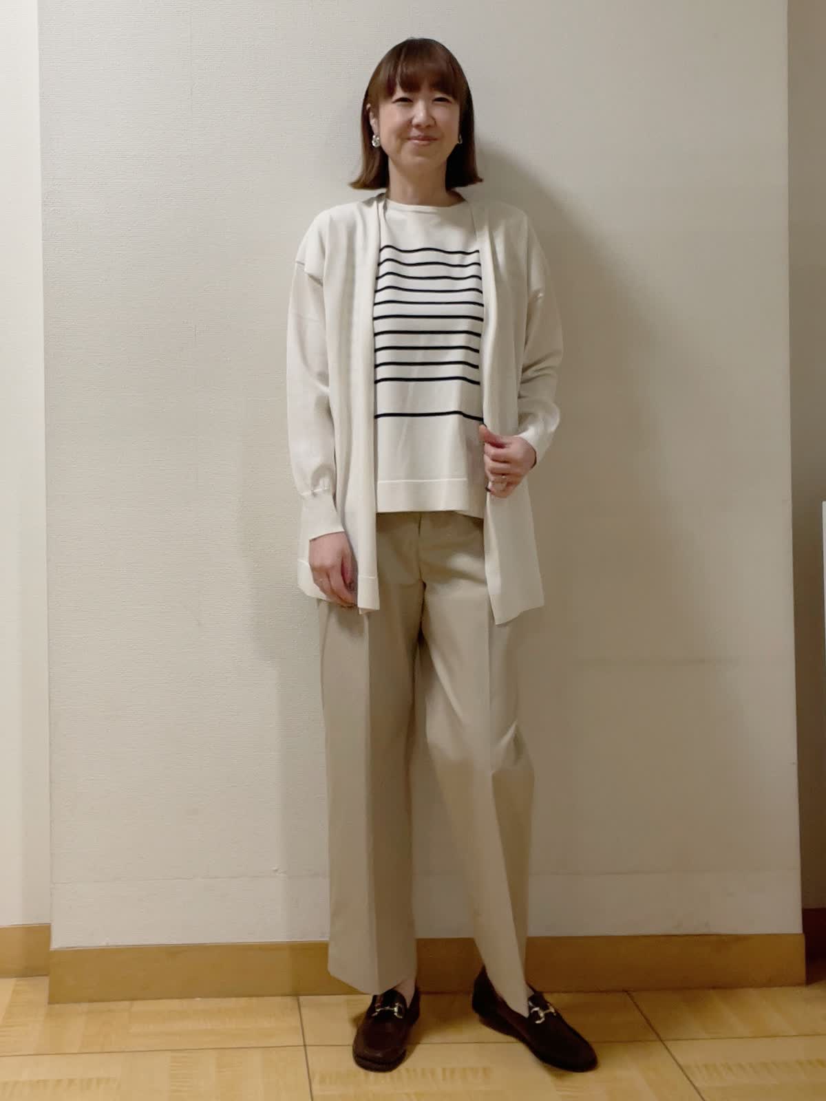 【着用サイズ】共に9号【着用カラー】アンサンブル:グレーベージュ パンツ:キャメル インナーがボーダー柄のアンサンブルニット。チノパン合わせで安心のオフィススタイルに。
