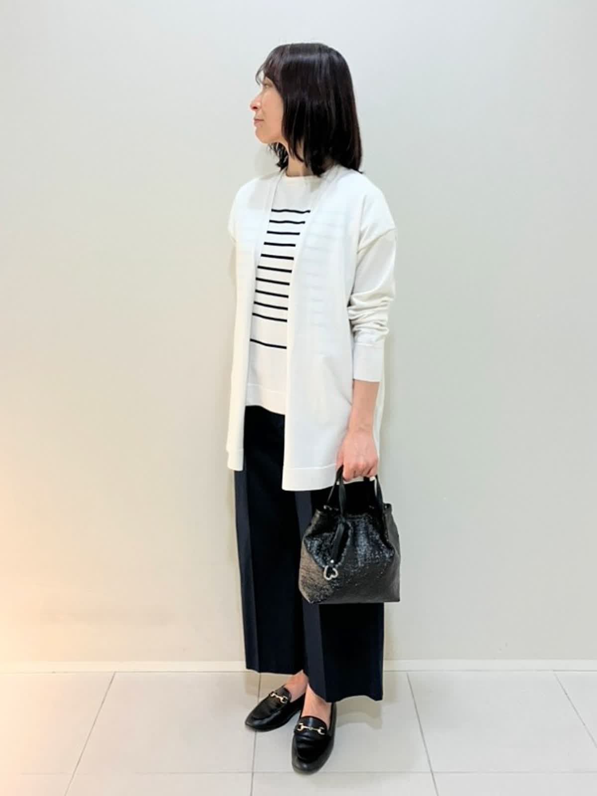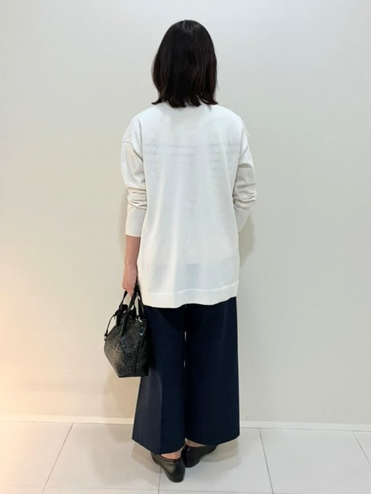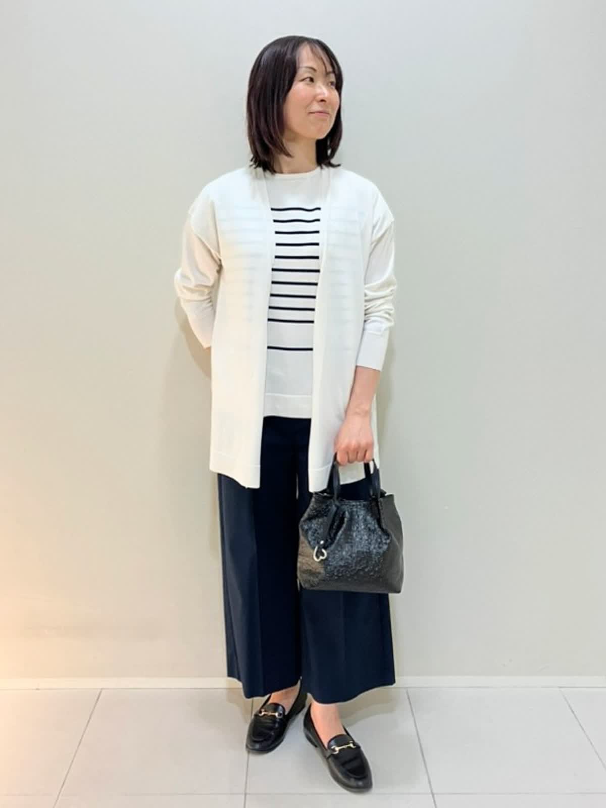 【着用サイズ】アンサンブル:9号 パンツ:7号【着用カラー】 アンサンブル:グレーベージュ パンツ:ネイビー 春のパンツスタイル ロングカーディガンは、清涼感のある肌触りで着丈は長すぎず、気軽に羽織っていただけます。インナーは肩が隠れるデザインで1枚着もしやすいです。パンツは適度なワイド感で、クロップド丈なので、足元がスッキリと見えます。