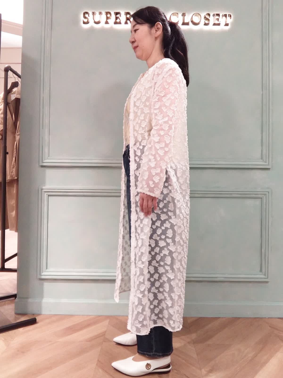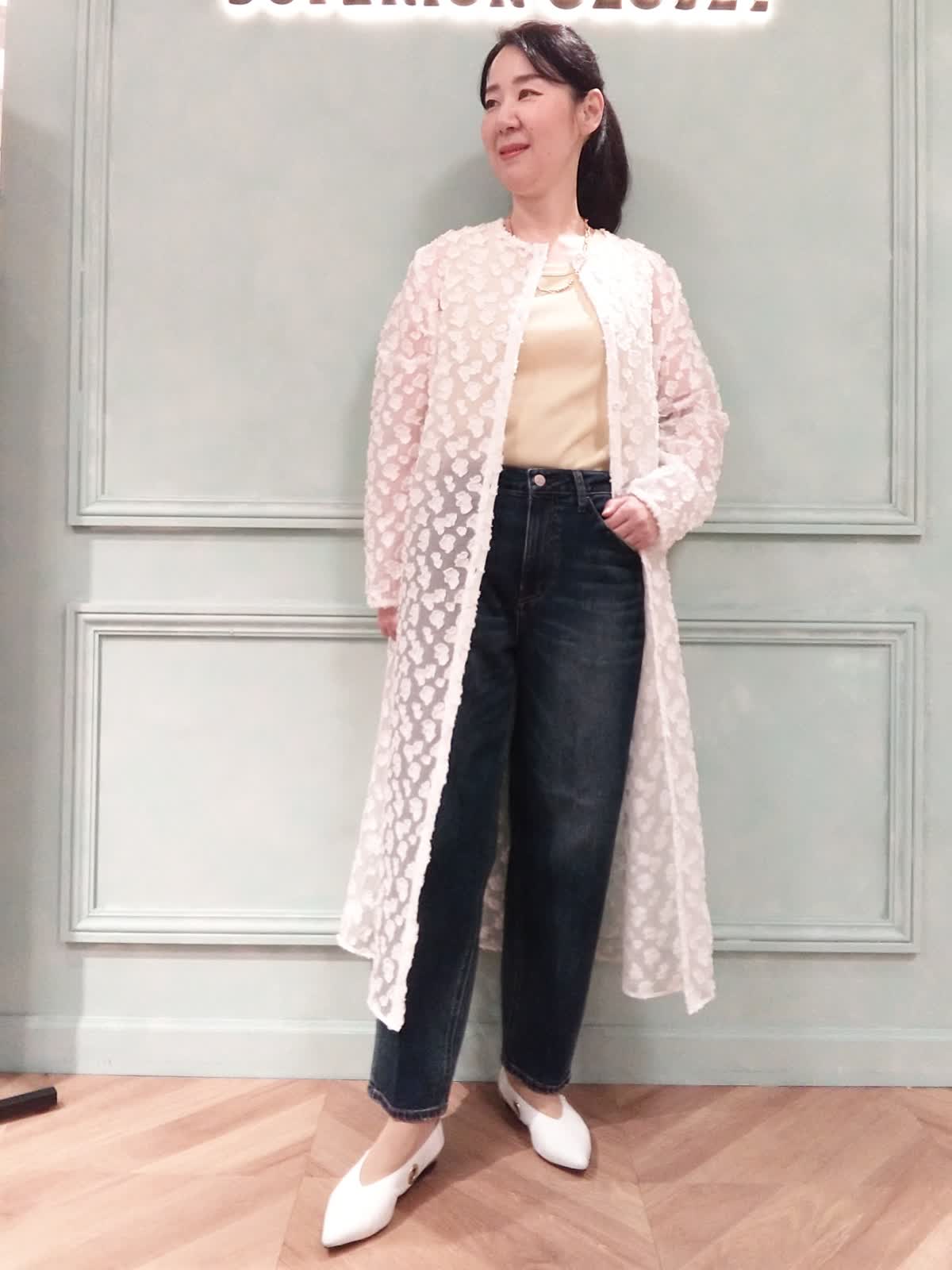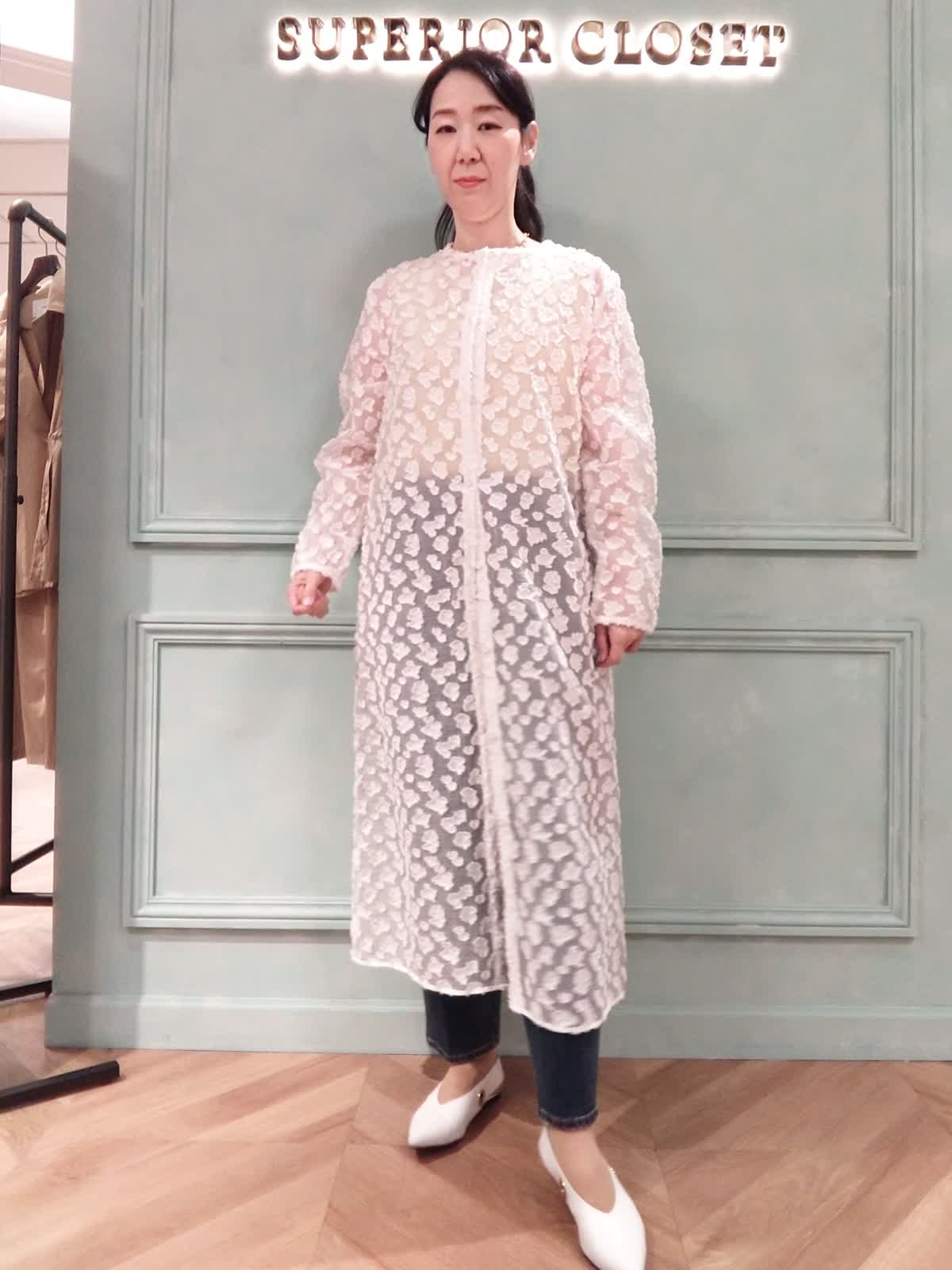 【着用サイズ】ワンピース:9号、カットソー:9号、パンツ:9号 【着用カラー】ワンピース:ホワイト、カットソー:イエロー、パンツ:インディゴ シアーワンピースとデニムの甘辛ミックスコーディネート。トレンドのシアーワンピースはフェミニンな白にシャープなデニムでコーディネート。インナーは春カラーのイエローで透け感を楽しめます。甘くなりすぎず、気軽に羽織れてオシャレを楽しめるオススメアイテムです。