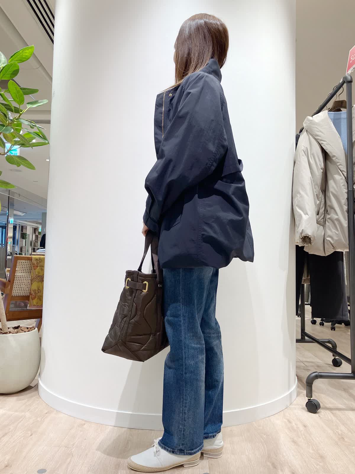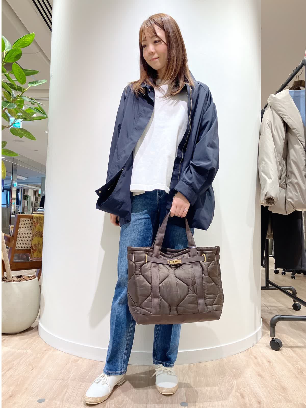 【着用サイズ】コート:9号 ニット:9号 パンツ:7号 【着用カラー】コート:ネイビー ニット:オフホワイト パンツ:インディゴ コーディネートのテーマは春の旅行スタイリングです。 ナイロン素材のコートは、適度な張り感があり、裾をスナップボタンで止めて、バルーンっぽく立体感を持たせて着るのもおしゃれ。花粉などもすぐはらえるので、今からの時期にぜひおすすめしたい1枚です。デニムと合わせて、旅行などアクティブなシーンにも。