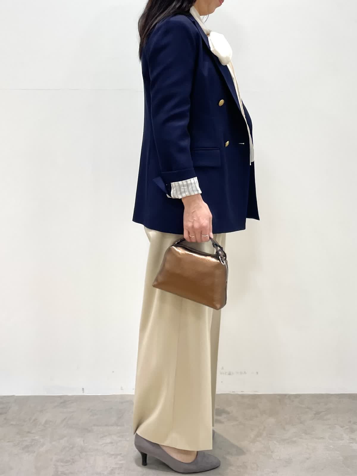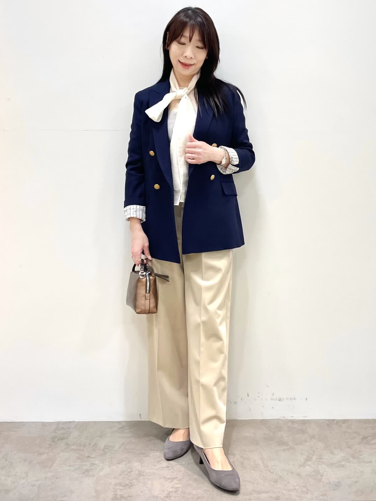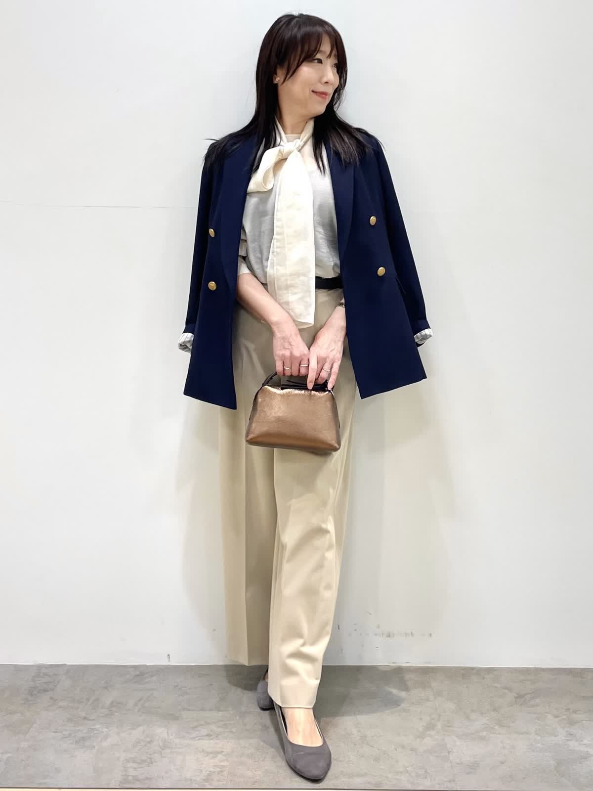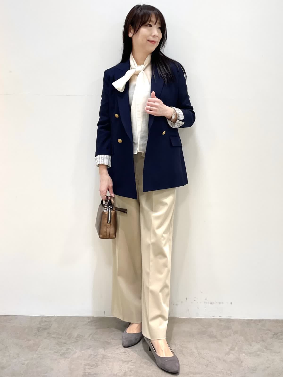 【着用サイズ】全て9号 【着用カラー】ジャケット: ネイビー ブラウス:アイボリー パンツ:ベージュ 春の通勤スタイル。定番ダブルブレストジャケットはオンオフ使える優秀アイテム。ネイビーは金ボタンがアクセントに。パンツはリラックス感のあるセミワイドシルエット。ウエストゴム仕様でストレスフリーな穿き心地です。
