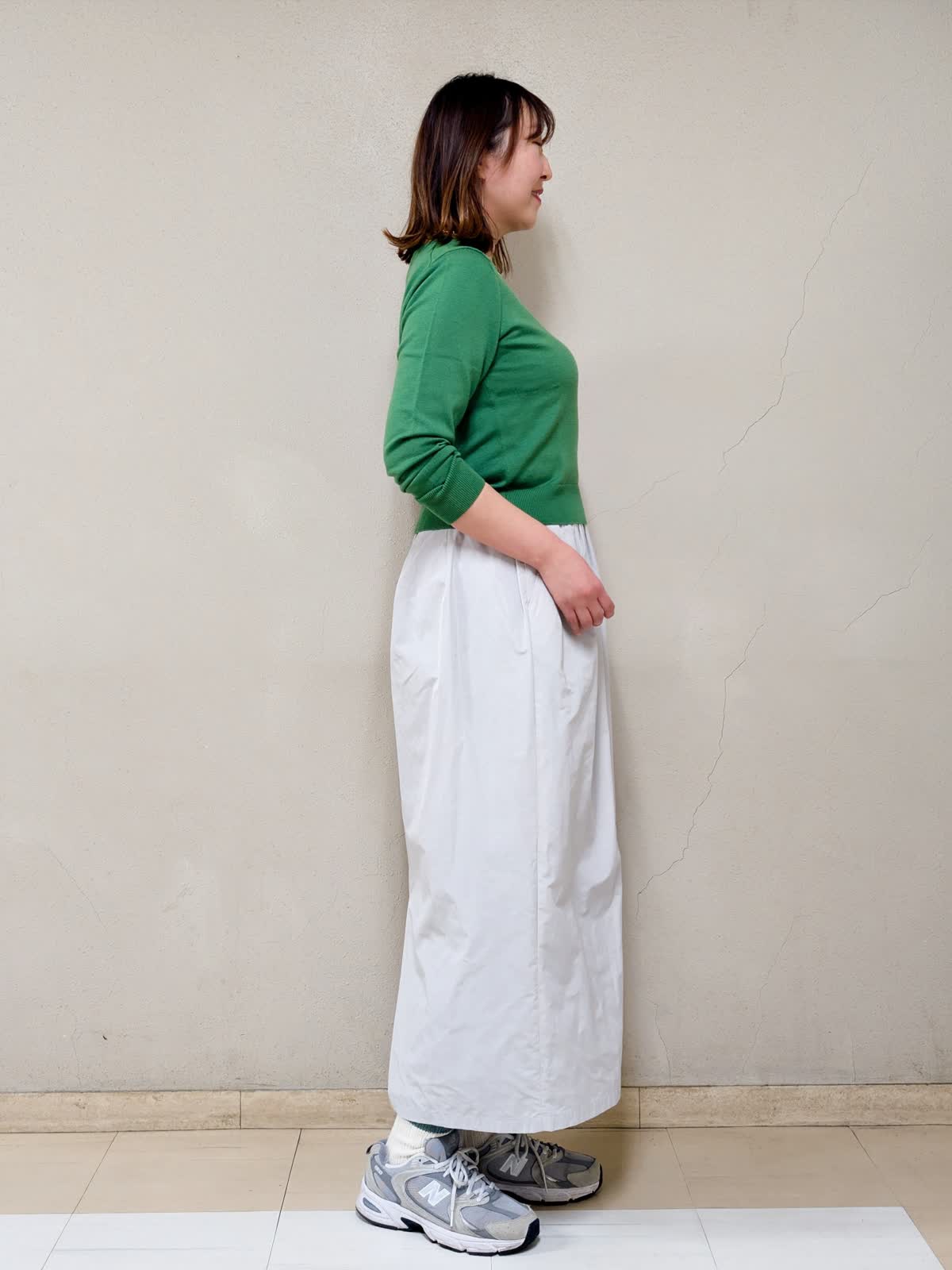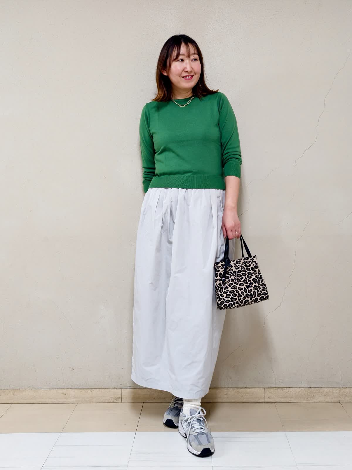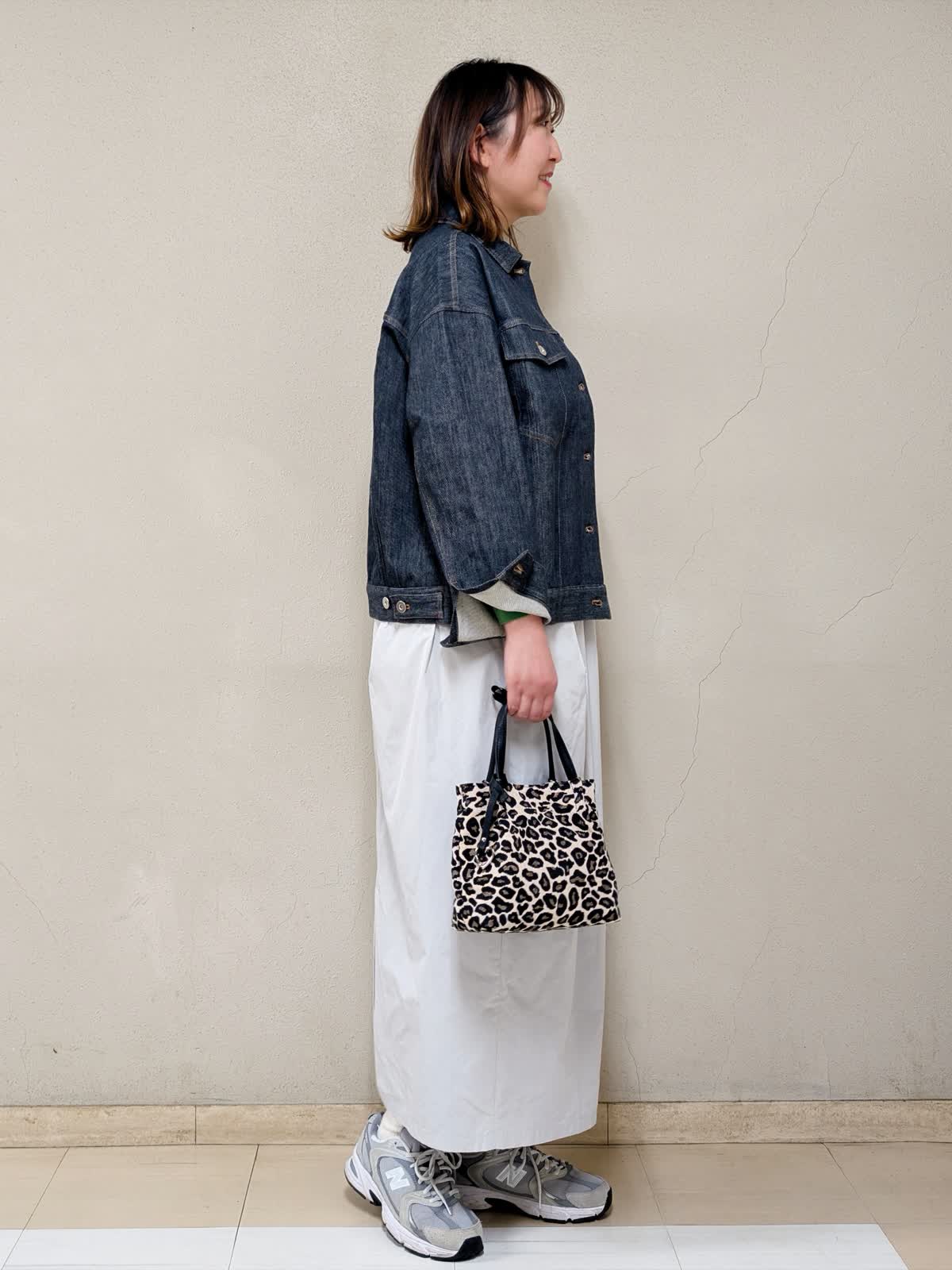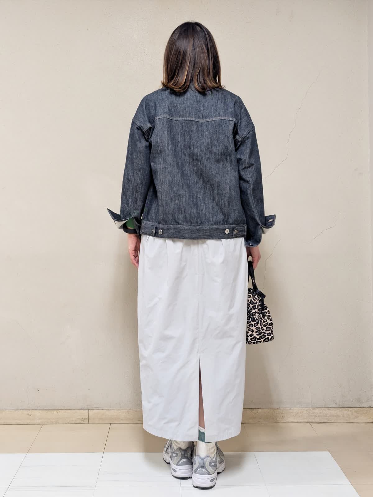 【着用サイズ】デニムジャケット:フリー ニット:9 号 スカート:11号【着用カラー】デニムジャケット:インディゴ ニット:グリーン スカート:グレー 春のお出掛けコーディネートです。ゆったりしたシルエットのデニムジャケットは着心地◎。見た目より柔らかい生地で、気軽に羽織れます。インナーには差し色でグリーンのニットを合わせました。ウール100%ながらも薄手でサラッとしているので、長く着ていただけます。コクーンスカートを合わせて女性らしい雰囲気にしました。