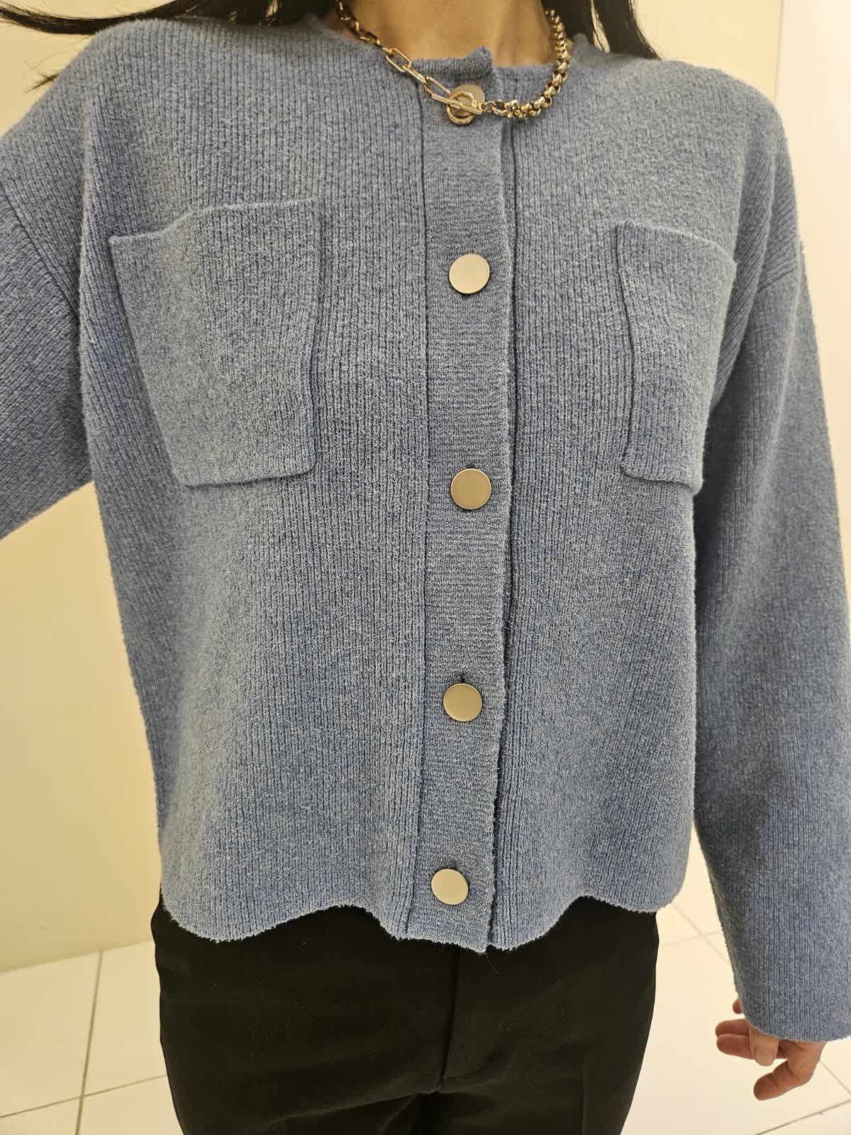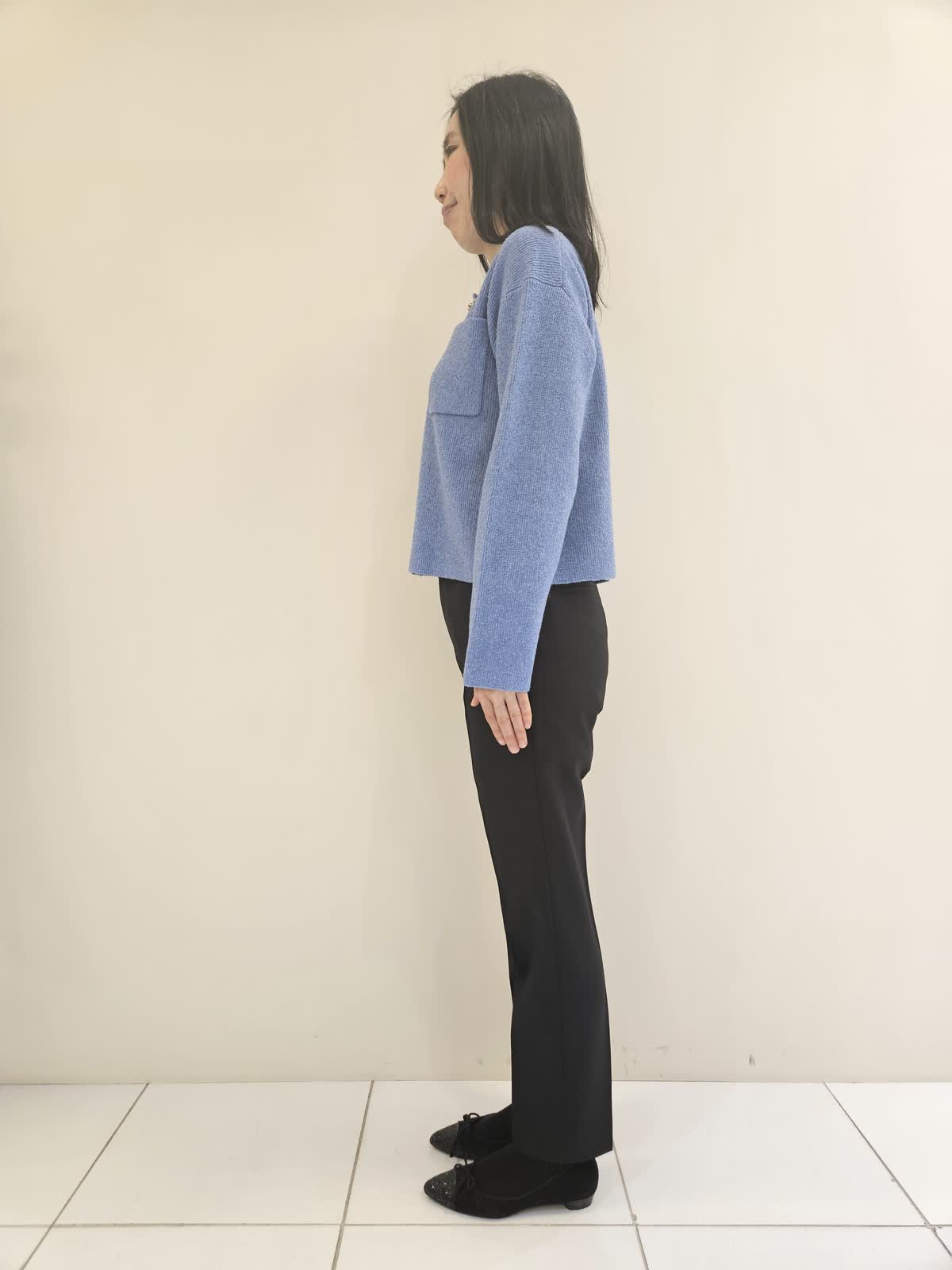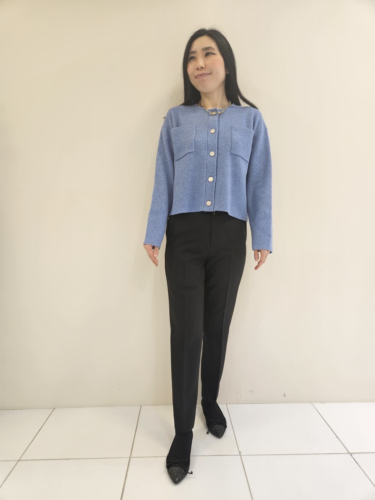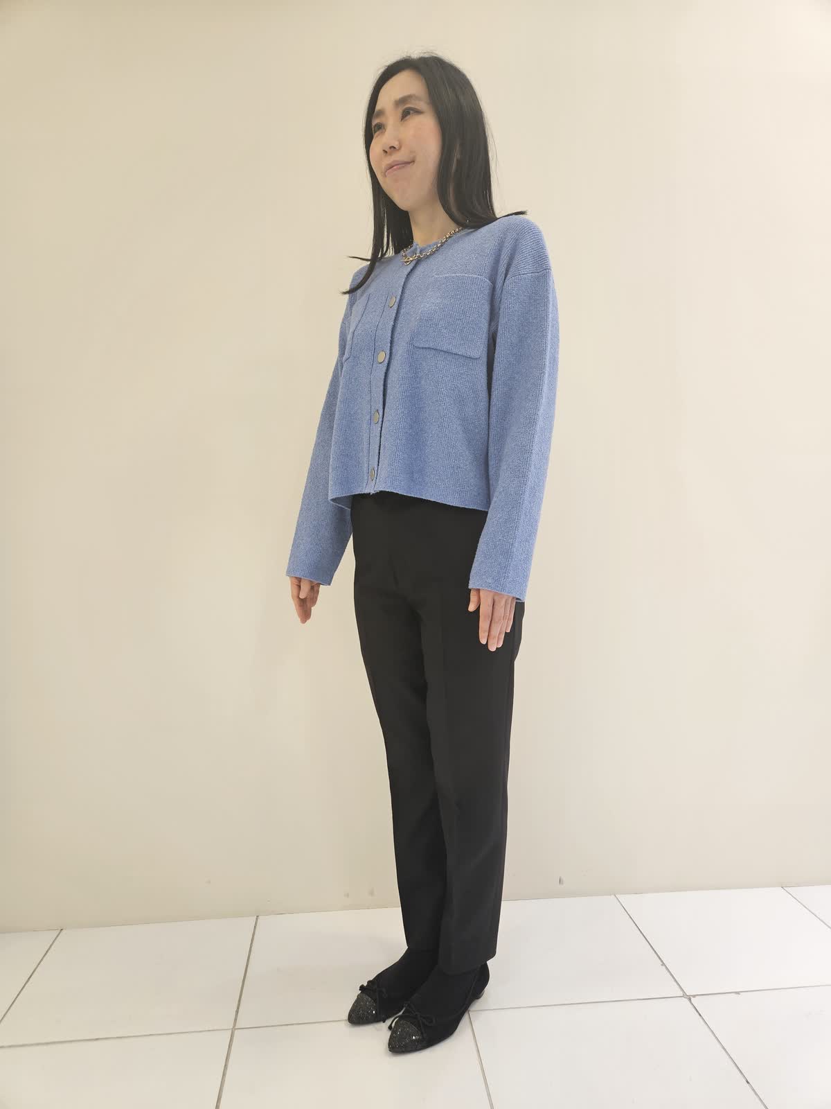 【着用サイズ・カラー】カーディガン:サックス9号・パンツ:ブラック5号 ・ネックレス:ゴールド フリー 胸元のポケットとシルバーのボタンがポイントのカーディガンはワンピース合わせも◎ パンツはテーパードでラインが綺麗で、ストレッチが効いていて動きやすいです。ネックレスはワンポイントにお勧めのアイテムです。