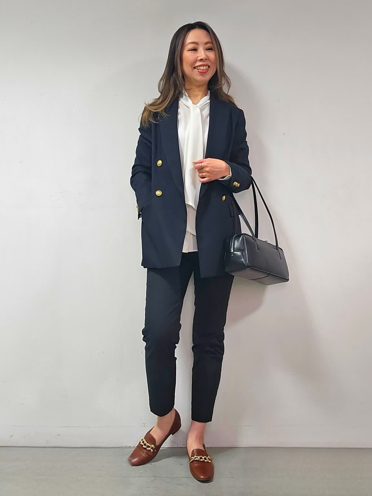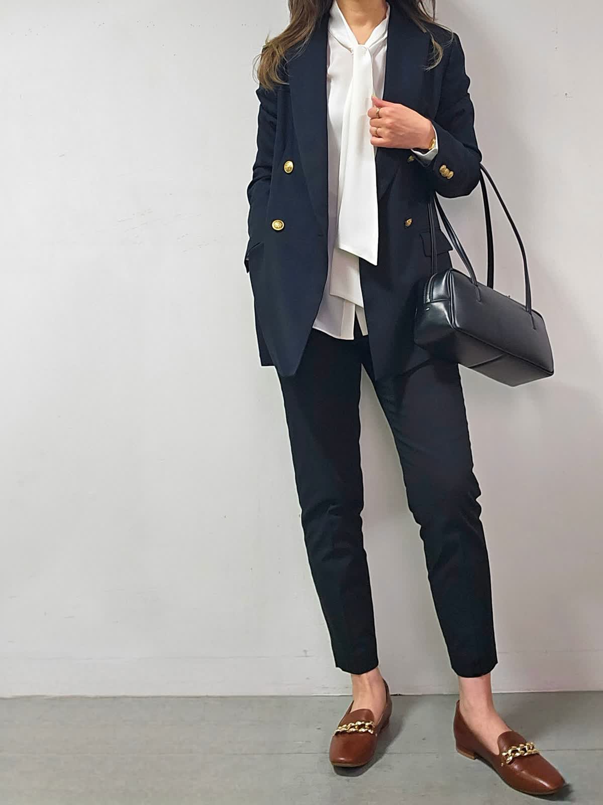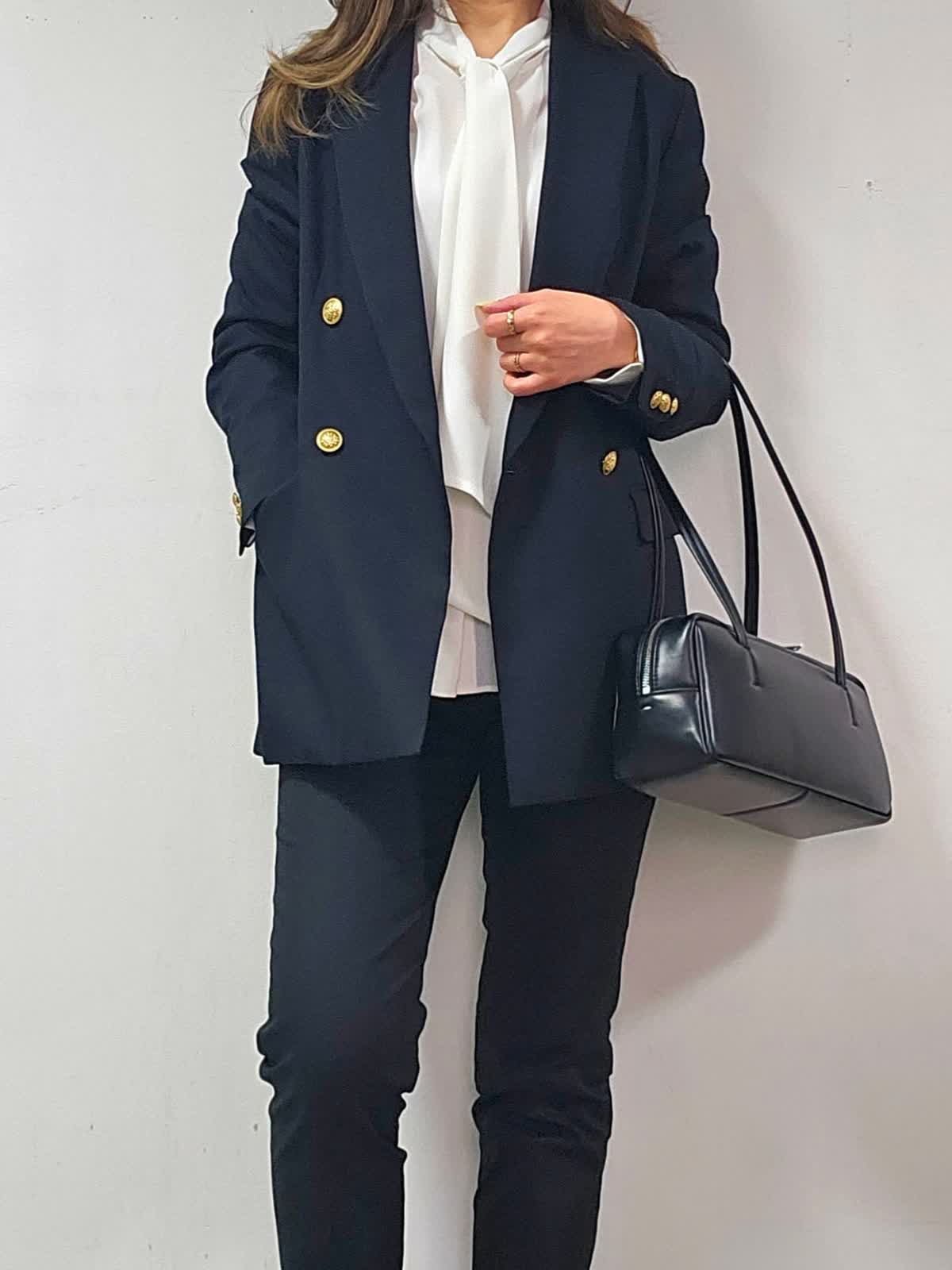 【着用カラー・サイズ】ジャケット:ネイビー・7号 ブラウス:オフホワイト・7号 パンツ:ブラック・5号 バッグ:ブラック 昔からある定番ジャケットでありながら、旬なクラシカルな着こなしに取り入れるとトラッドな印象に仕上がる紺ブレザー☆大人気のアイテムです! ひとつ持っておくとタイムレスに活躍することは間違いなしです!
