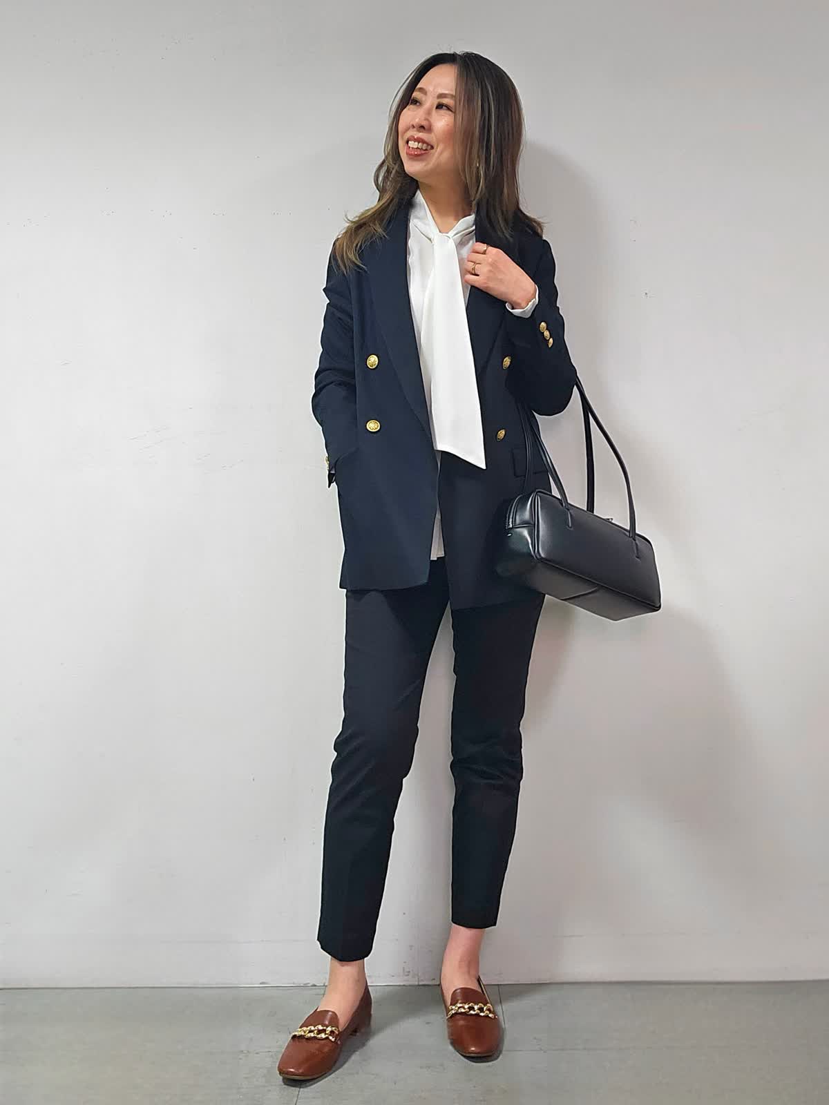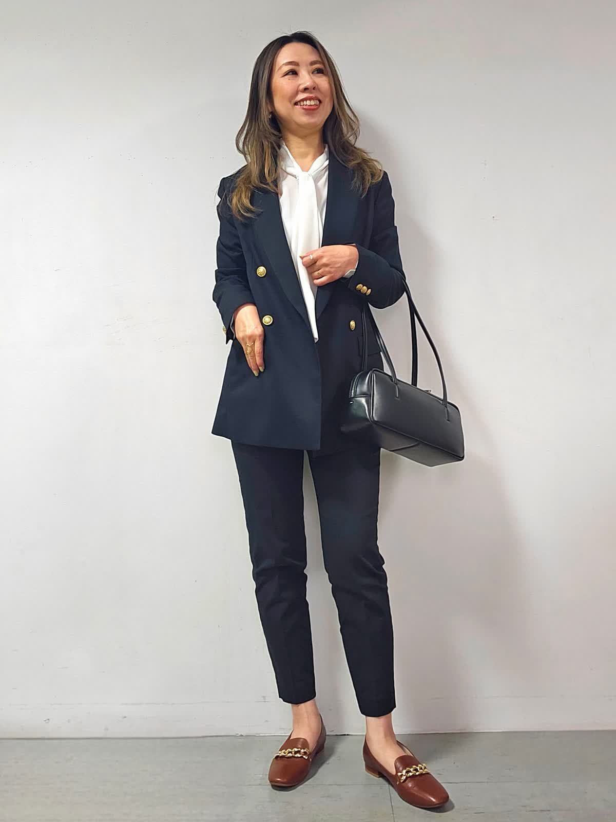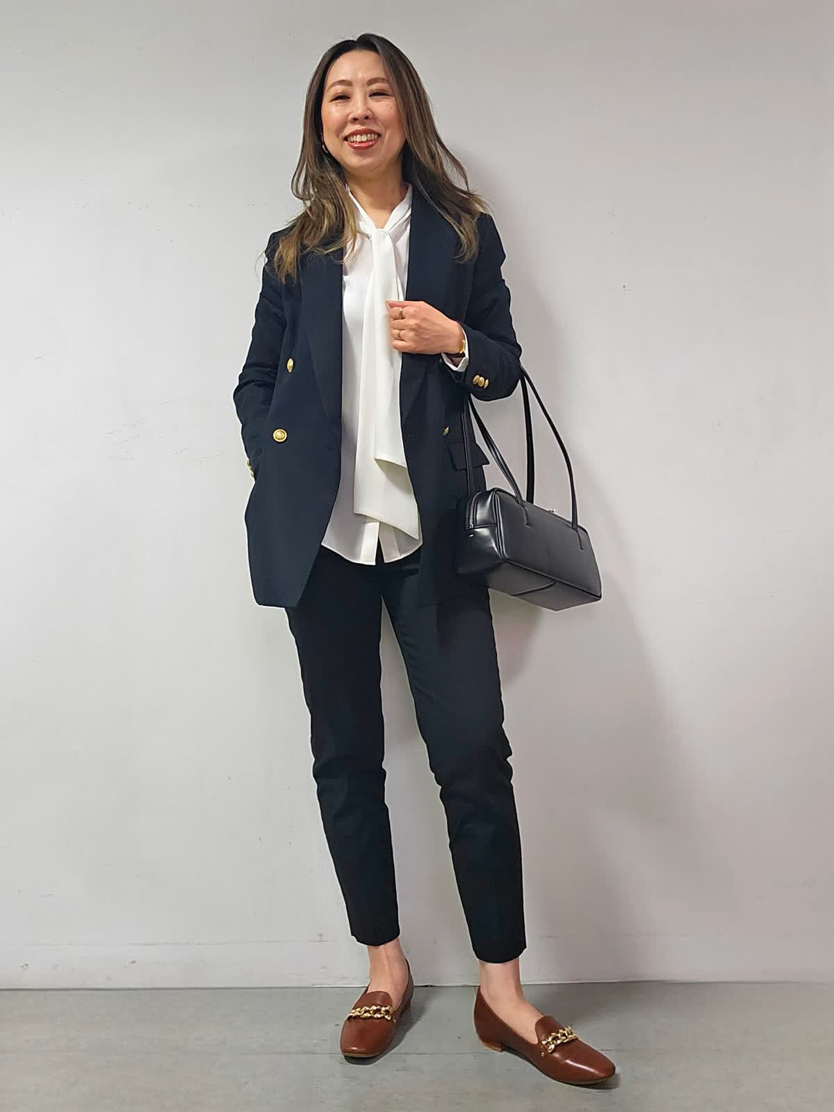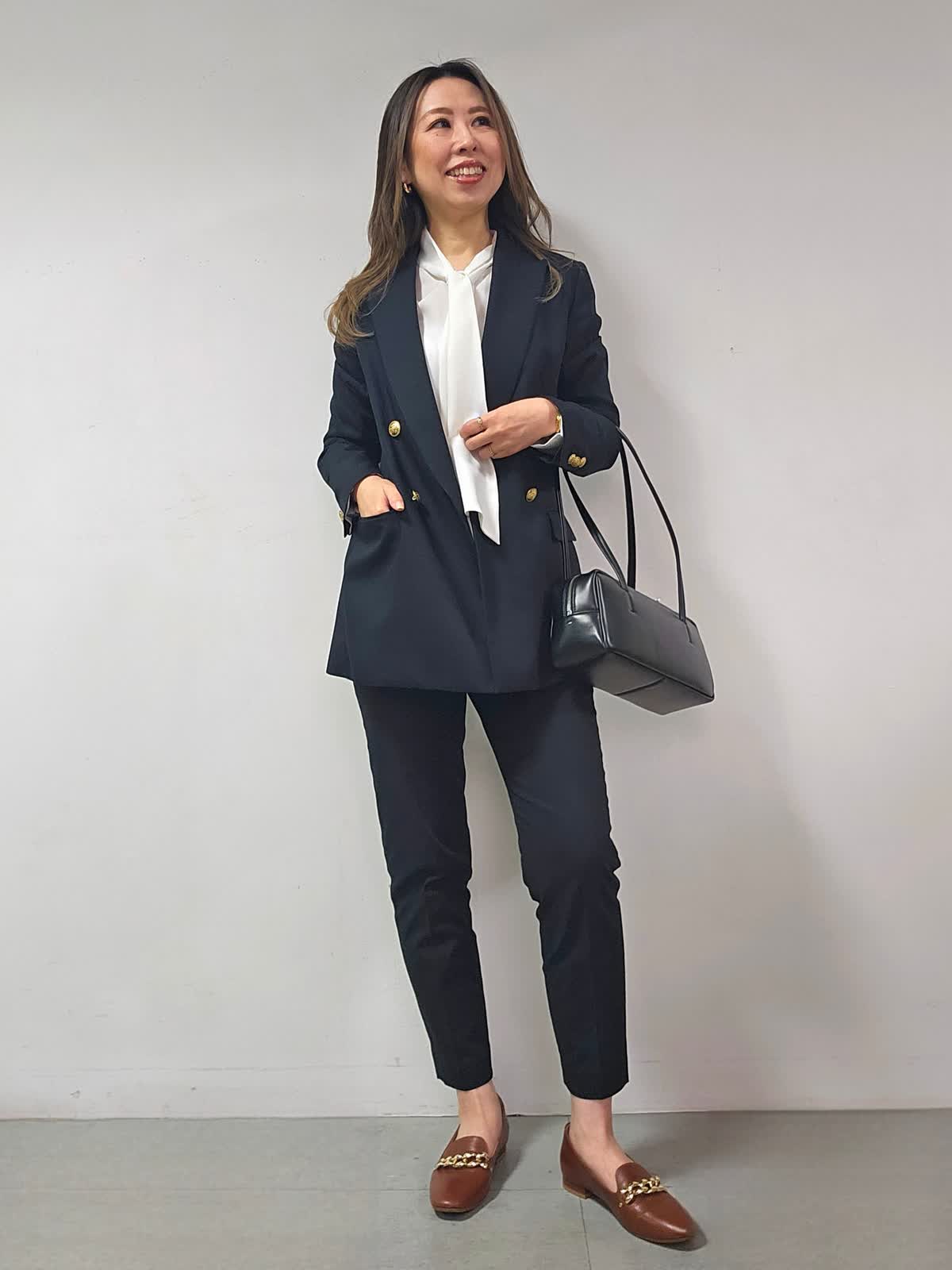 【着用カラー・サイズ】ジャケット:ネイビー・7号 ブラウス:オフホワイト・7号 パンツ:ブラック・5号 バッグ:ブラック 昔からある定番ジャケットでありながら、旬なクラシカルな着こなしに取り入れるとトラッドな印象に仕上がる紺ブレザー☆大人気のアイテムです! ひとつ持っておくとタイムレスに活躍することは間違いなしです!