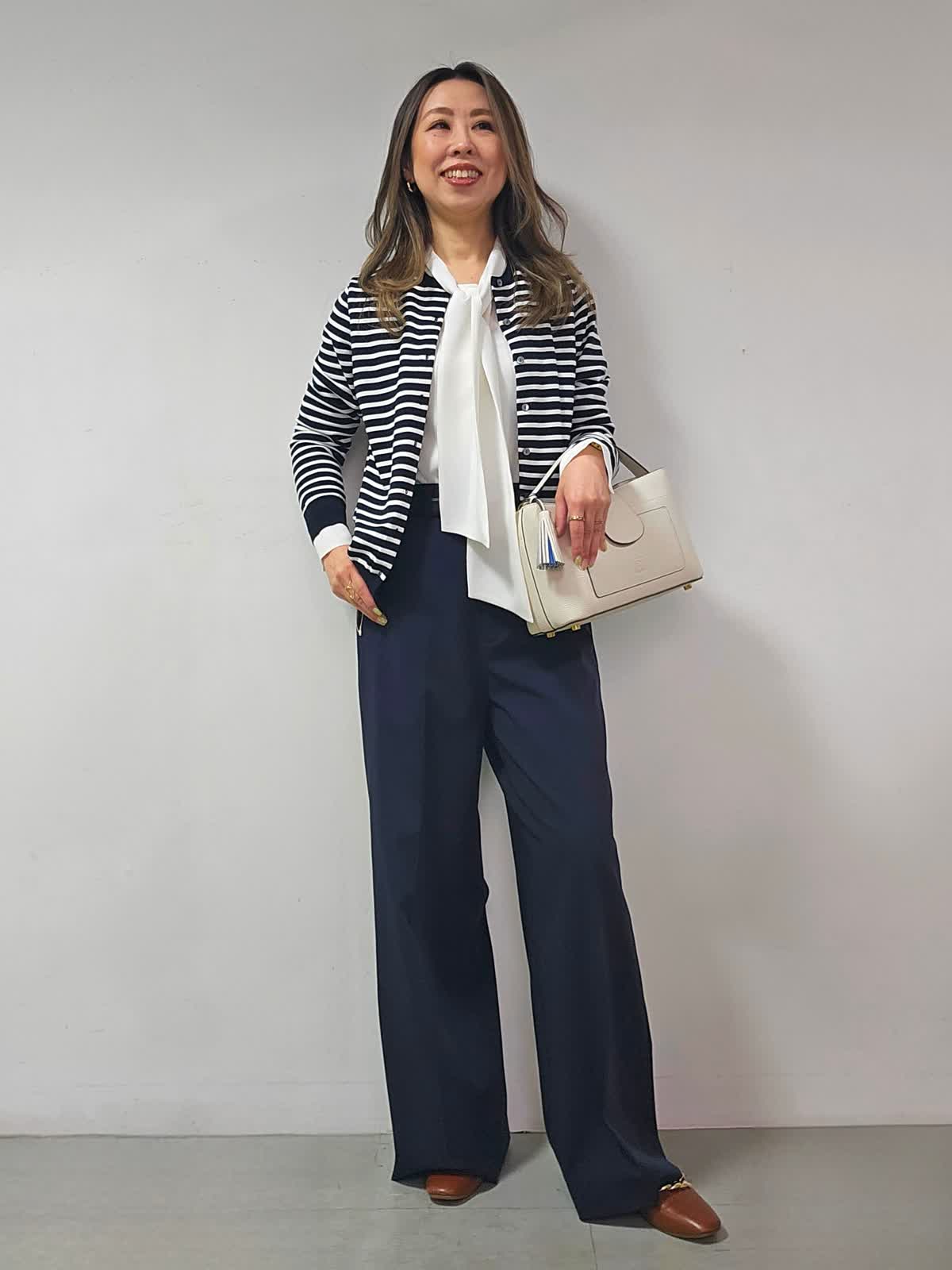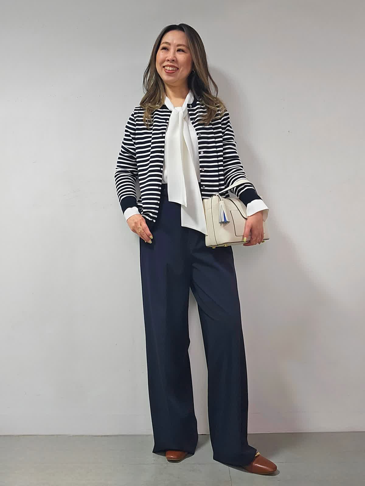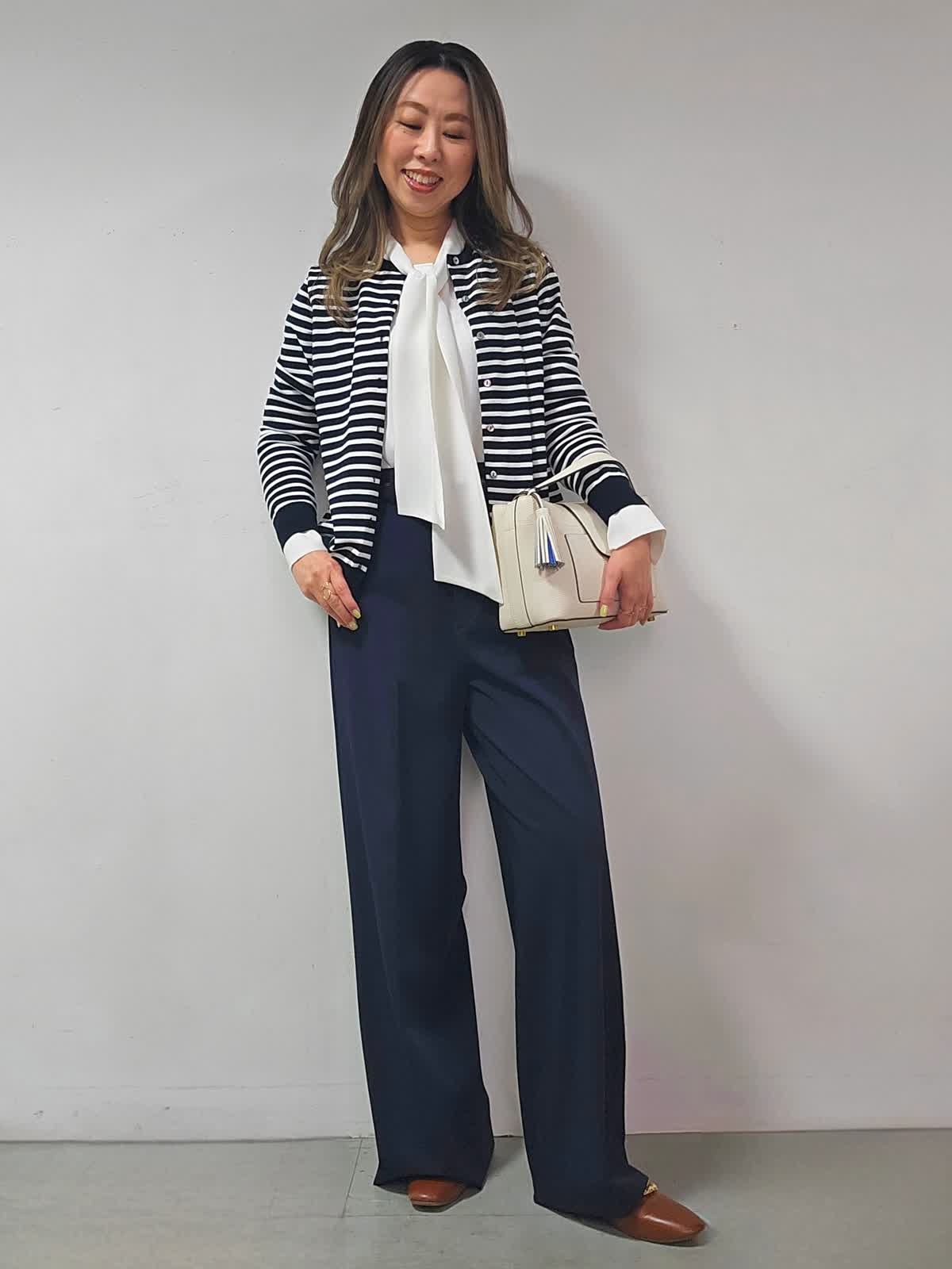 【着用カラー・サイズ】ニットカーディガン:ボーダー・9号 ブラウス:オフホワイト・7号 パンツ:ネイビー・7号 バッグ:オフホワイト 春らしさ満点のコーデが完成するボーダーニットカーディガン☆ どうしてもラフなイメージが強くなりがちなボーダー柄も、きれい目なブラウスやボトムを合わせれば、女性らしく大人の褒められコーデが完成します!