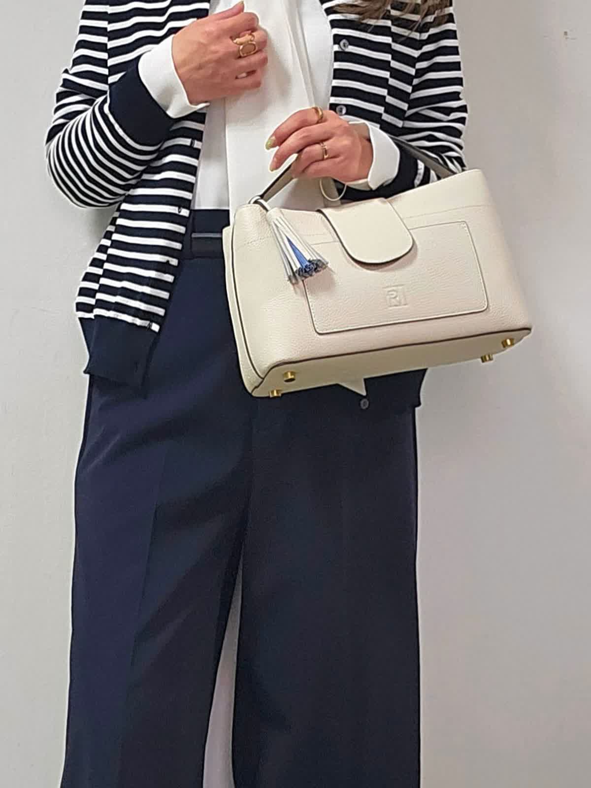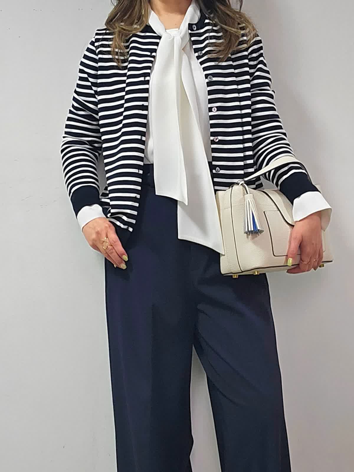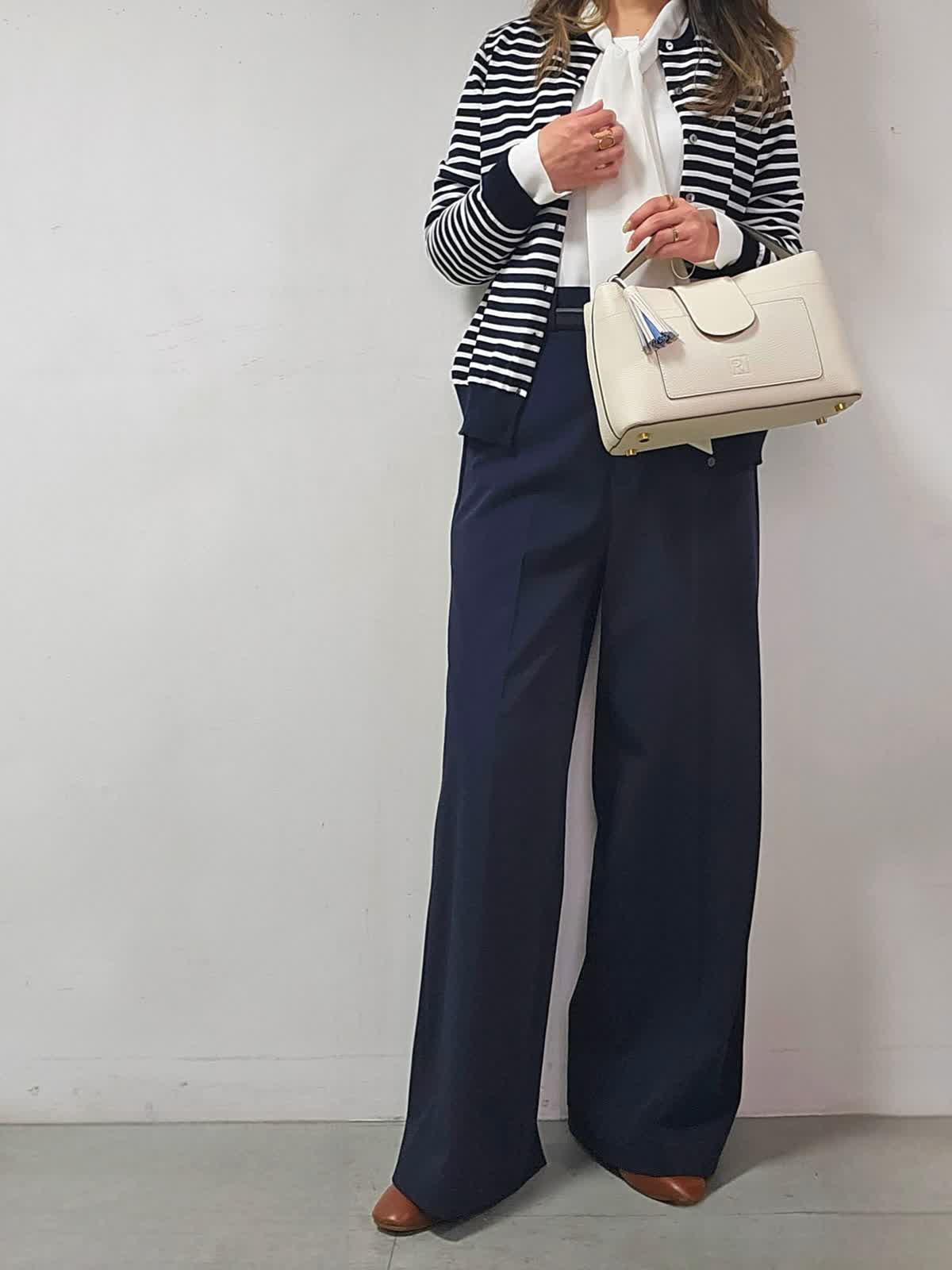 【着用カラー・サイズ】ニットカーディガン:ボーダー・9号 ブラウス:オフホワイト・7号 パンツ:ネイビー・7号 バッグ:オフホワイト 春らしさ満点のコーデが完成するボーダーニットカーディガン☆ どうしてもラフなイメージが強くなりがちなボーダー柄も、きれい目なブラウスやボトムを合わせれば、女性らしく大人の褒められコーデが完成します!
