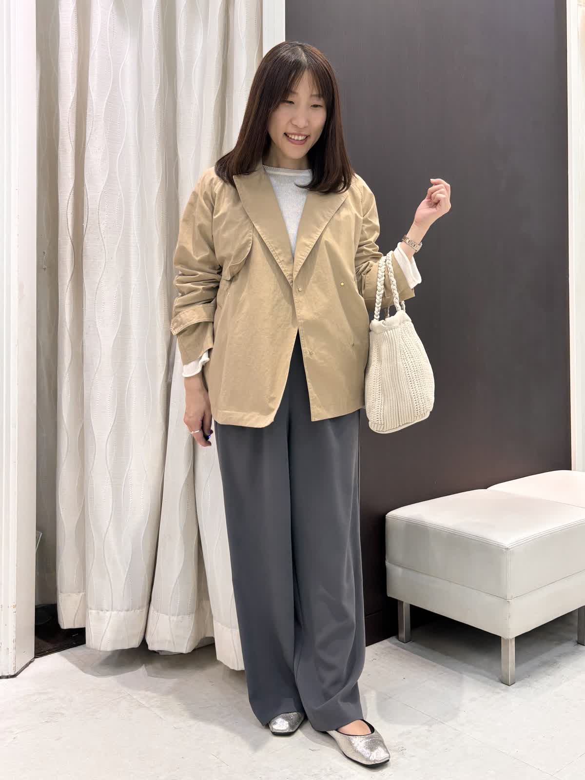 【着用サイズ】ジャケット:キャメル ニット:オフホワイト パンツ:チャコールグレー バッグ:ベージュ