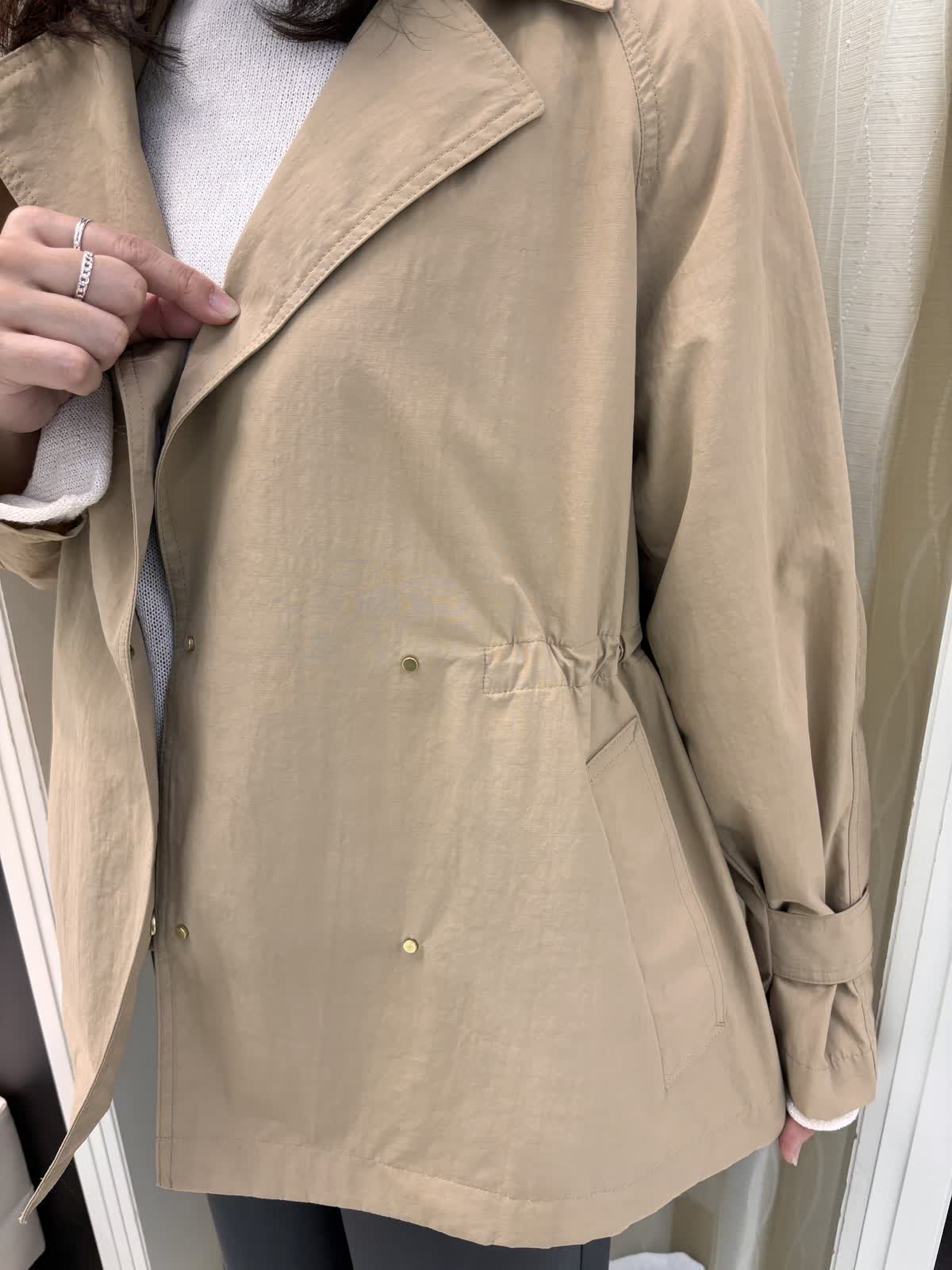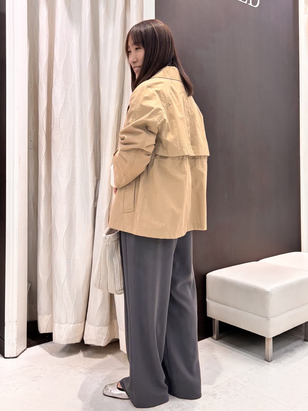 朝晩の寒暖差に持っていて安心なのはショート丈のトレンチ。程よいハリ感のある素材がキレイめカジュアルスタイリングにピッタリ!ウエストのドロストを絞ってAラインにするととってもかわいい!袖はラグランでゆとりがあるのでゆるりシルエットのニットも楽々着れます。ヒップがしっかり隠れる着丈なので動きやすく旅行にピッタリです。裏地ナシ、軽さが特徴です。合わせたニットは和紙混なのに柔らかいです。ワイドパンツ合わせにピッタリなシルエットですよ。