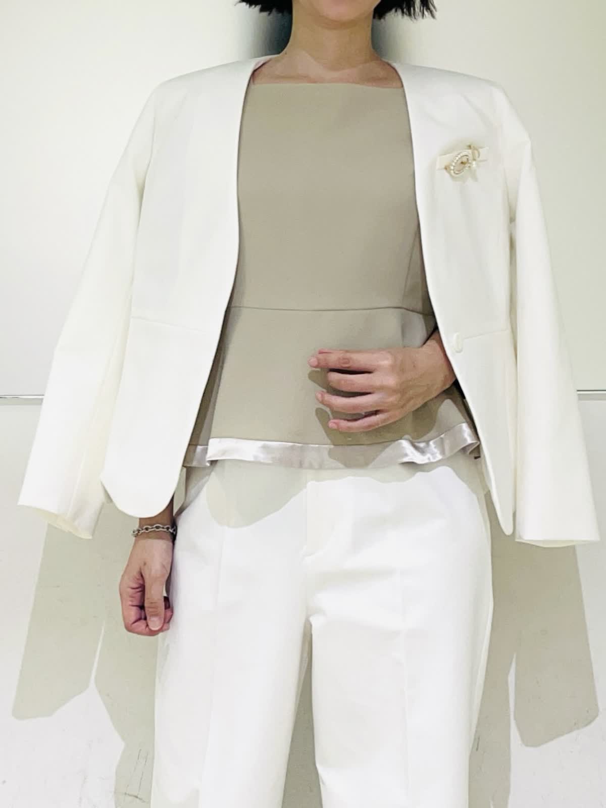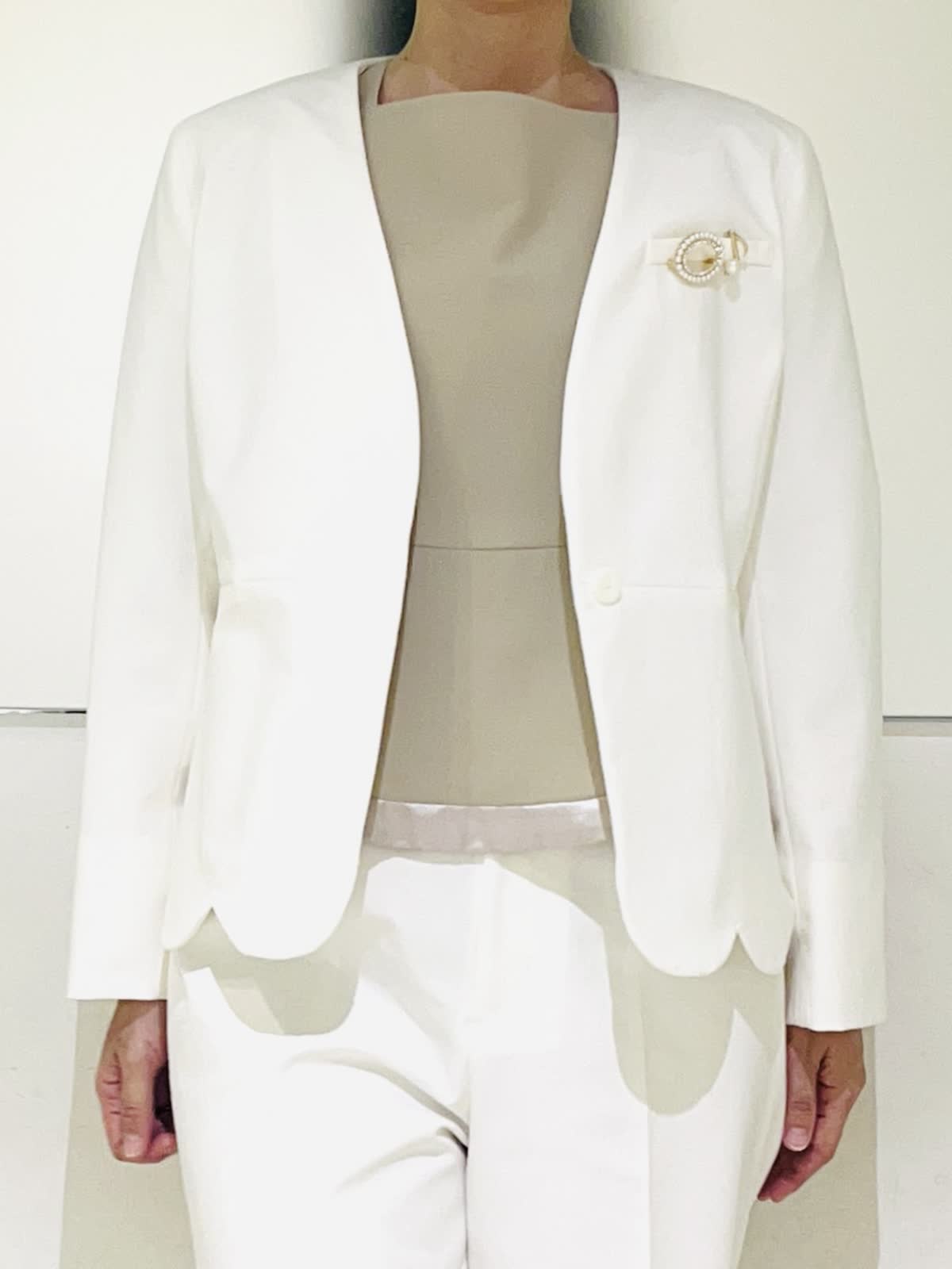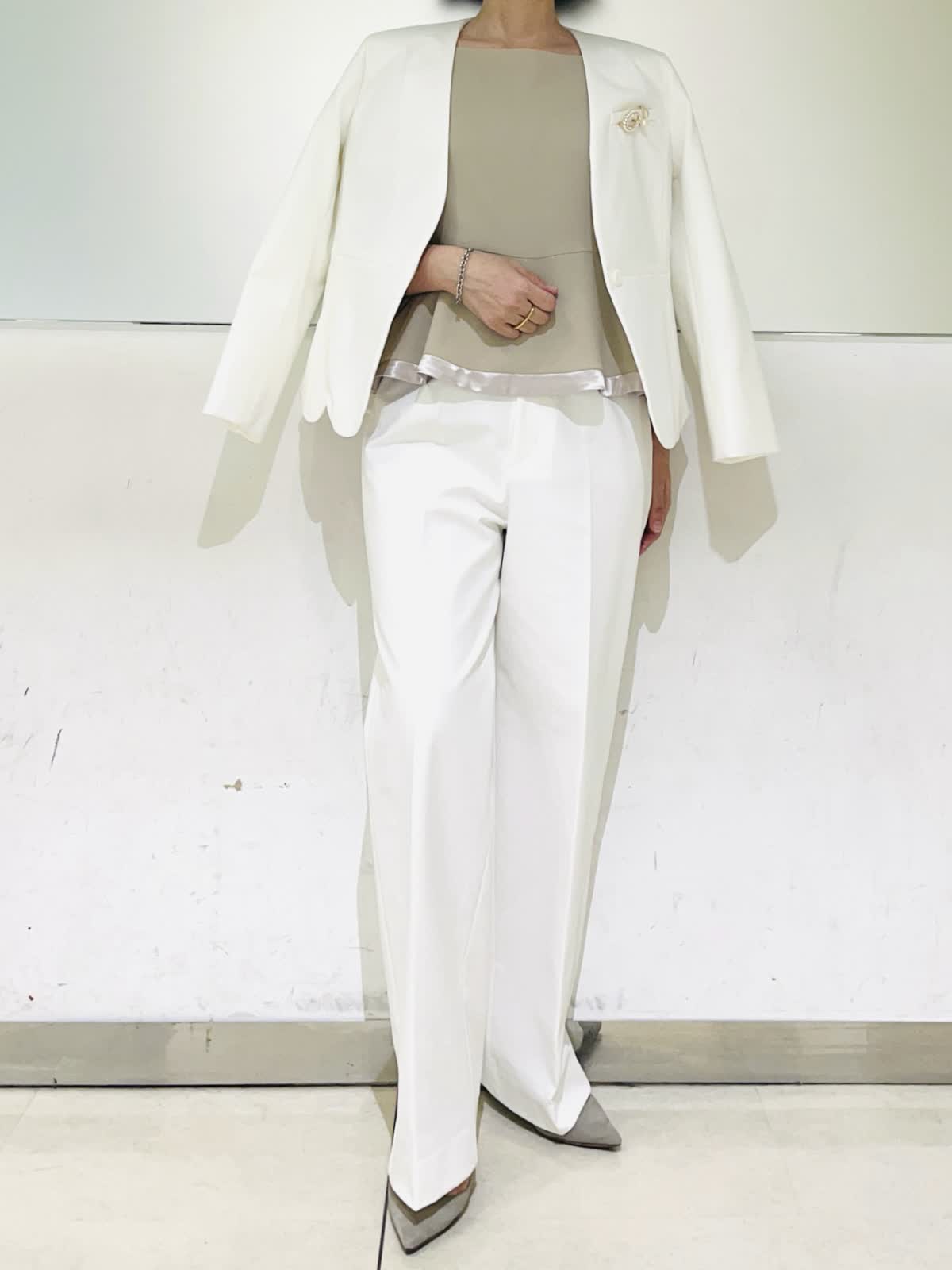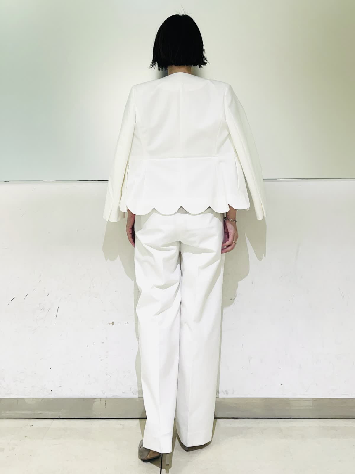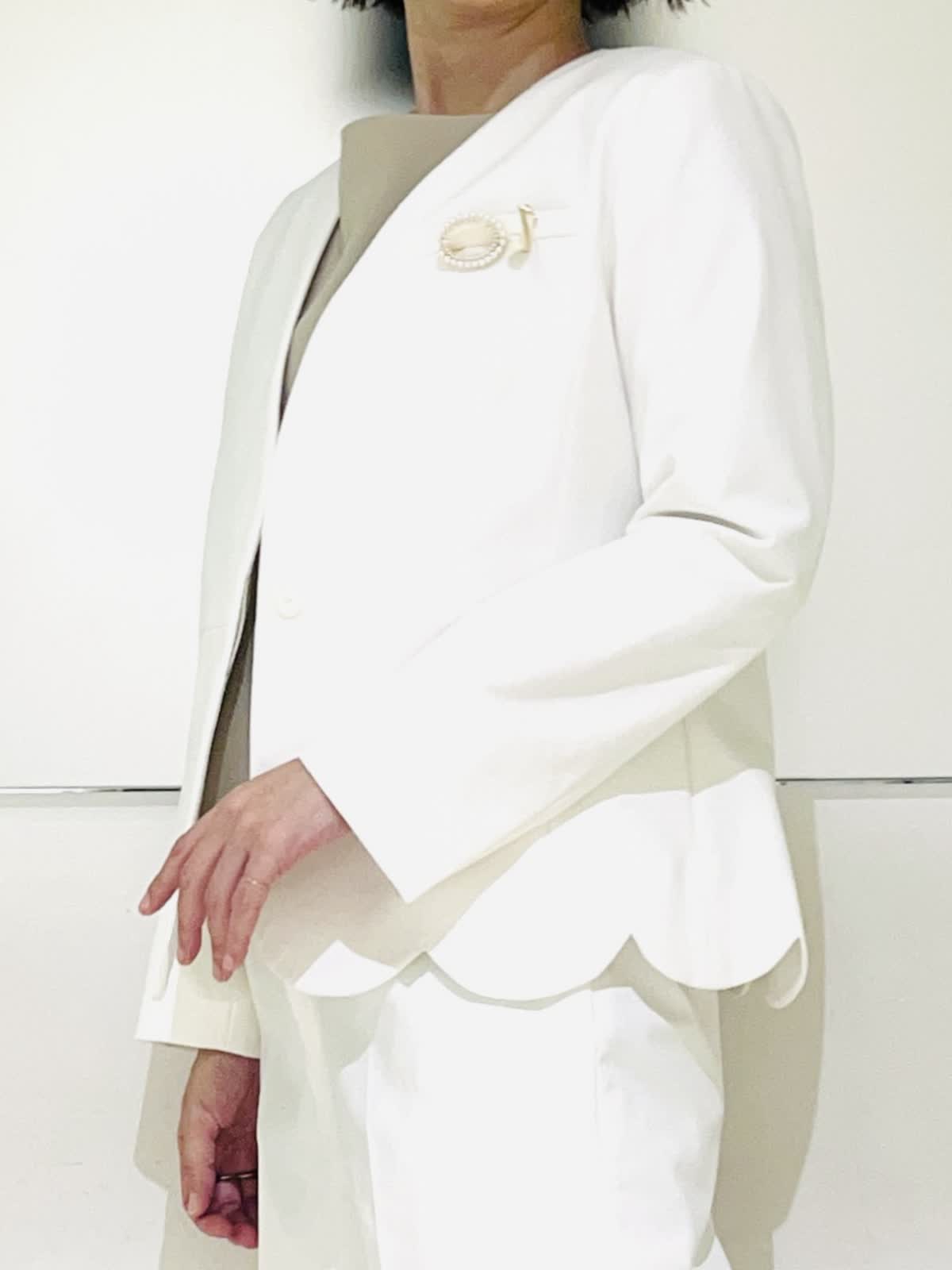 【着用アイテム】すべて9号 【着用カラー】ジャケット、パンツ:オフホワイト 優しいオフホワイトが華やかなセットアップ。カラーレスですっきりとしたシルエット。裾のスカラップデザインがフェミニンな雰囲気になります。パンツとセットアップで着ればハンサムでモードなスタイリングに。ご自宅で洗えるので、汚れが気になる白でも安心です。