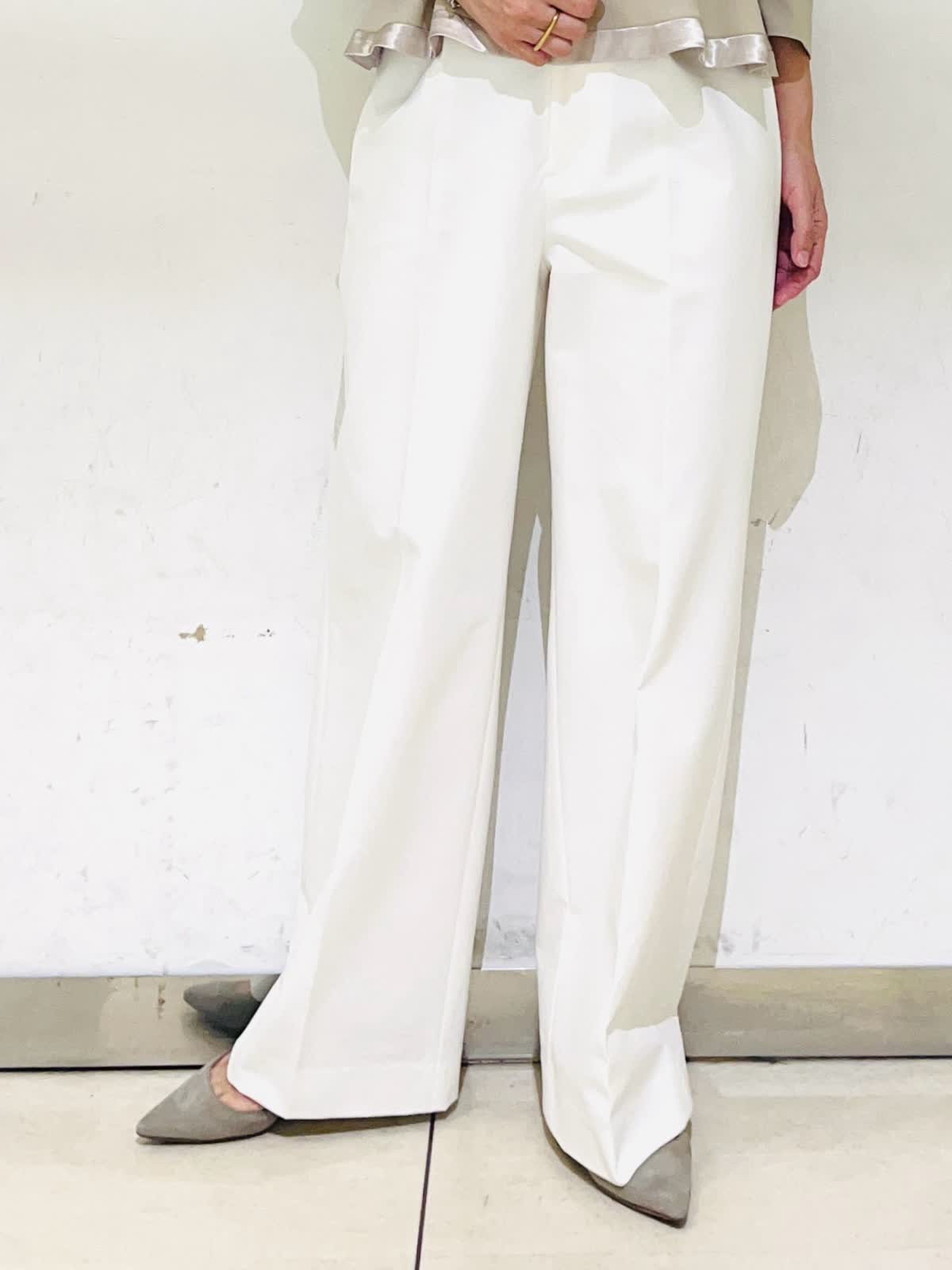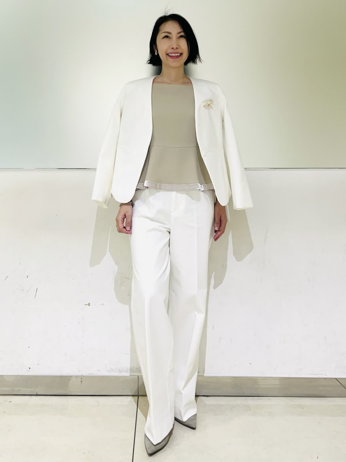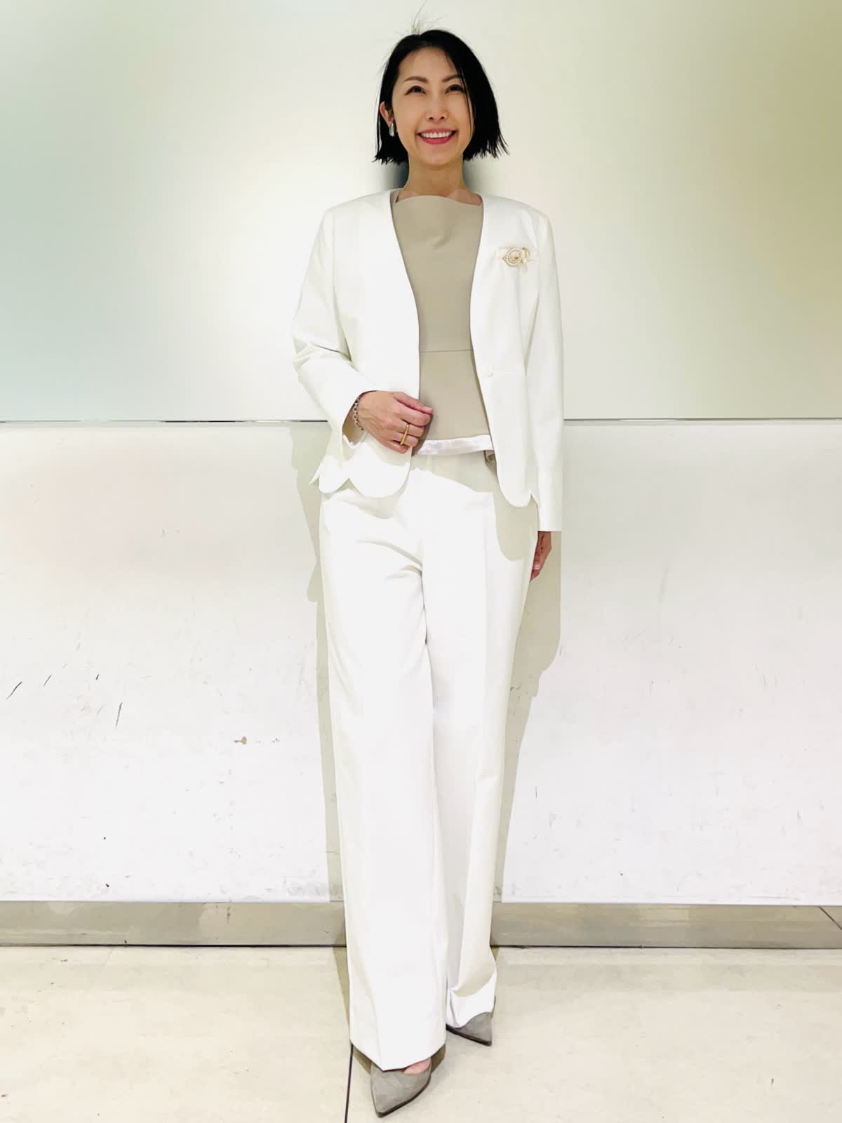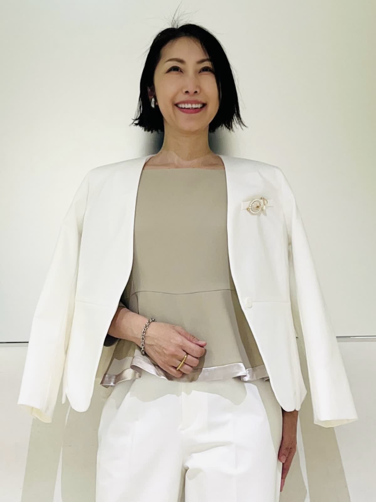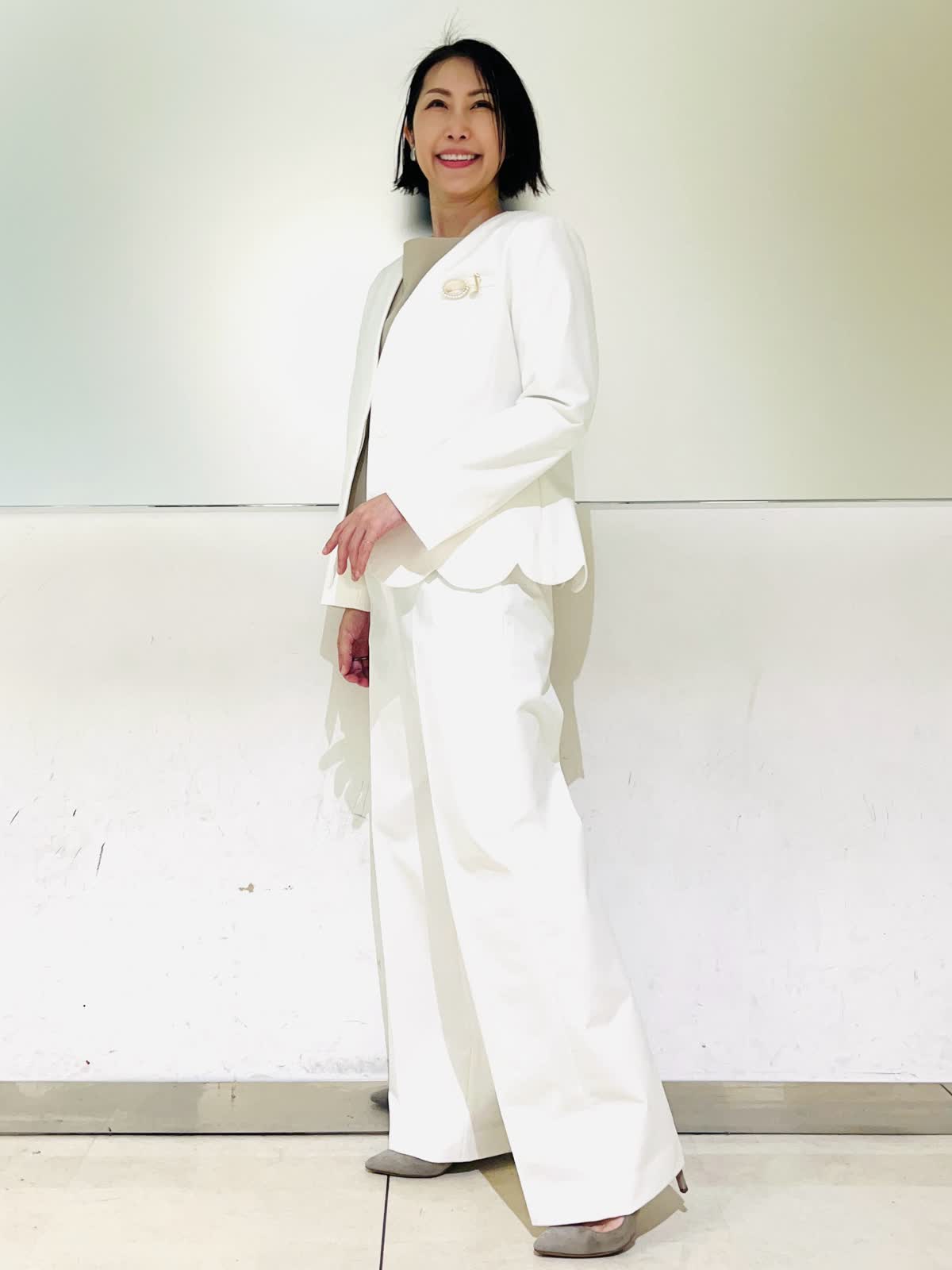 【着用アイテム】すべて9号 【着用カラー】ジャケット、パンツ:オフホワイト 優しいオフホワイトが華やかなセットアップ。カラーレスですっきりとしたシルエット。裾のスカラップデザインがフェミニンな雰囲気になります。パンツとセットアップで着ればハンサムでモードなスタイリングに。ご自宅で洗えるので、汚れが気になる白でも安心です。