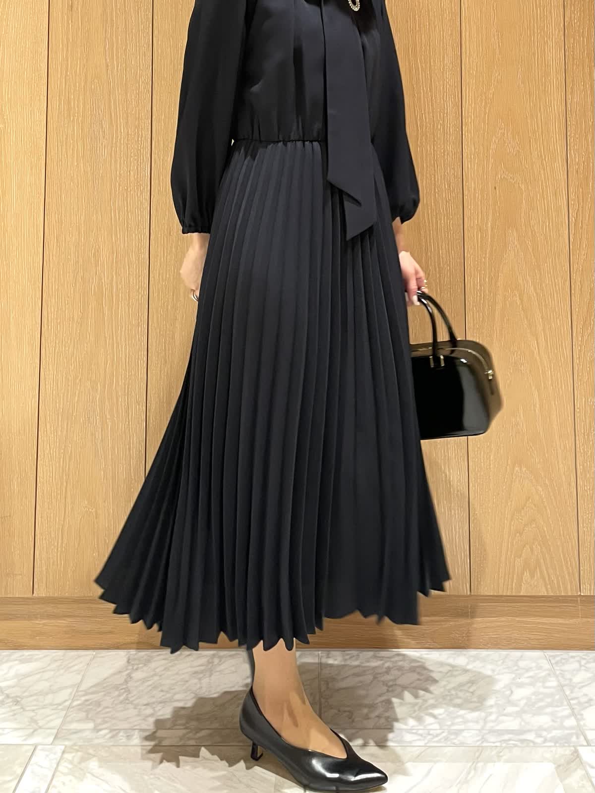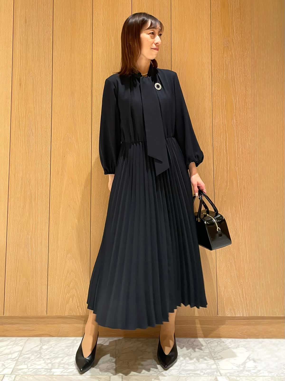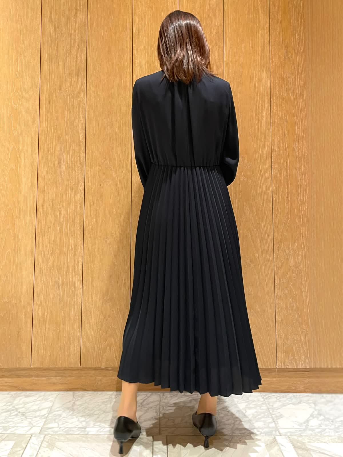 【着用サイズ・カラー】ワンピース : 7号 ネイビー ハレの日に1枚あると活躍するワンピース。ジョーゼット素材を使用した上品なボウタイ付きのプリーツワンピースは、歩くとプリーツが揺れてエレガントな雰囲気。ウエストは柔らかいゴム使用でストレスフリーです。楽に着られてきちんと感を演出してくれる優秀なワンピースです。長袖なので1枚でも安心です。