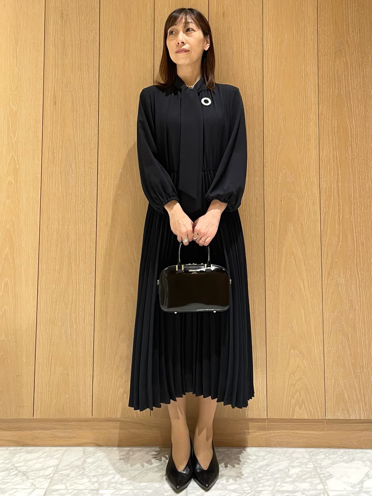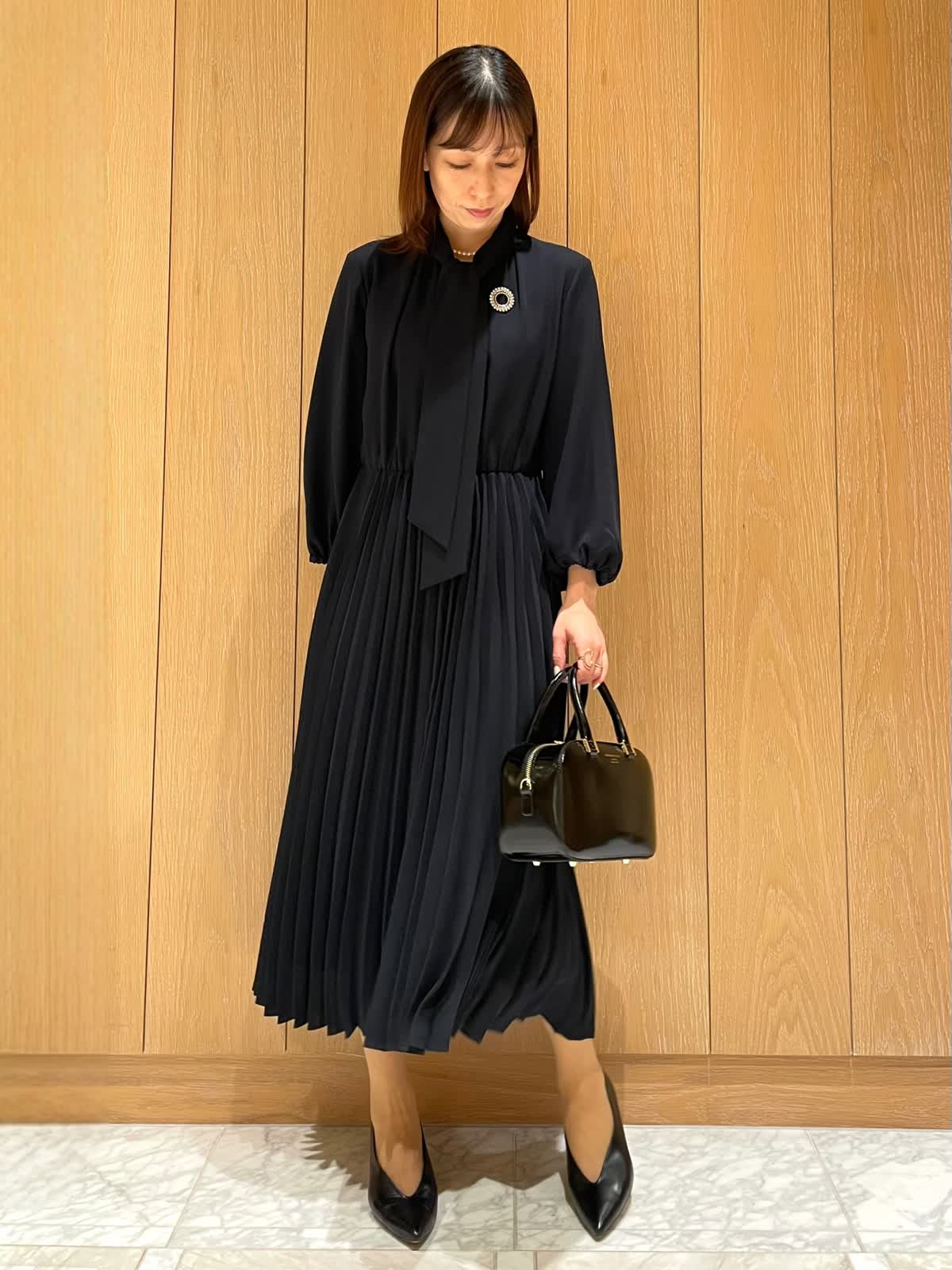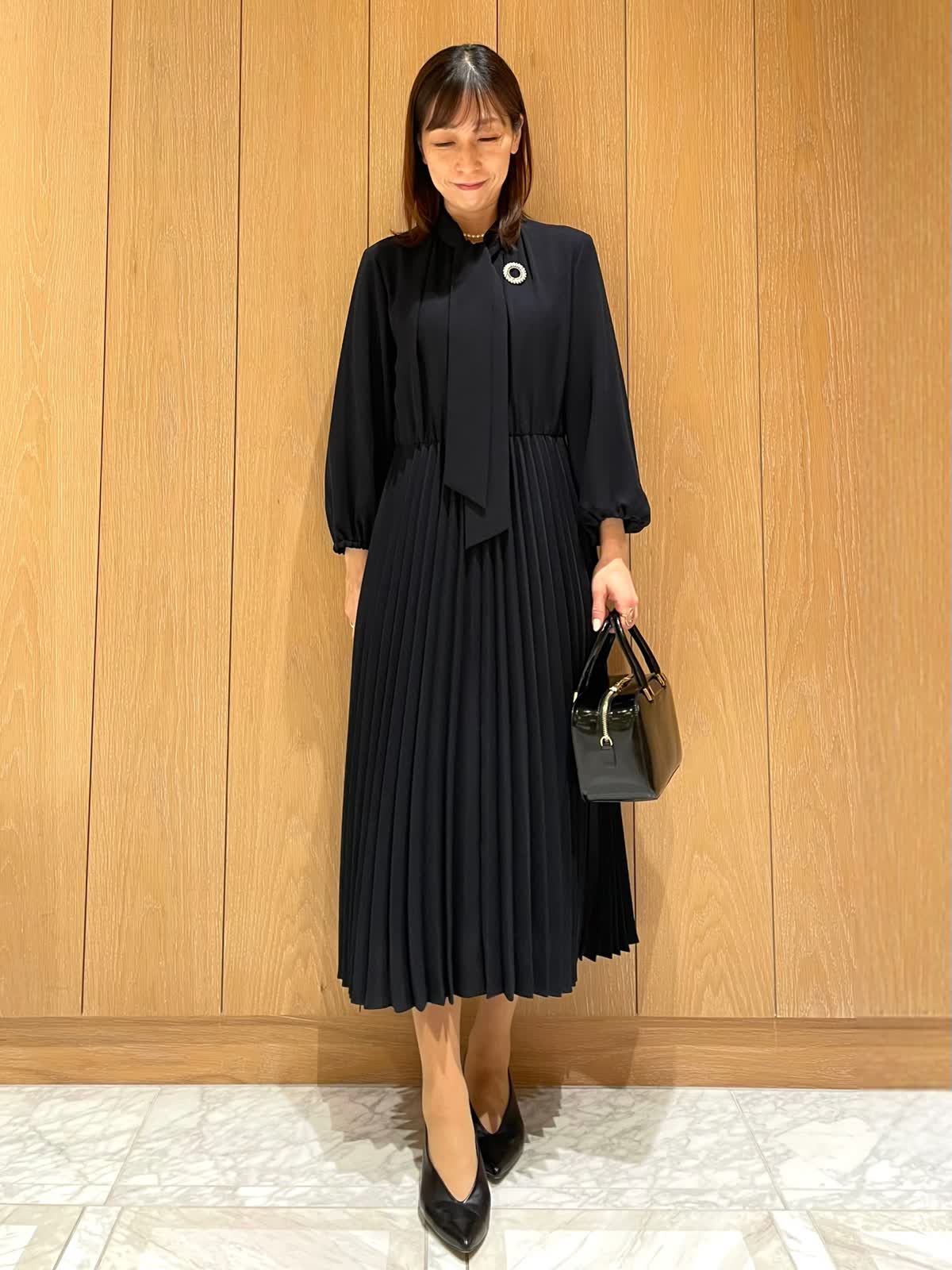 【着用サイズ・カラー】ワンピース : 7号 ネイビー ハレの日に1枚あると活躍するワンピース。ジョーゼット素材を使用した上品なボウタイ付きのプリーツワンピースは、歩くとプリーツが揺れてエレガントな雰囲気。ウエストは柔らかいゴム使用でストレスフリーです。楽に着られてきちんと感を演出してくれる優秀なワンピースです。長袖なので1枚でも安心です。