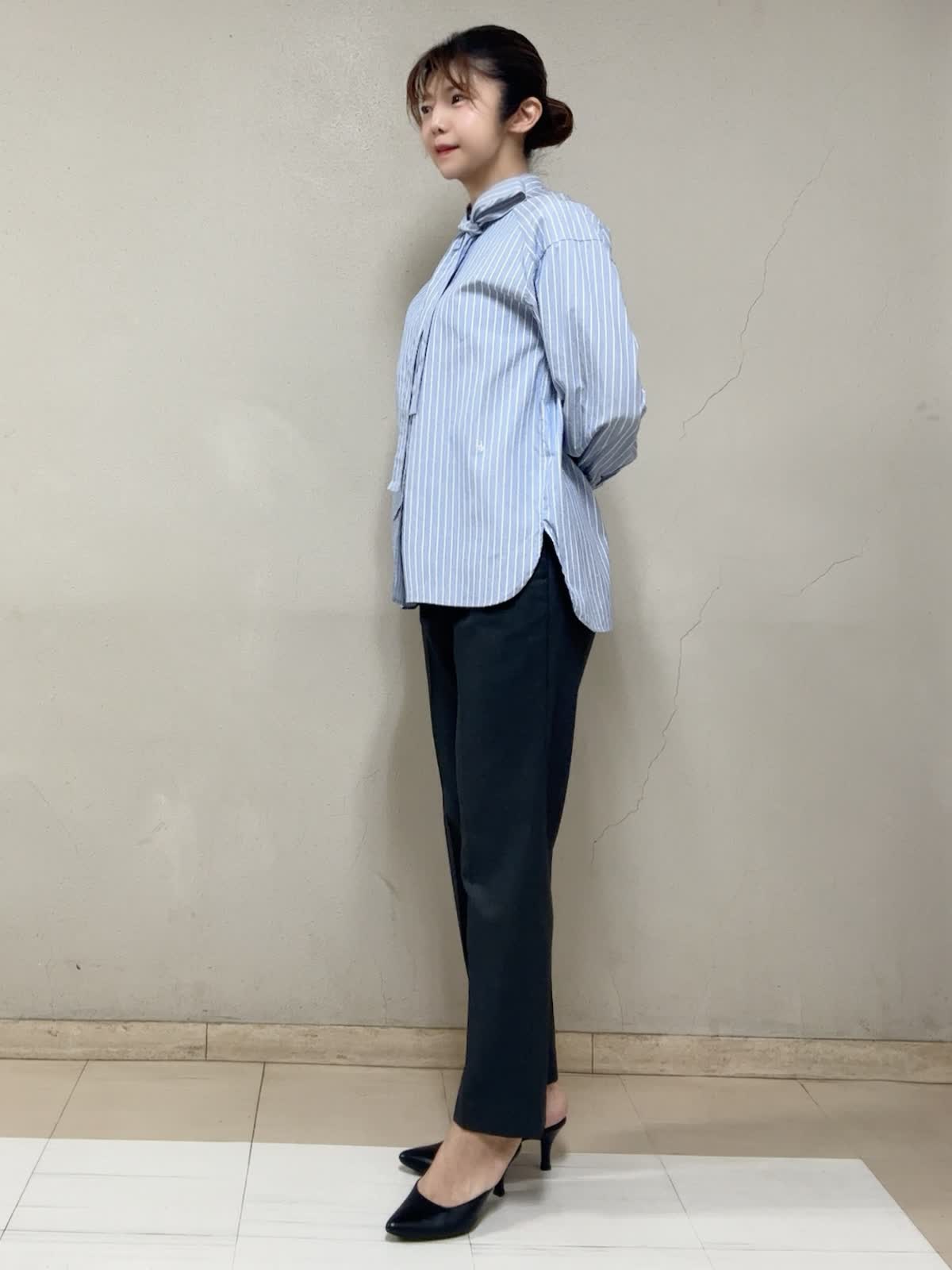 【着用サイズ】ブラウス:フリー パンツ:11号 【着用カラー】ブラウス:ストライプ パンツ:チャコールグレー 通勤スタイル オックスのブラウスのボウタイが可愛い。もちろん外せるボウタイは、印象をチェンジできる。