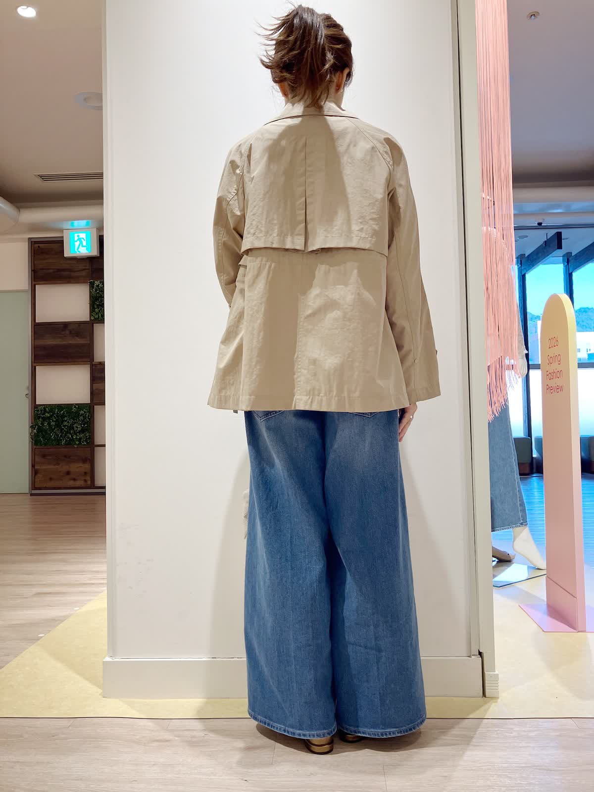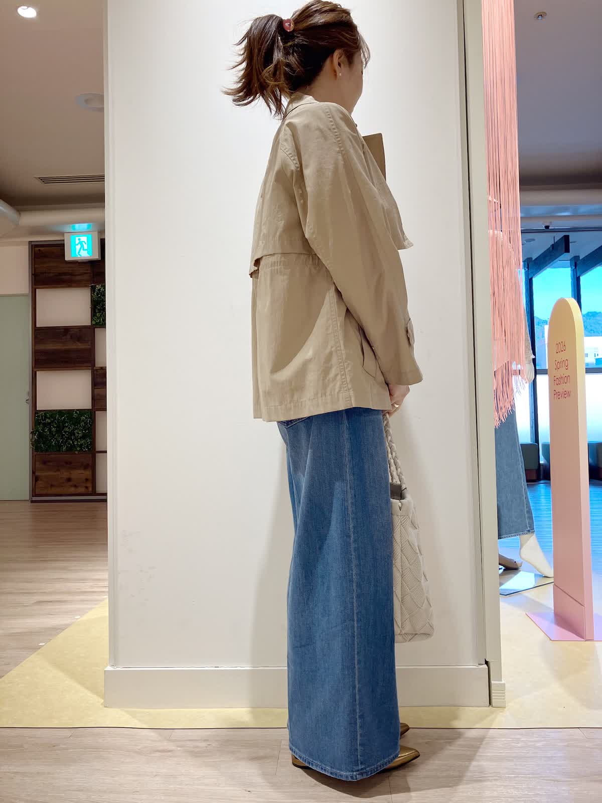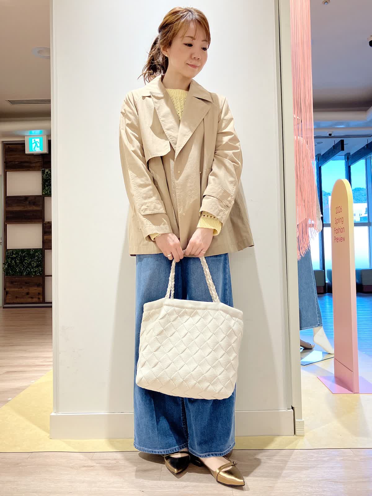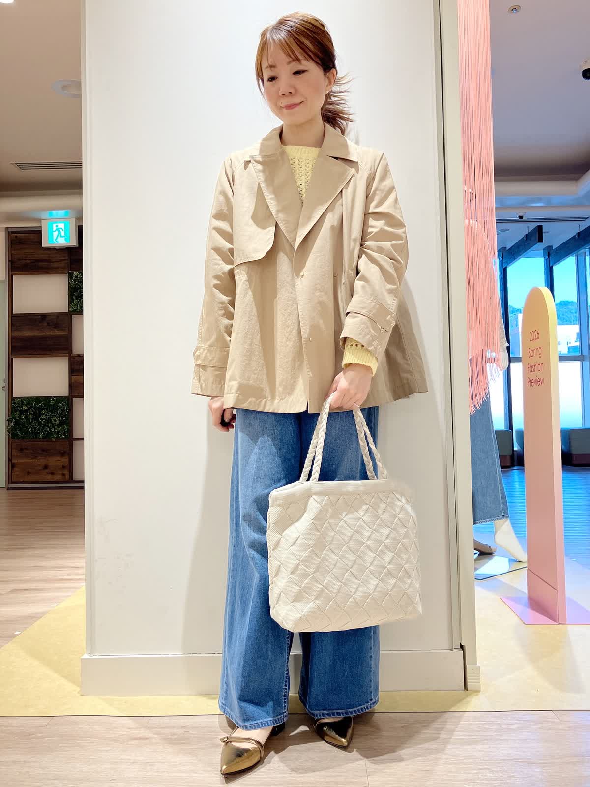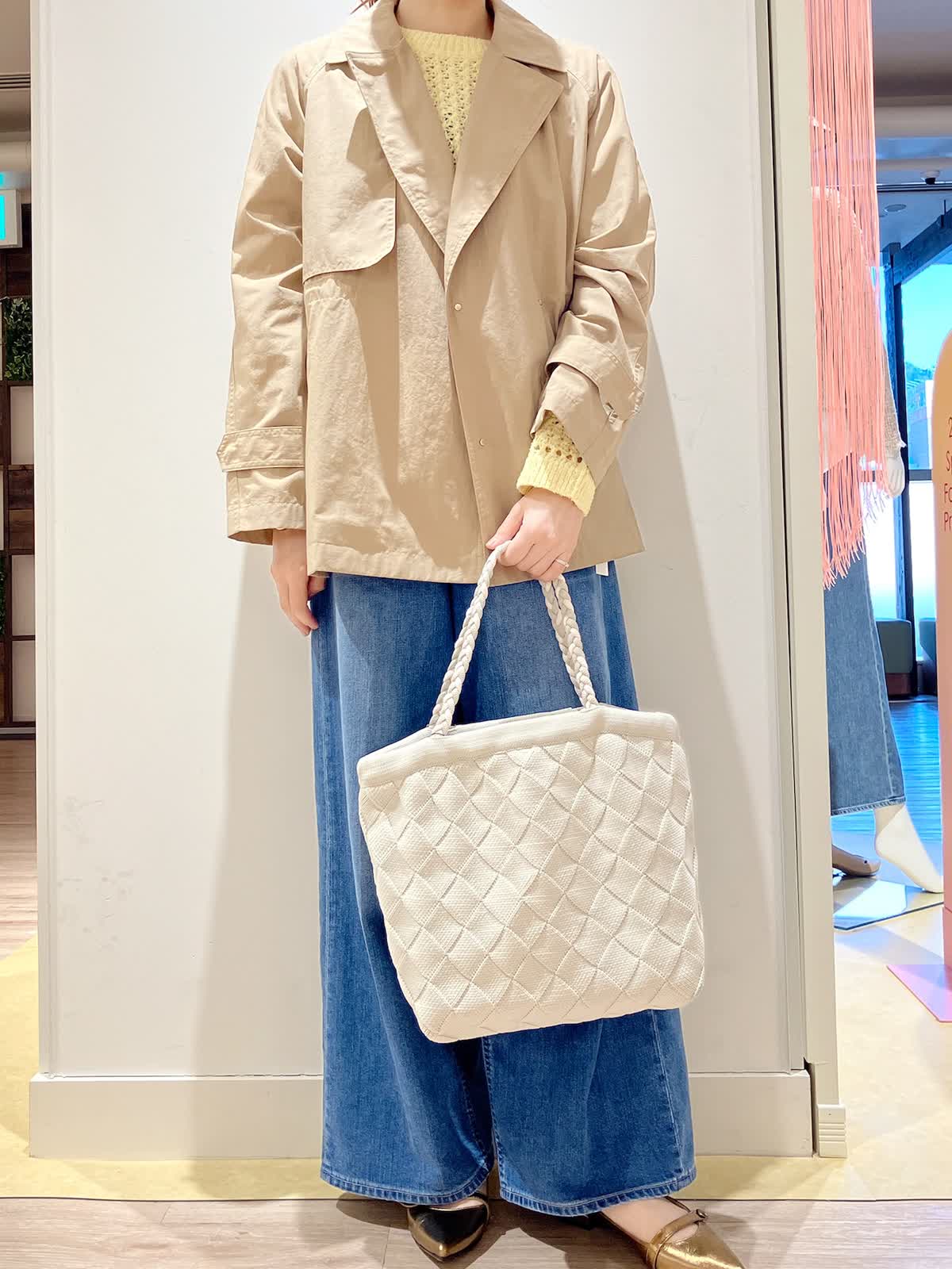 【着用サイズ】コート:9号 ニット:9号 パンツ:5号 【着用カラー】コート:キャメル ニット:イエロー パンツ:インディゴ コーディネートのテーマは旅行スタイリングです。 ナイロン素材のショートトレンチ風コートは、軽くて、ラグランスリーブなので、着心地抜群。これからのシーズンに大活躍の1枚です。ウエストをドロストして絞れるので、ワイドデニムともバランス良く合わせていただけます。こらからのシーズンのご旅行にぜひおすすめのしたいコーディネートです。
