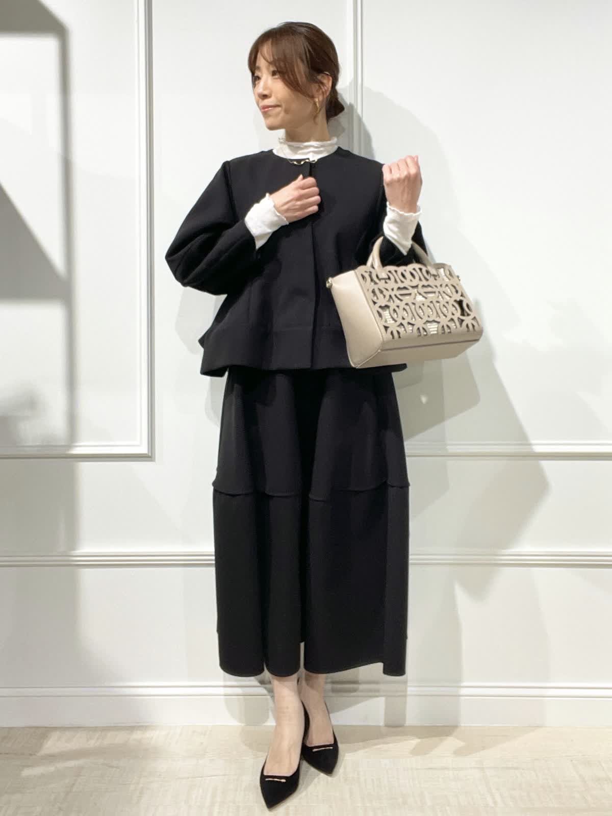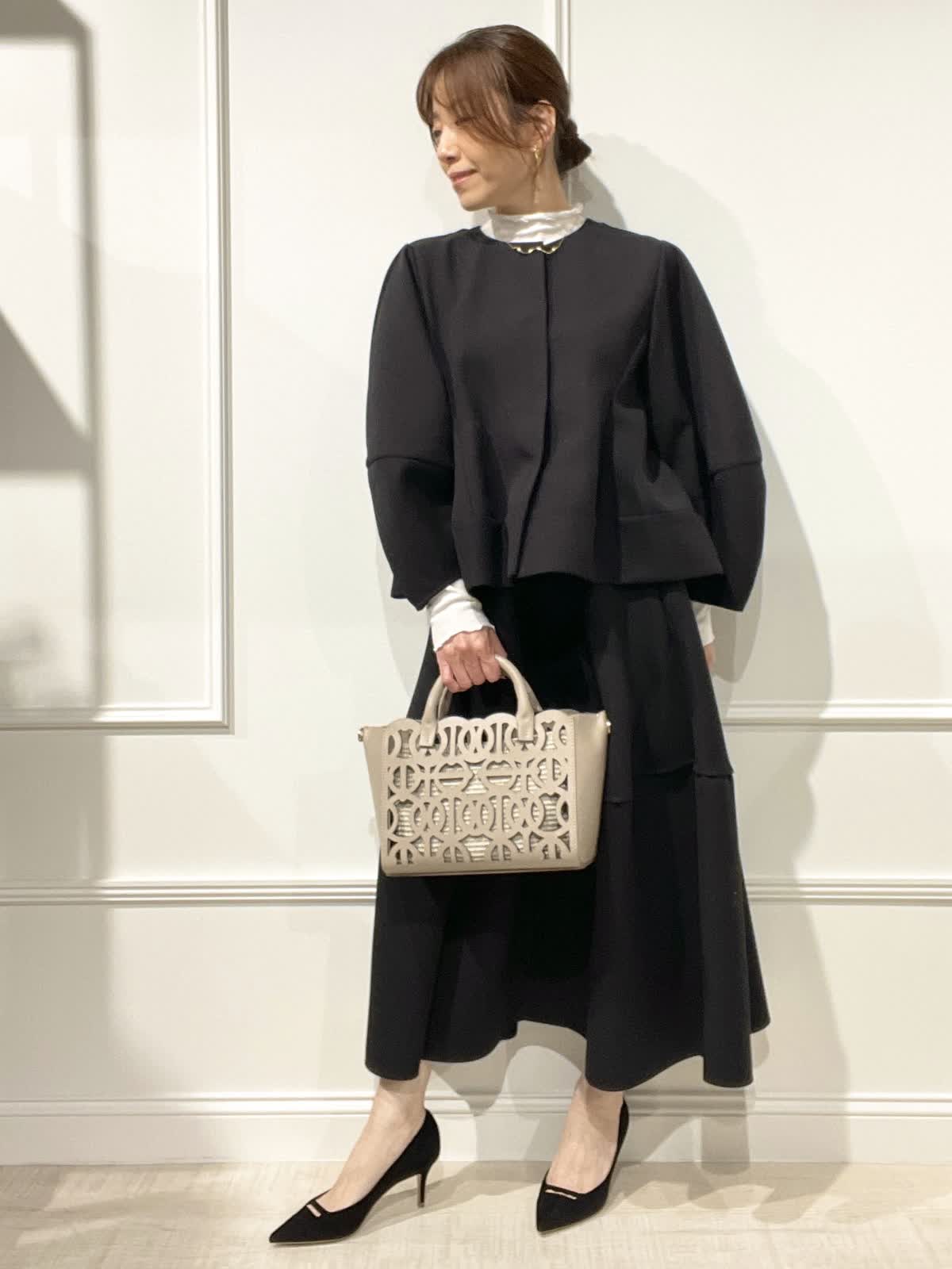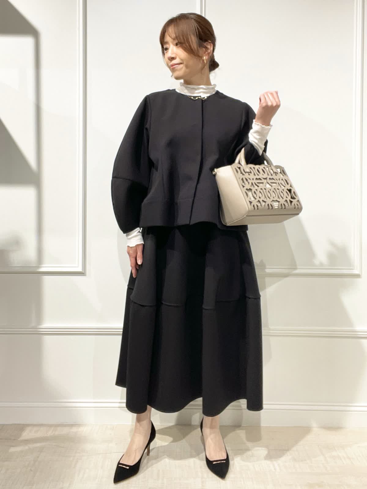 【着用アイテム:カラー/サイズ】 ジャケット:ブラック/9号 スカート:ブラック/9号 テレコカットソー:オフホワイト/9号 ぽわん袖とペプラムラインが可愛いジャケットは、羽織るだけでオシャレ感でます。インナーにシアーカットソーを合わせました。セットアップで着るとセレモニーにもOK。スカートは切替えで、裾の広がりが抑えられているのが大人可愛いスタイルです。