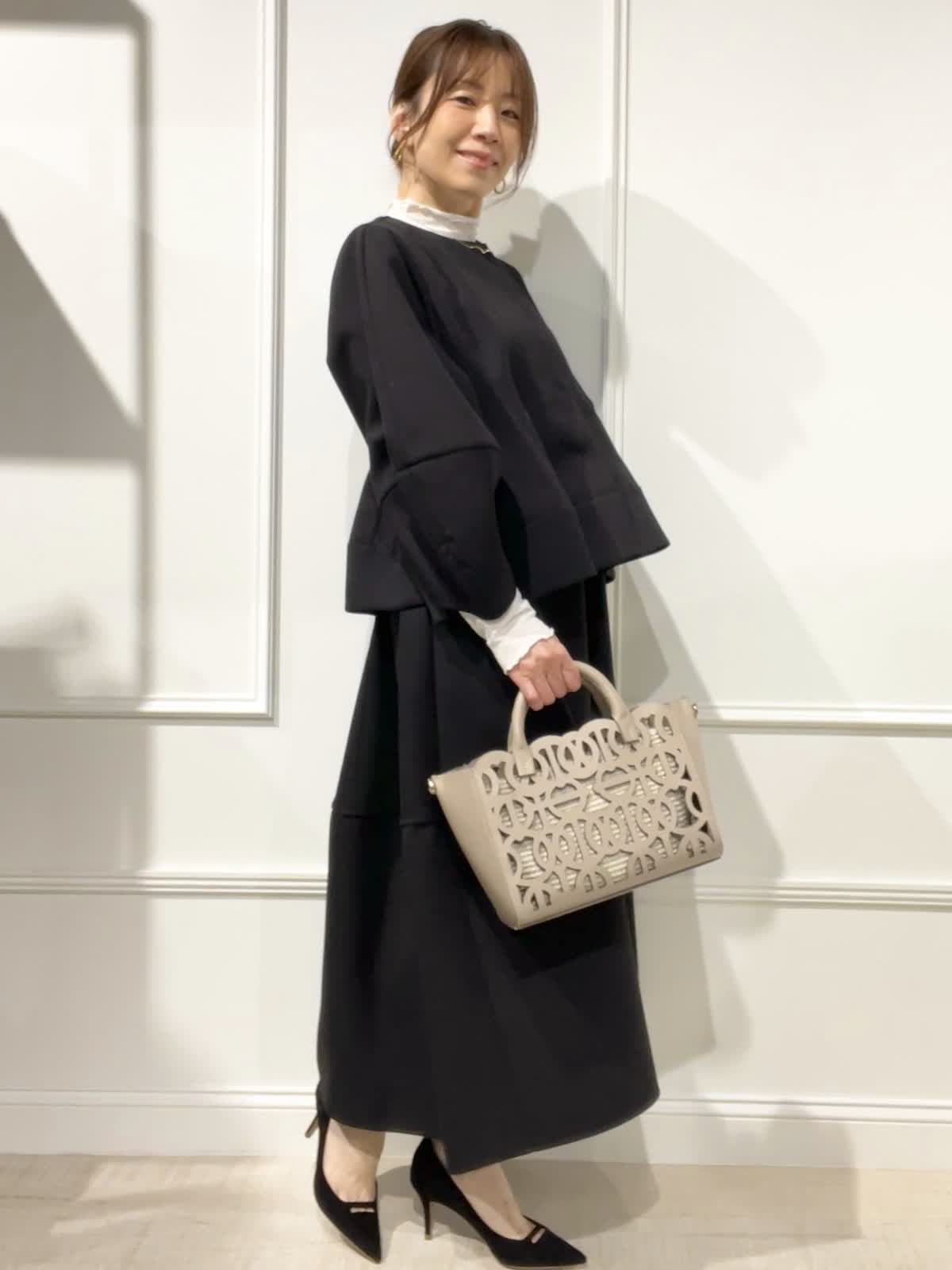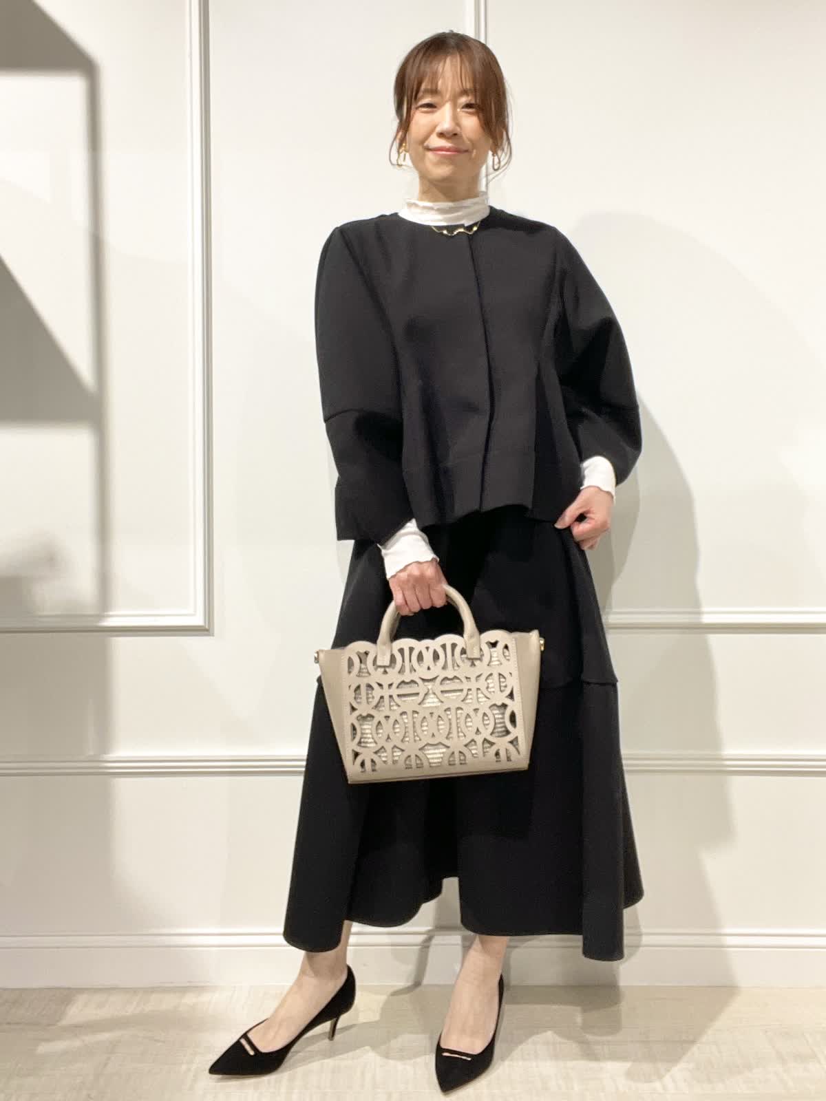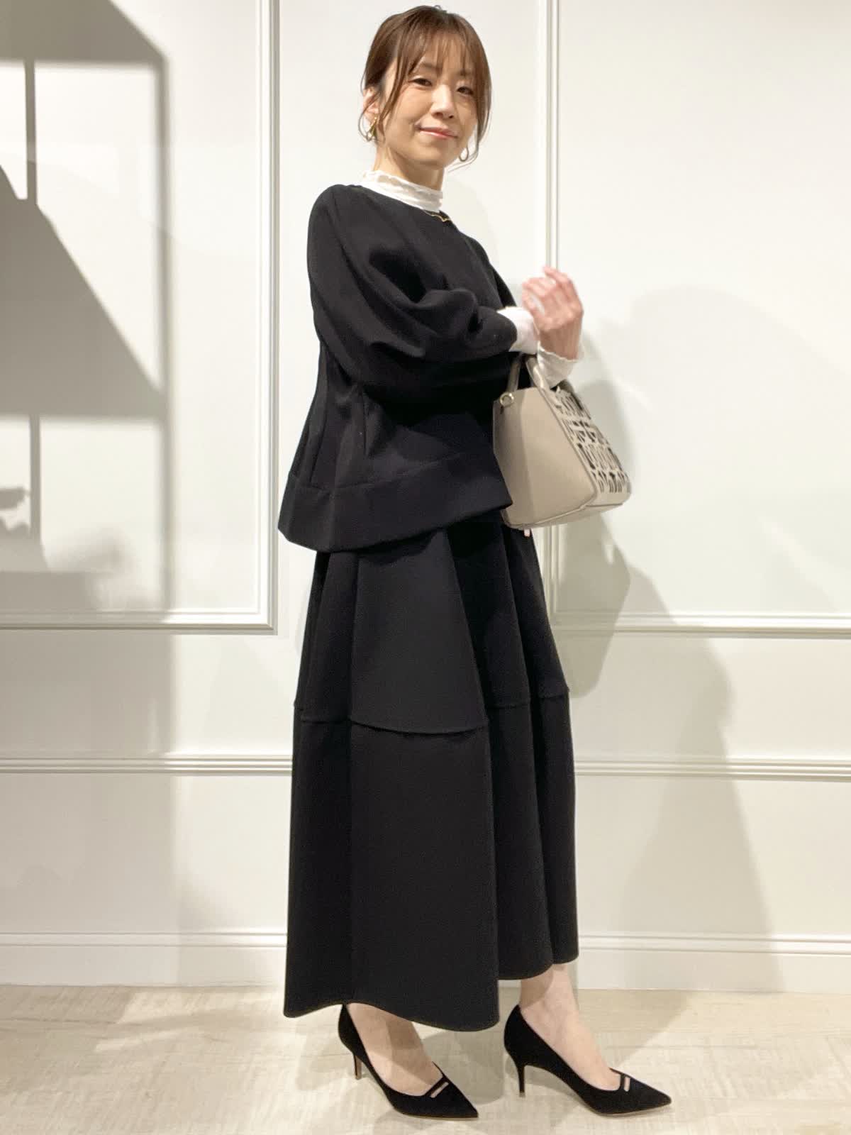 【着用アイテム:カラー/サイズ】 ジャケット:ブラック/9号 スカート:ブラック/9号 テレコカットソー:オフホワイト/9号 ぽわん袖とペプラムラインが可愛いジャケットは、羽織るだけでオシャレ感でます。インナーにシアーカットソーを合わせました。セットアップで着るとセレモニーにもOK。スカートは切替えで、裾の広がりが抑えられているのが大人可愛いスタイルです。