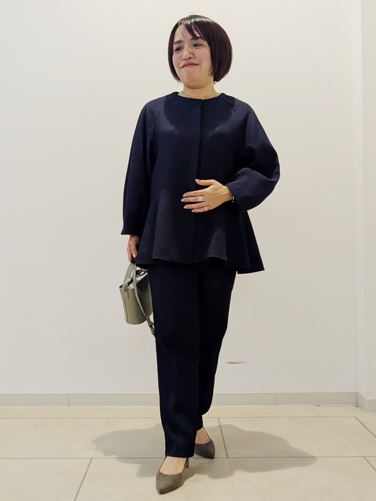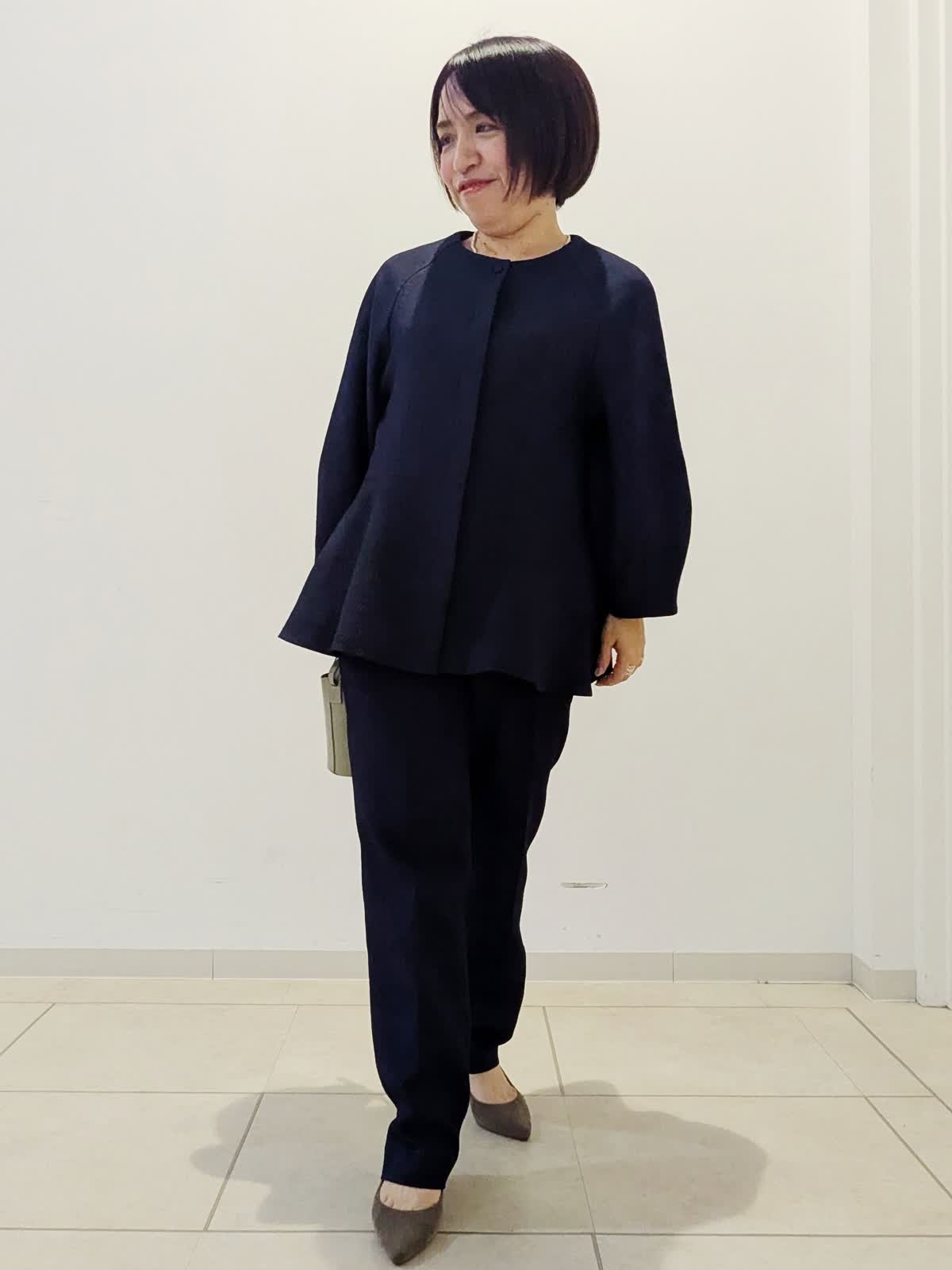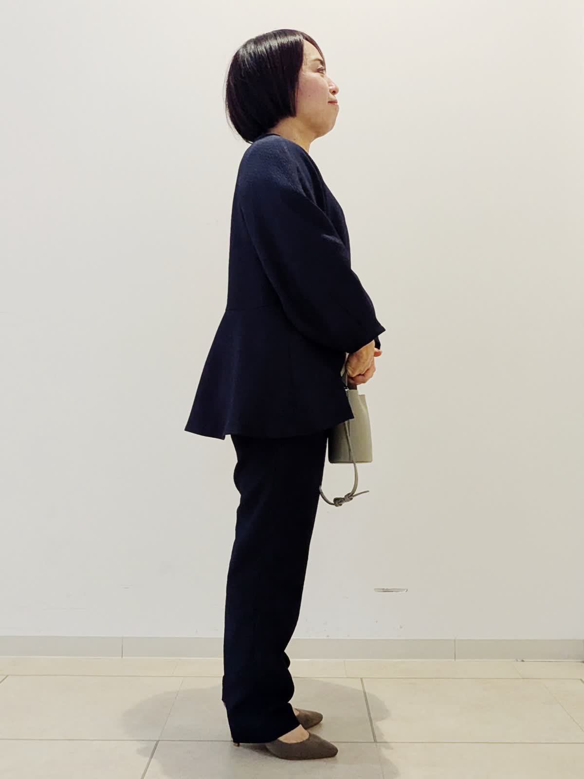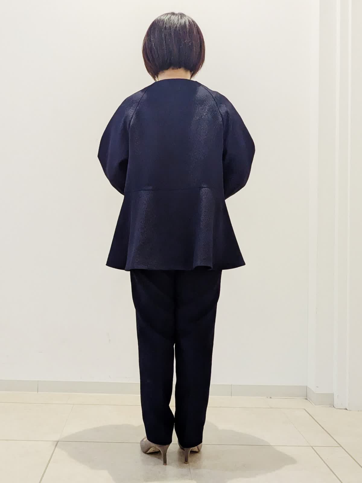 【着用サイズ】ブラウス:9号 パンツ:9号【着用カラー】ブラウス:ネイビー パンツ:ネイビー 着回し度抜群!ハレの日コーデです。優しい風合いのポコポコとした表面感がかわいいジャガード素材のセットアップ。ほんのり裾に向かって広がるシルエットが上品です。ハレの日?お仕事まで幅広くお使いいただけます。
