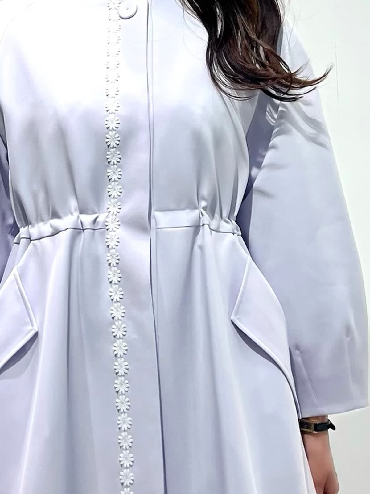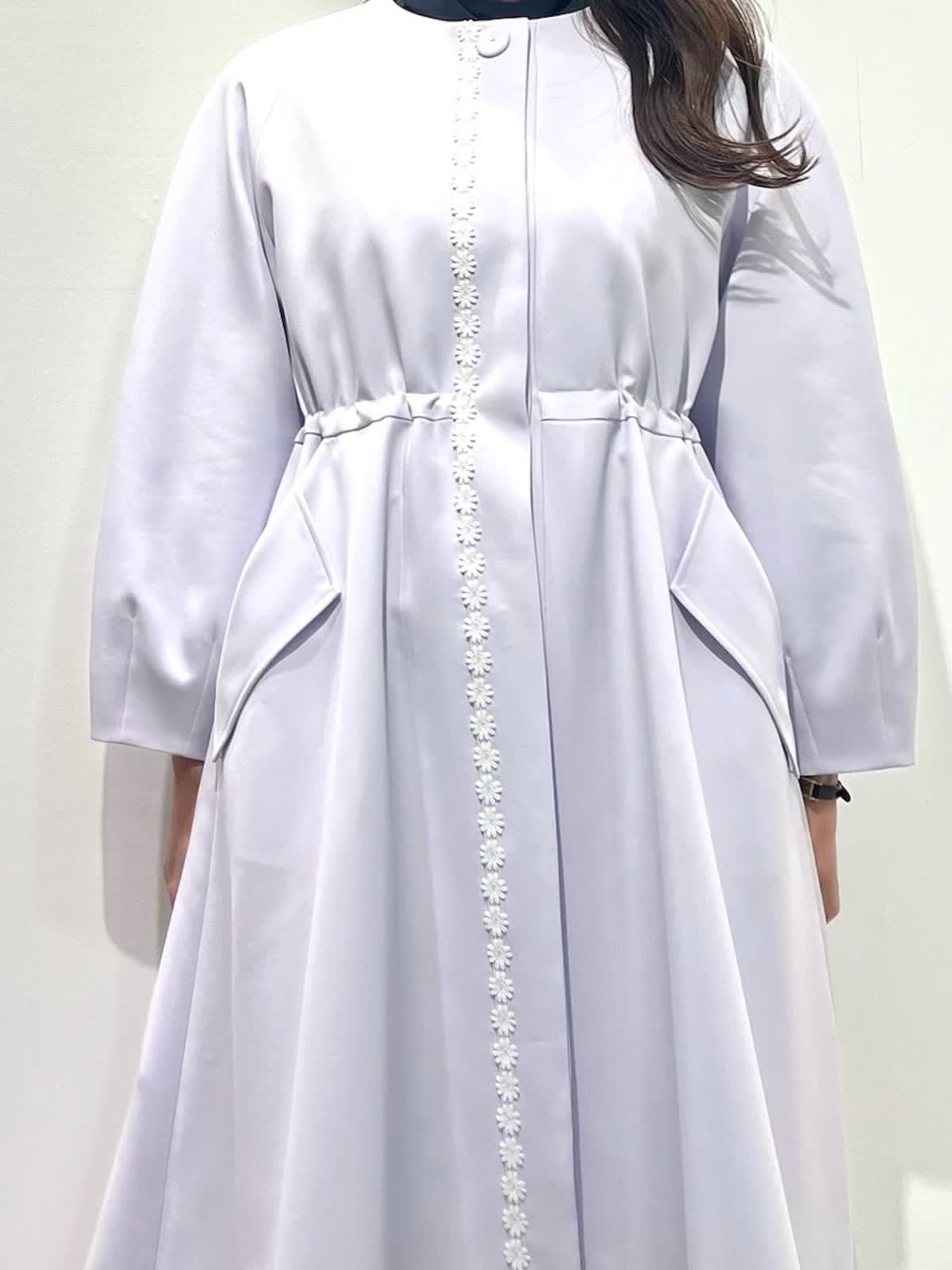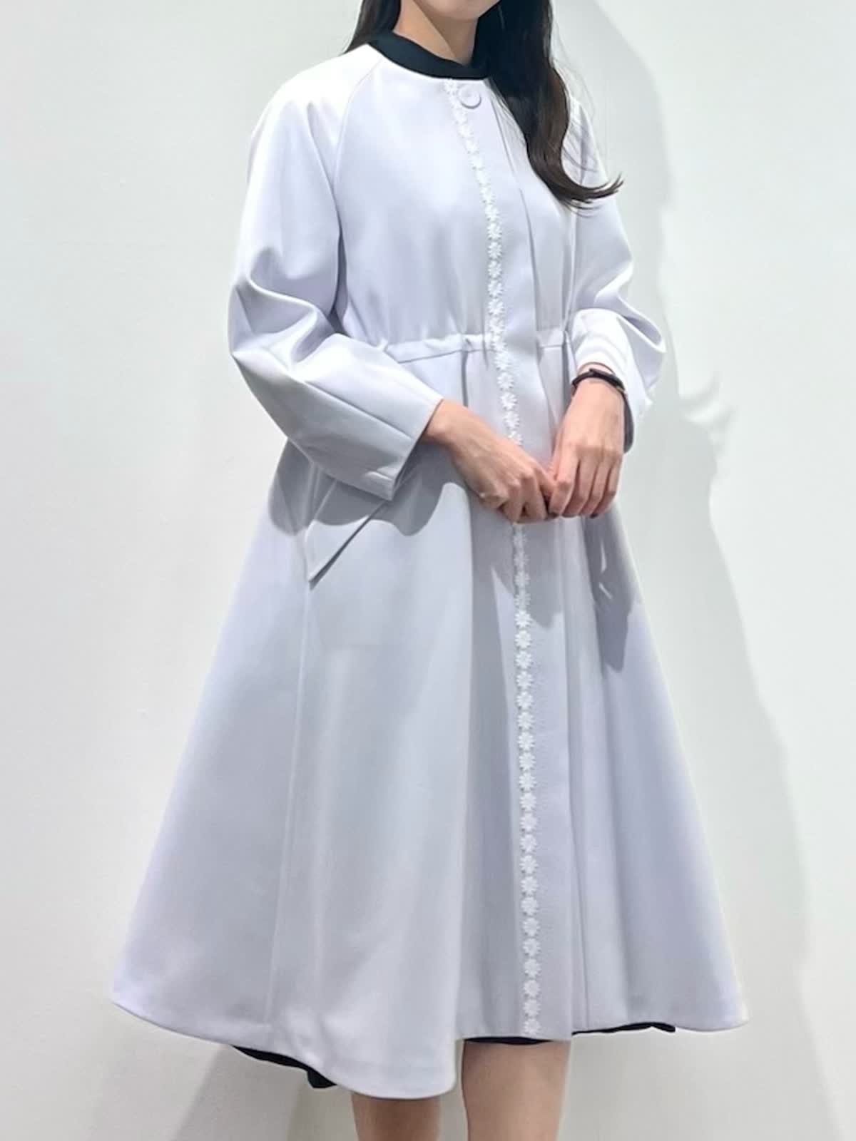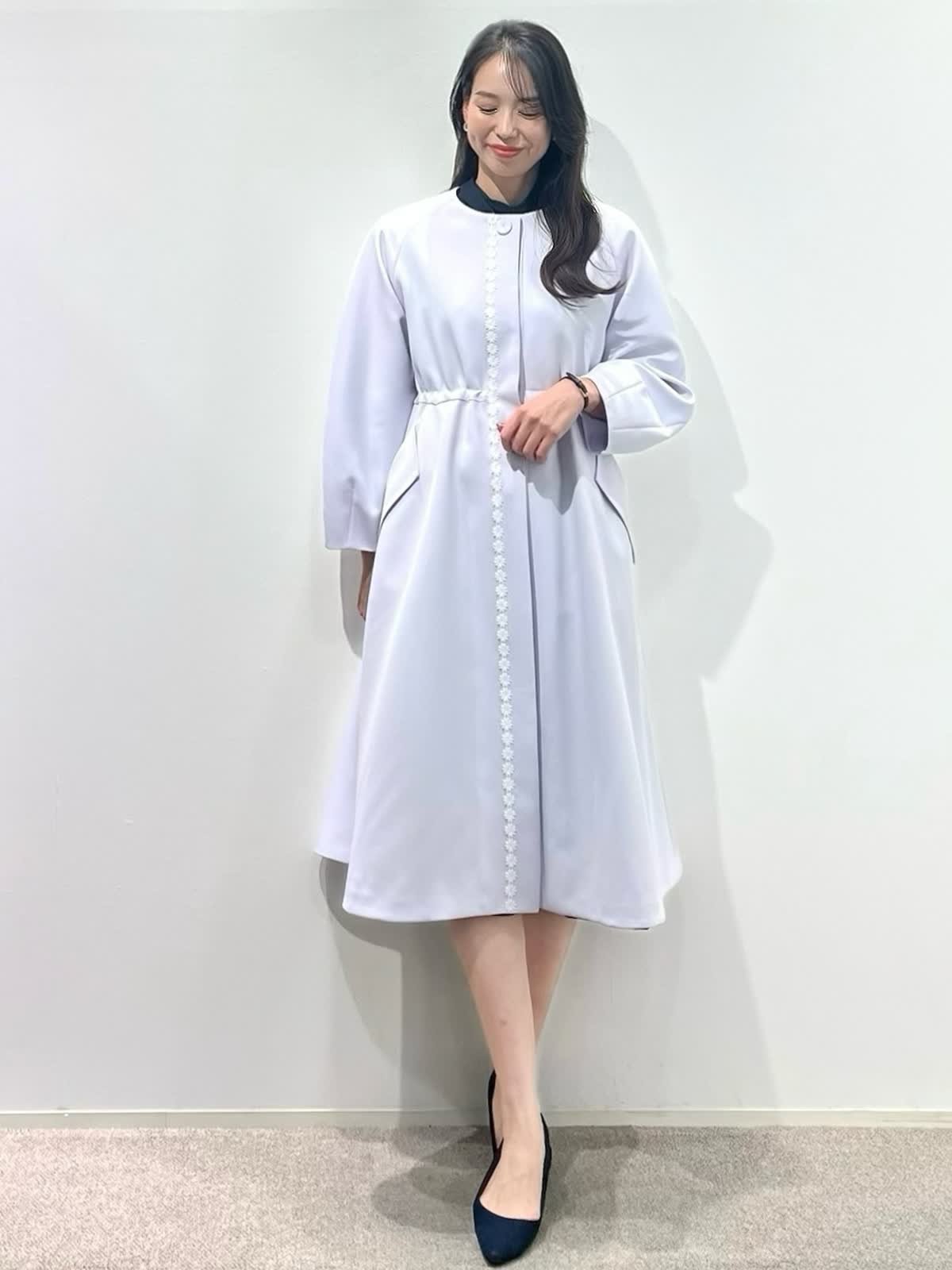 【着用サイズ】コート:9号 ワンピース:9号 【着用カラー】コート:ラベンダー ワンピース:ネイビー 「上品フェミニン春のお出かけコート」 上品なフラワーレースが施されたフェミニンなデザインコート。フィット&フレアで、ウエストは内側のゴムで調整して絞ると、スタイルアップして見えるシルエットに。前を閉じるとワンピース風に見えてきちんと感のある装いに。お出かけや、デイリーにも華やかに着こなせるおすすめのデザインです。ワンピースは、ストレスフリーのボウタイ付きワンピース。セレモニーや、きちんと感のある装いにも活躍する万能デザインです。