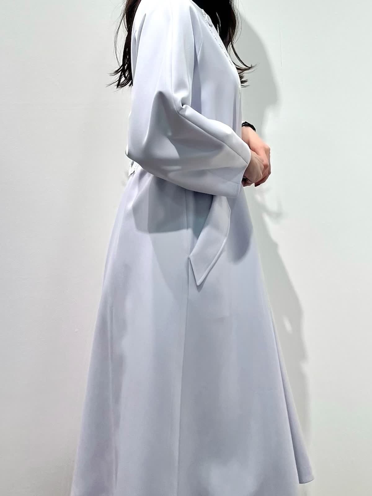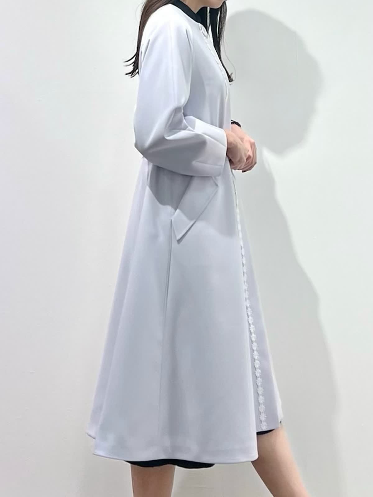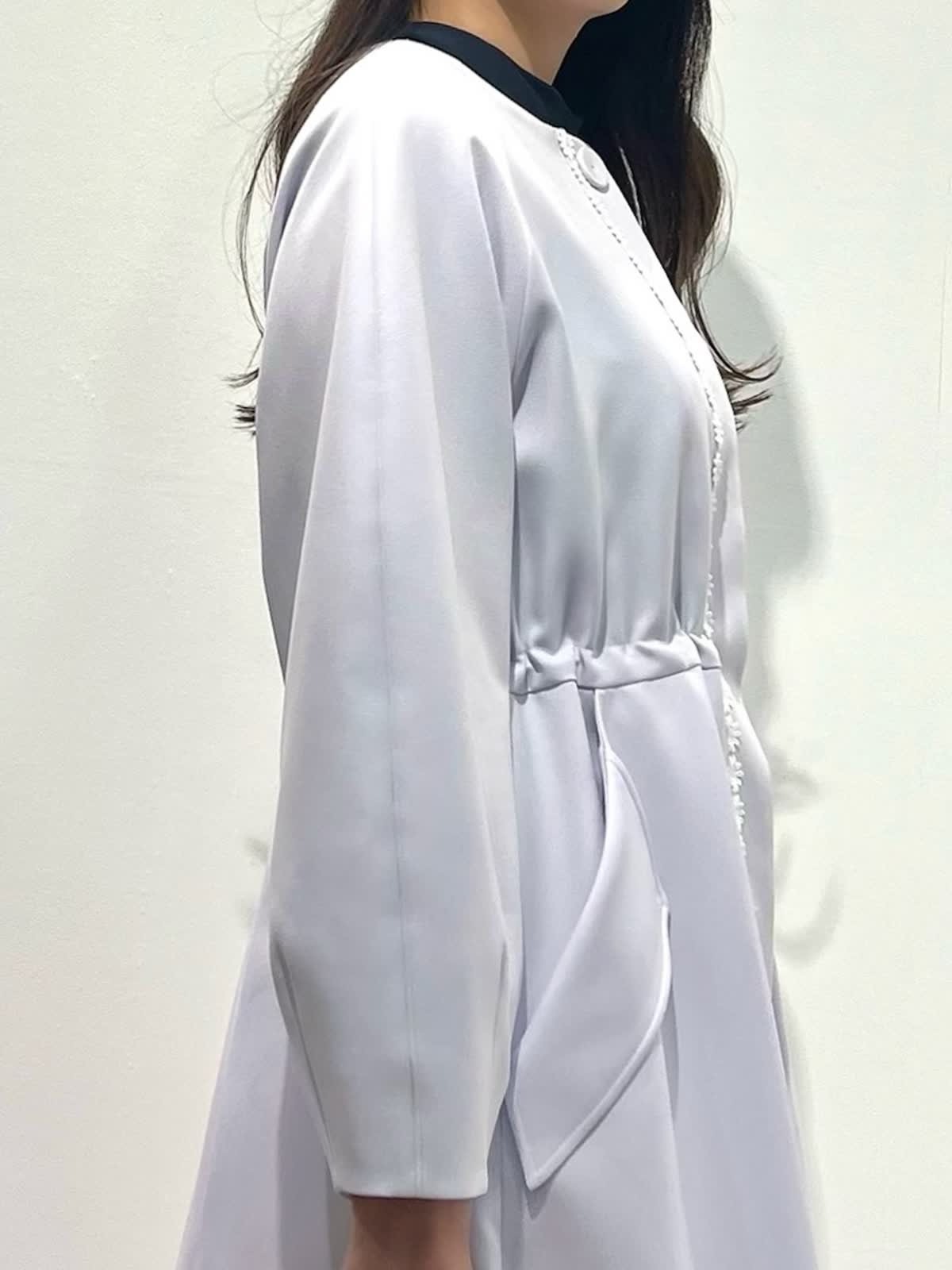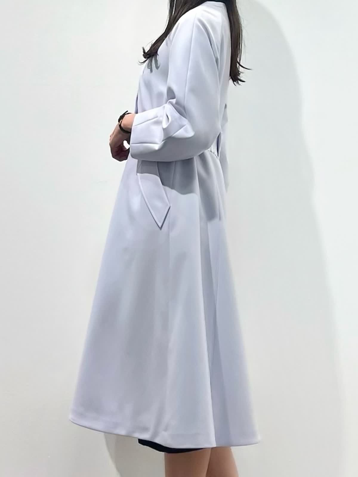 【着用サイズ】コート:9号 ワンピース:9号 【着用カラー】コート:ラベンダー ワンピース:ネイビー 「上品フェミニン春のお出かけコート」 上品なフラワーレースが施されたフェミニンなデザインコート。フィット&フレアで、ウエストは内側のゴムで調整して絞ると、スタイルアップして見えるシルエットに。前を閉じるとワンピース風に見えてきちんと感のある装いに。お出かけや、デイリーにも華やかに着こなせるおすすめのデザインです。ワンピースは、ストレスフリーのボウタイ付きワンピース。セレモニーや、きちんと感のある装いにも活躍する万能デザインです。