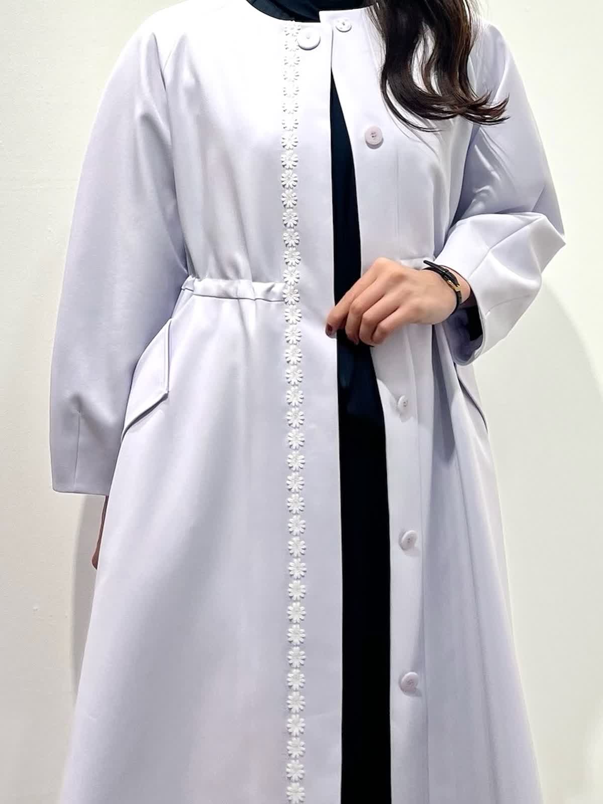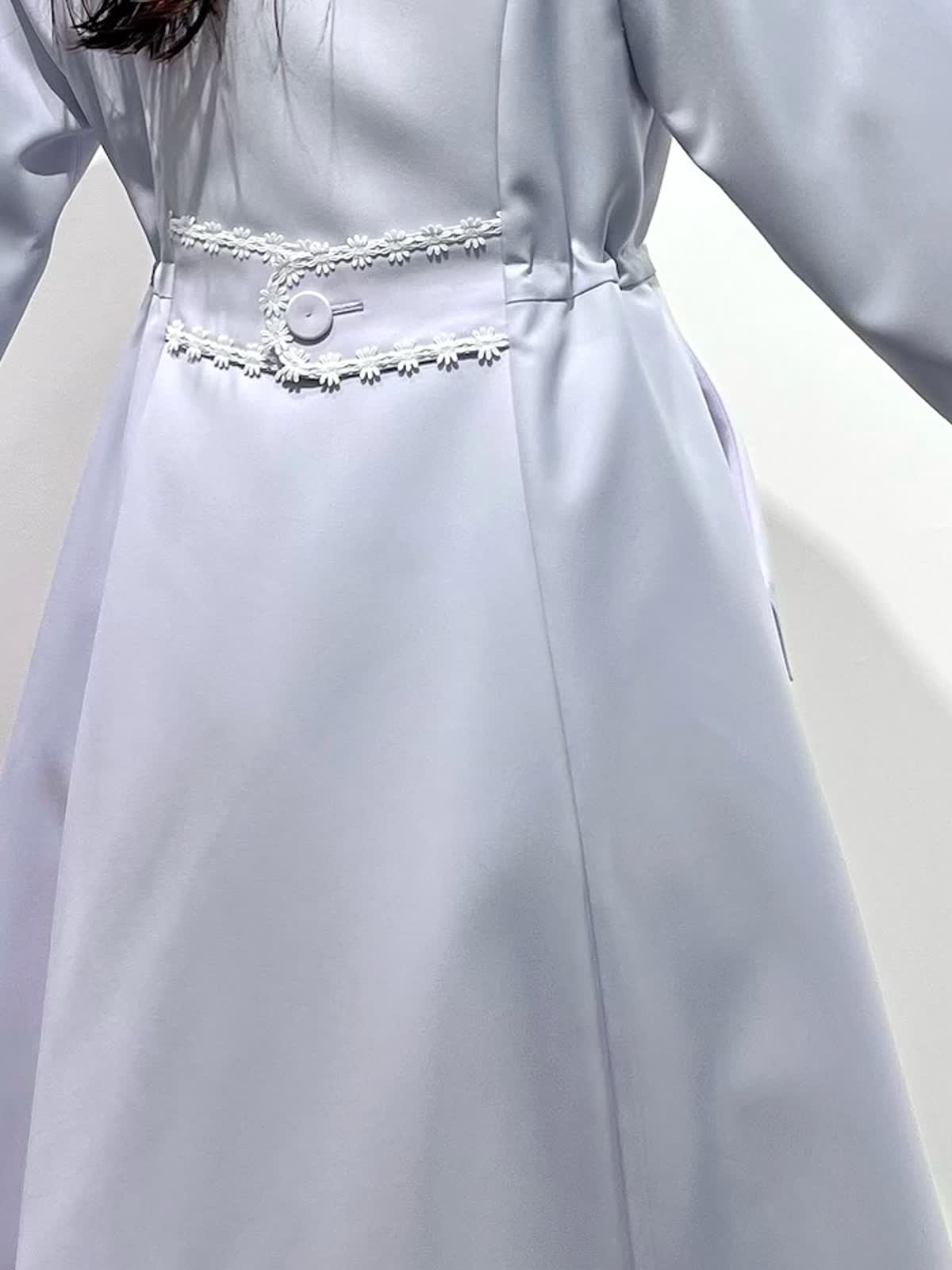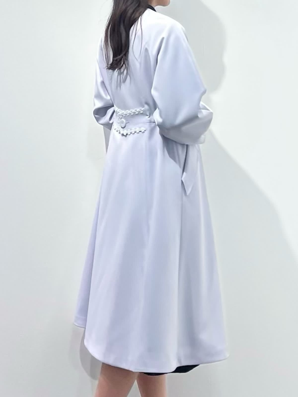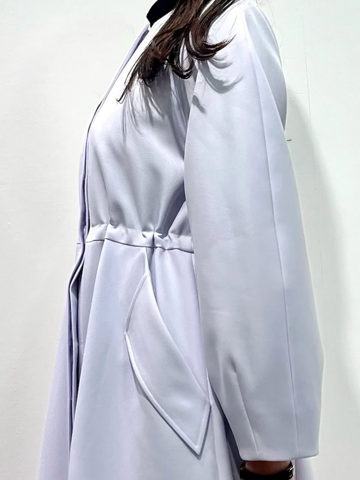 【着用サイズ】コート:9号 ワンピース:9号 【着用カラー】コート:ラベンダー ワンピース:ネイビー 「上品フェミニン春のお出かけコート」 上品なフラワーレースが施されたフェミニンなデザインコート。フィット&フレアで、ウエストは内側のゴムで調整して絞ると、スタイルアップして見えるシルエットに。前を閉じるとワンピース風に見えてきちんと感のある装いに。お出かけや、デイリーにも華やかに着こなせるおすすめのデザインです。ワンピースは、ストレスフリーのボウタイ付きワンピース。セレモニーや、きちんと感のある装いにも活躍する万能デザインです。