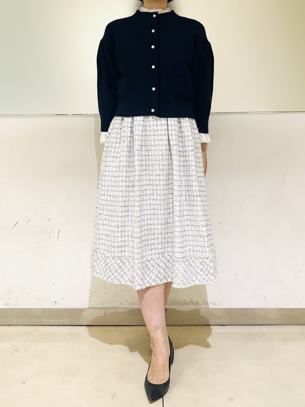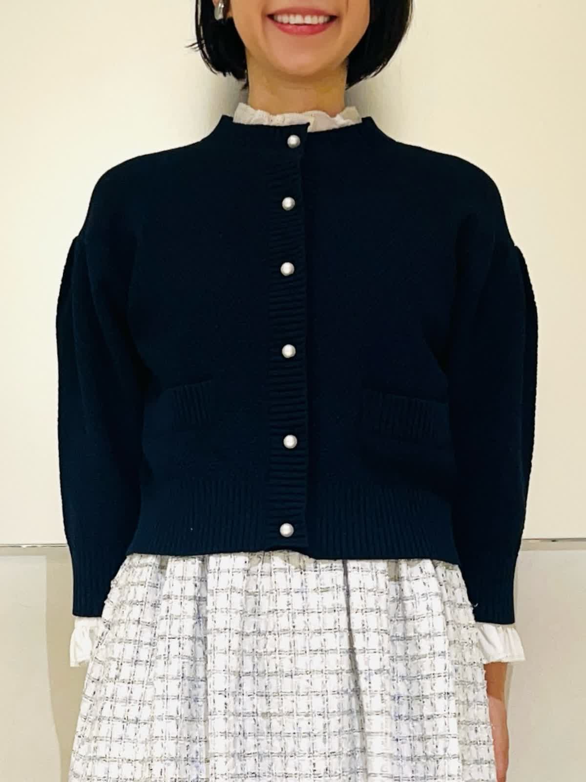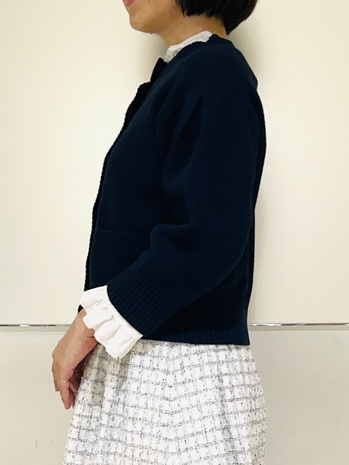 【着用アイテム】すべてにおいて 【着用カラー】カーディガン:ネイビー ブラウス:オフホワイト:スカート:サックス 春のフェミニンお出かけコーディネート。パールボタンが可愛いカーディガンはざっくりとしたミドルゲージで寒い時期から着られます。程よいゆとりでブラウスとのレイヤードもしやすいです。首元と袖口からぶらのフリルがチラ見えする感じも可愛いです。