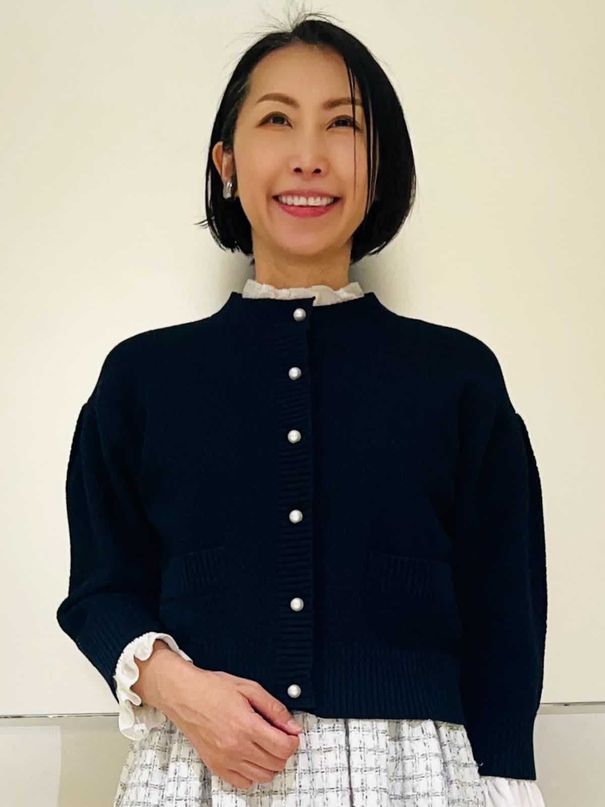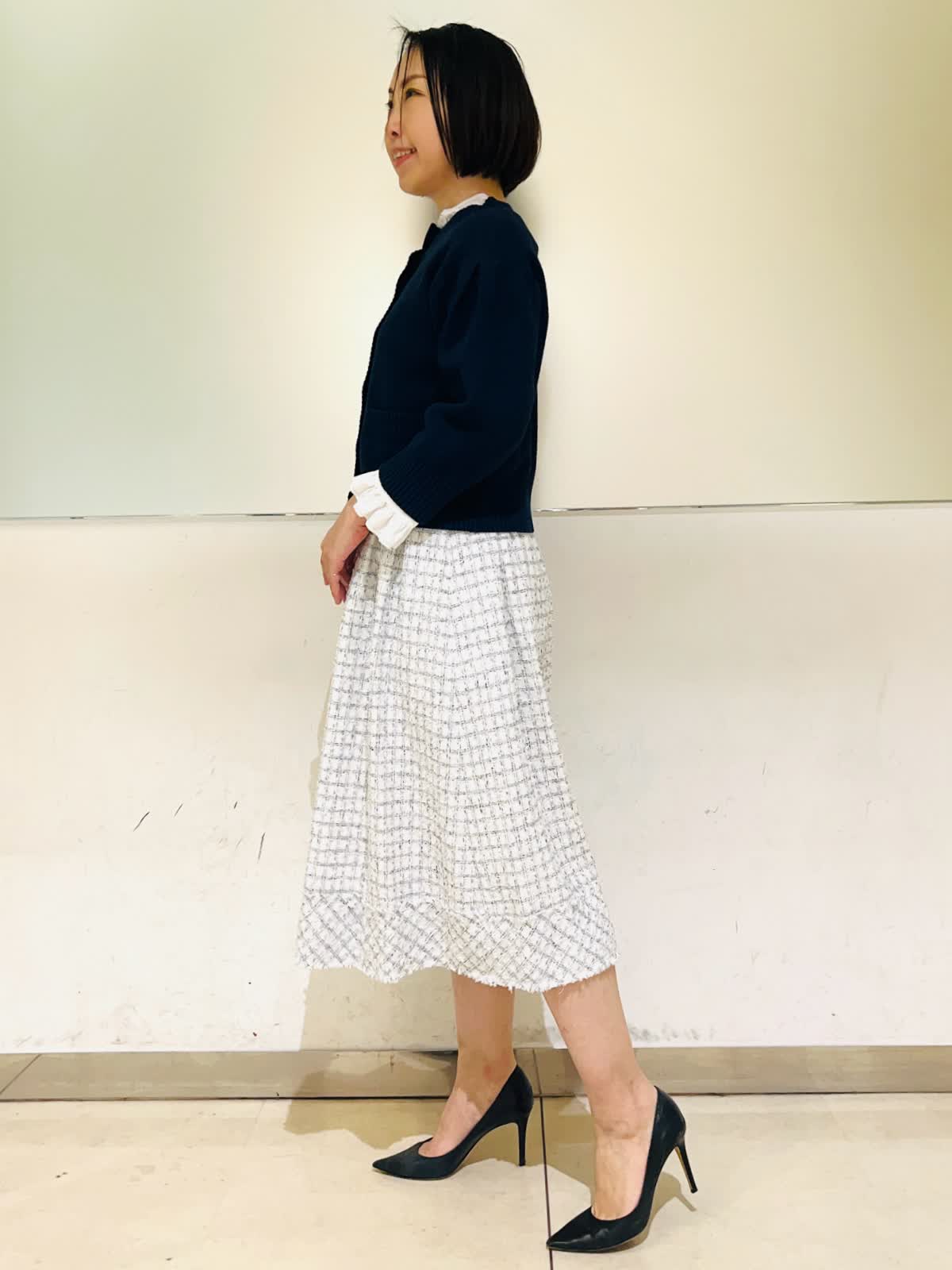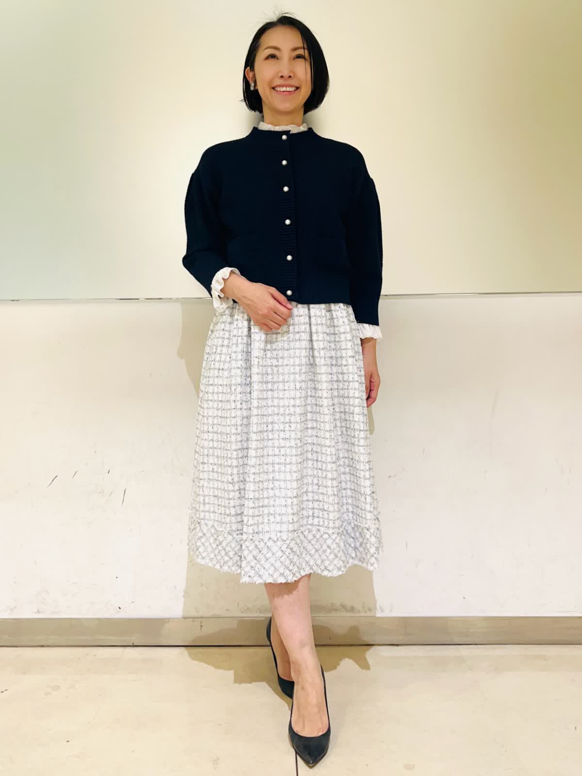 【着用アイテム】すべてにおいて 【着用カラー】カーディガン:ネイビー ブラウス:オフホワイト:スカート:サックス 春のフェミニンお出かけコーディネート。パールボタンが可愛いカーディガンはざっくりとしたミドルゲージで寒い時期から着られます。程よいゆとりでブラウスとのレイヤードもしやすいです。首元と袖口からぶらのフリルがチラ見えする感じも可愛いです。