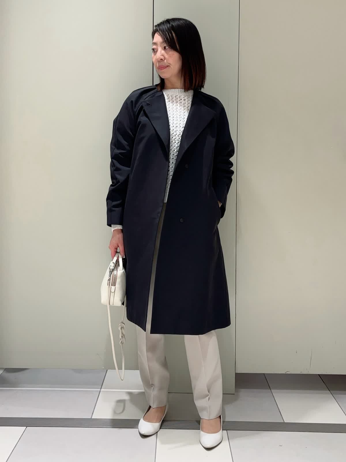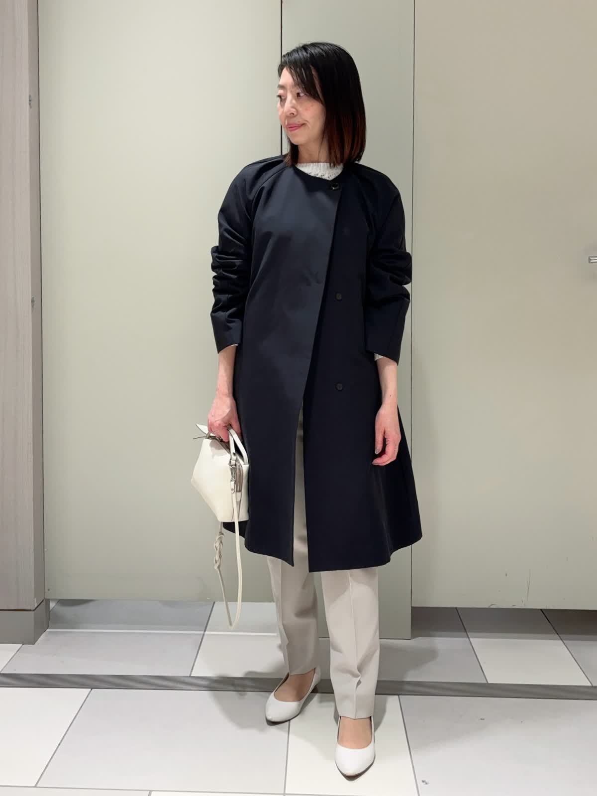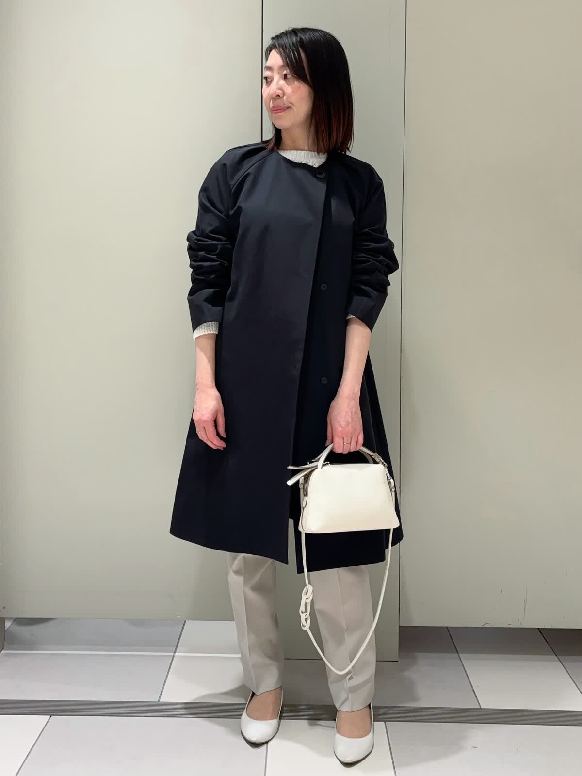 【着用サイズ】コート:9号 ニット:9号 パンツ:7号 【着用カラー】コート:ネイビー ニット:オフホワイト パンツ:グレーベージュ 軽くて気軽に羽織れるノーカラーのスプリングコート。程よいAラインシルエットでONにもOFFにも活躍します。肩に入ったタックとゆったりラグランスリーブがさりげないポイント。前を開けてラフに、閉じてすっきりと。2WAYで着こなしを楽しめます。