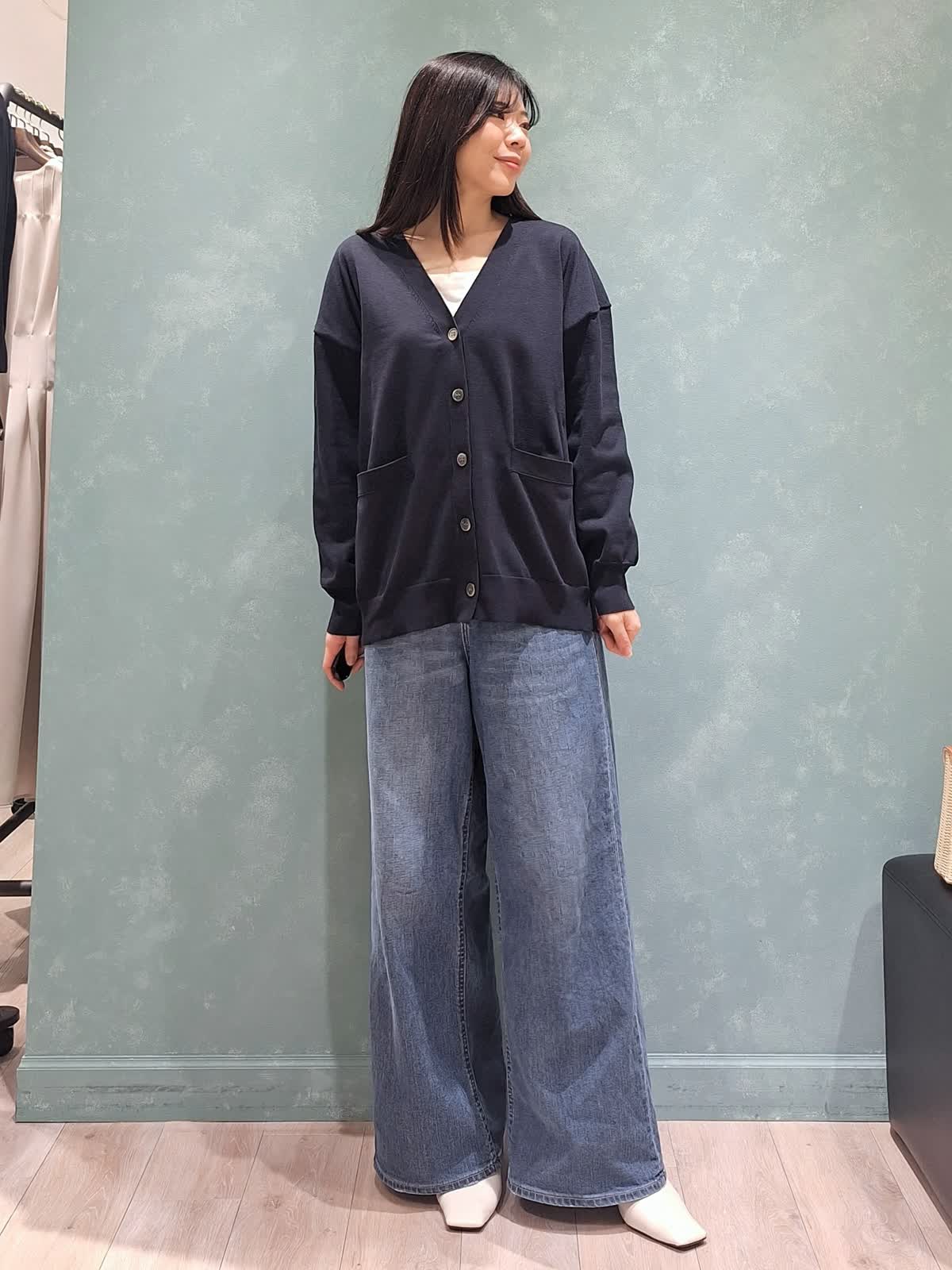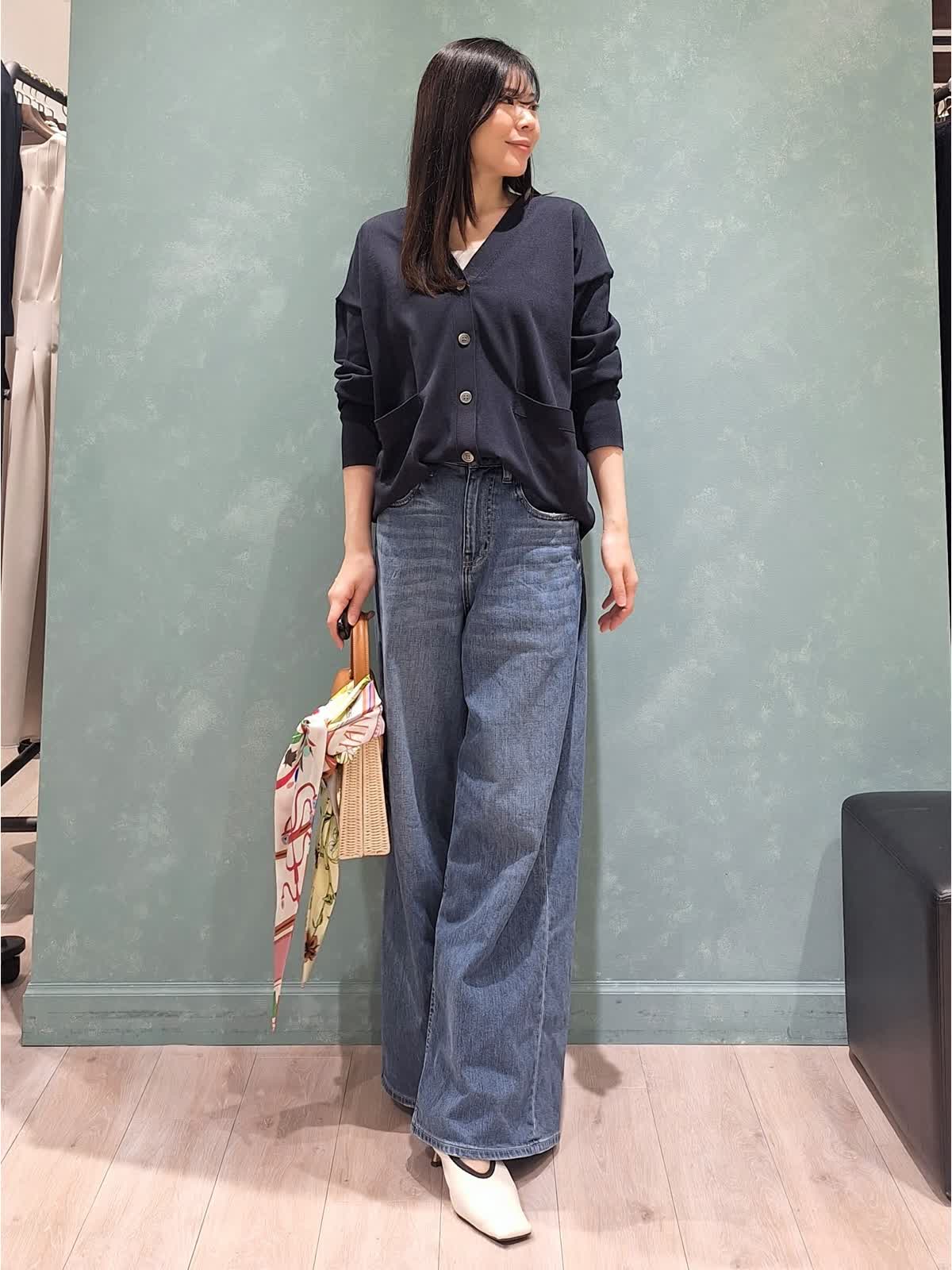 【着用サイズ、カラー】カーディガン:9号、ネイビー パンツ:5号、インディゴ 大人かっこいい休日カジュアルスタイル。ゆったり着れるVネックカーディガンをプルオーバーで着用。前はデニムにイン、バックは少し抜かしてお袖はブラウジング。ボトムはINED別注ヘルシーデニムのバギーパンツを着用。かごバッグ&スカーフを合わせて大人のこなれカジュアルスタイルにコーディネートしました。ぜひお試し下さいませ☆