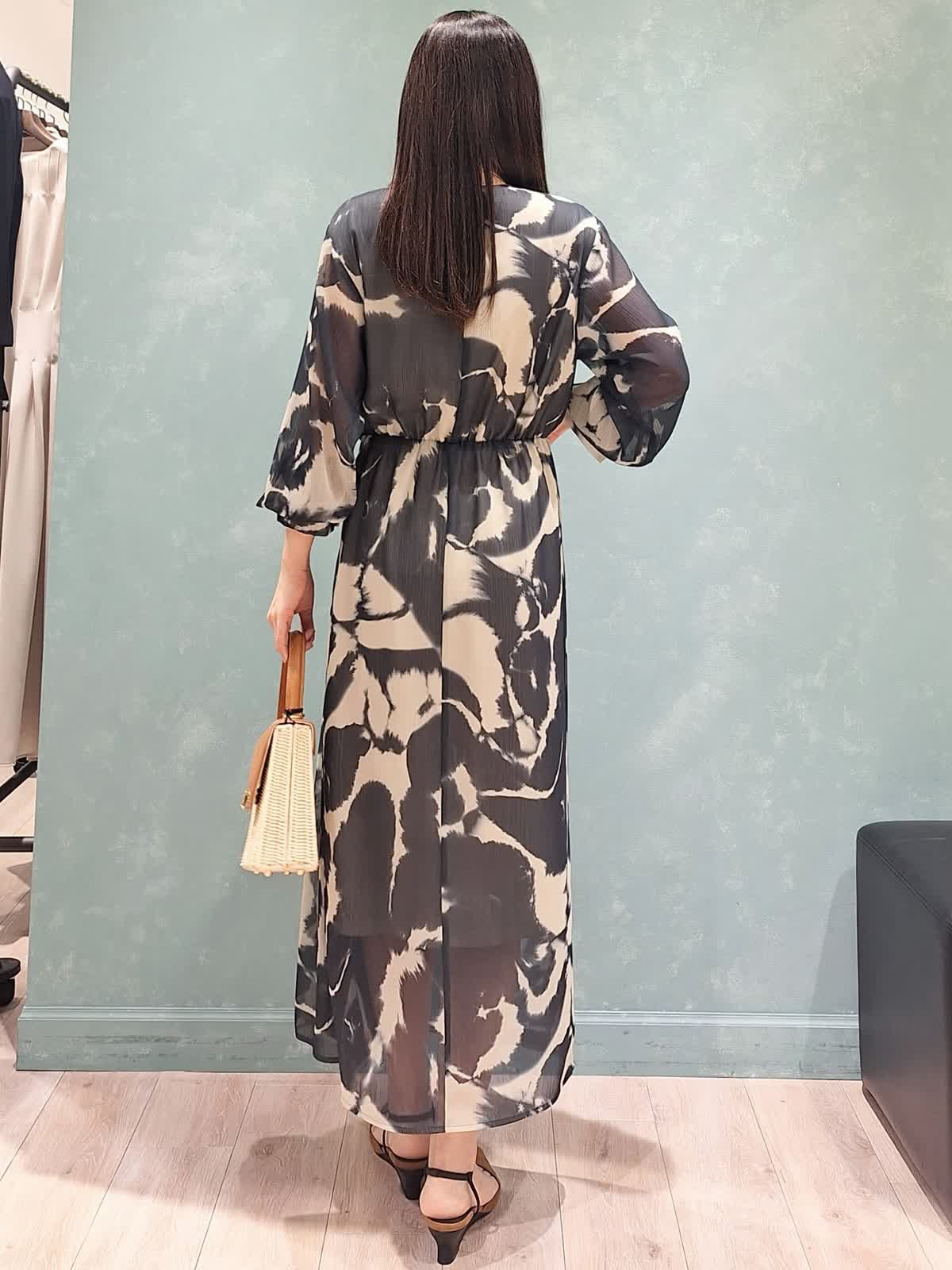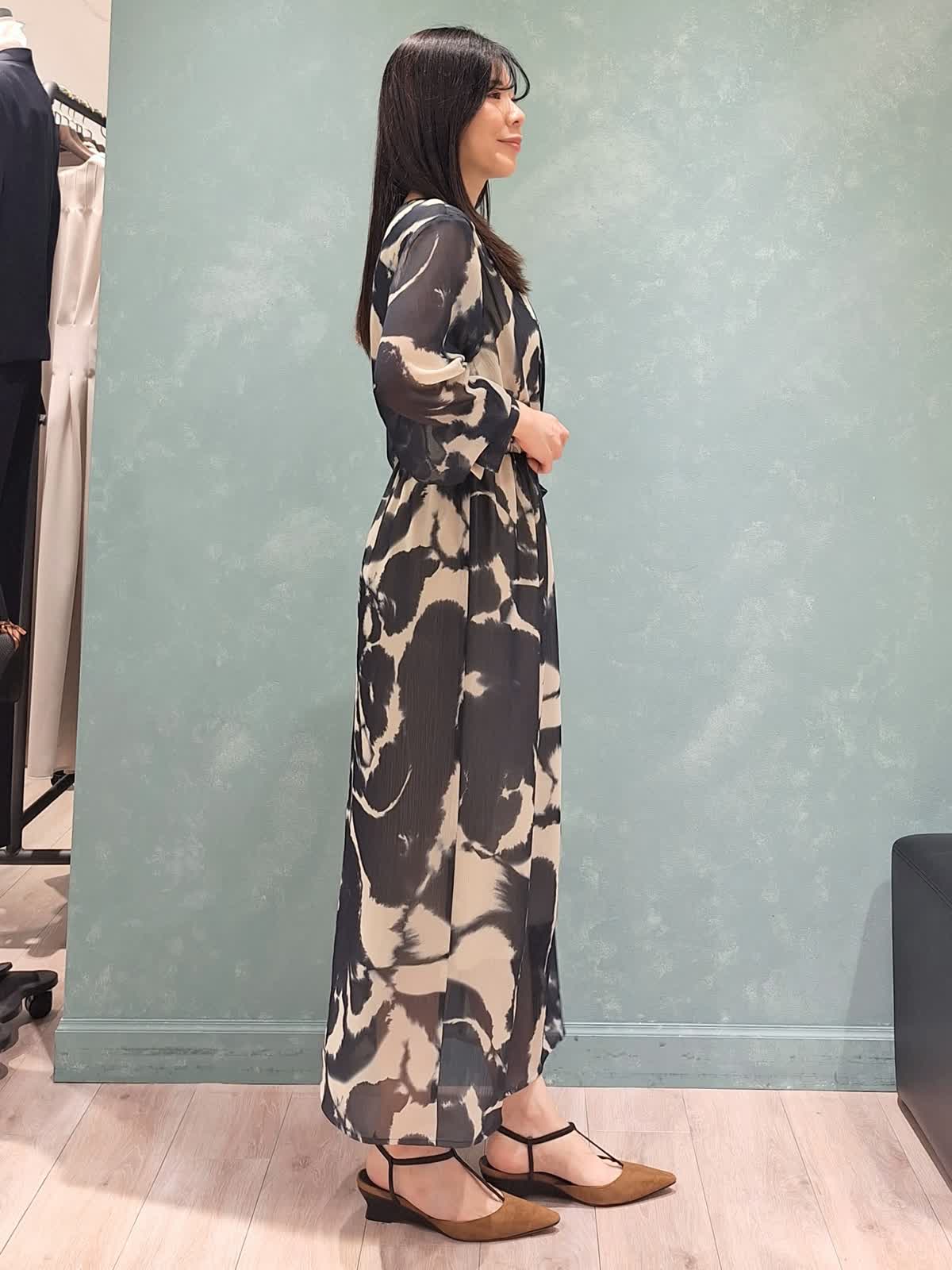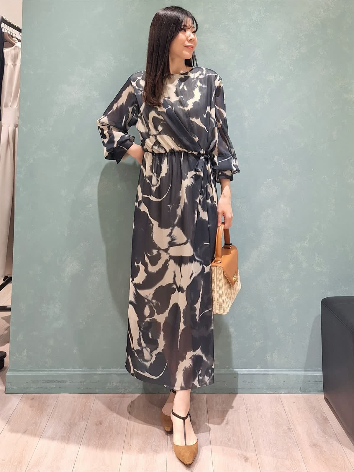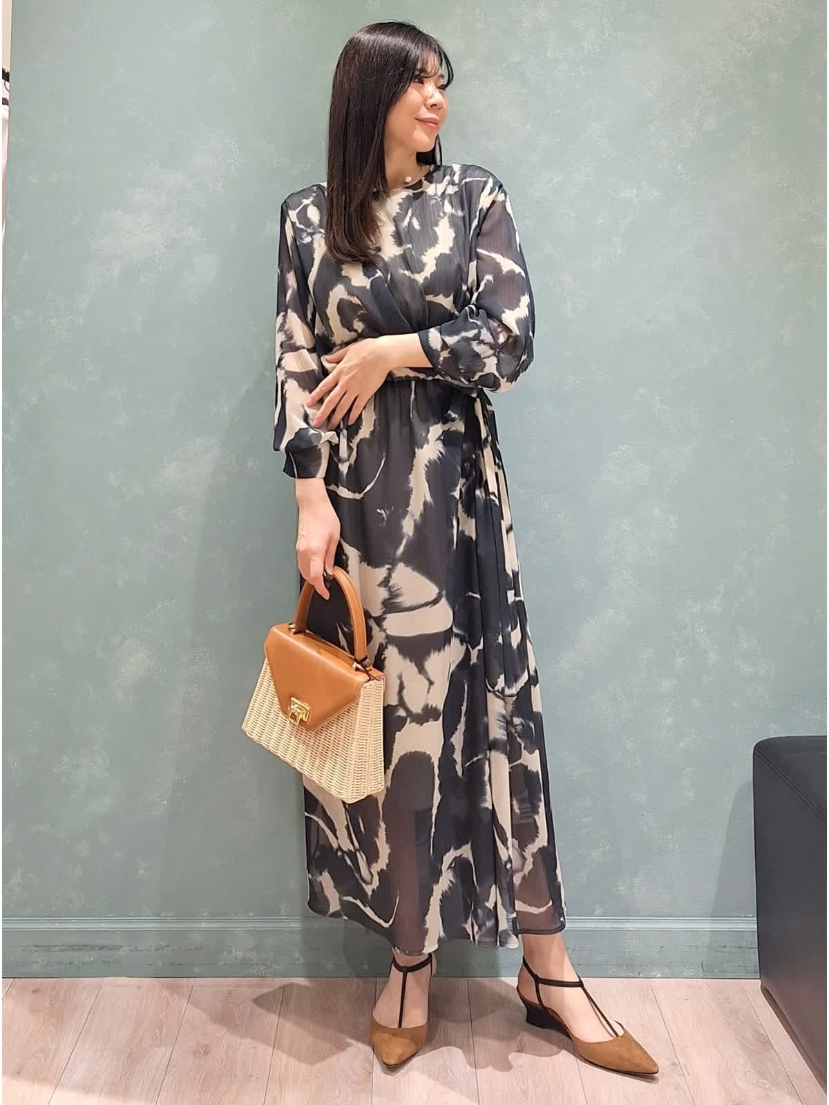 【着用サイズ、カラー】ワンピース:9号、ネイビー 大人のお洒落を楽しむなら、ラヴェイユの楊柳プリントワンピースがお勧め!一着で決まるプリントワンピース。ウエストはタイベルトで絞れるスタイルアップデザイン。歩く度に揺れる感じが女性らしくて上品。ラタンショルダーバッグを合わせて休日スタイルにコーディネートしました。