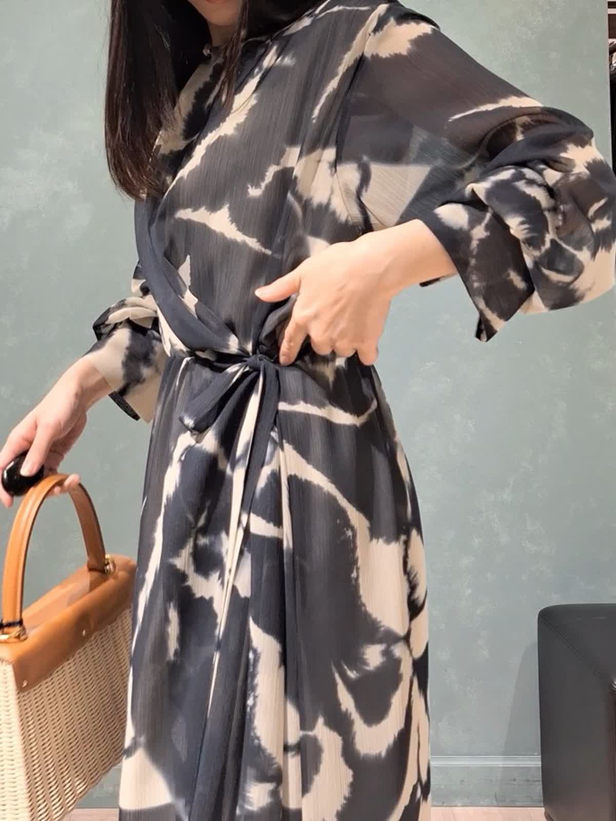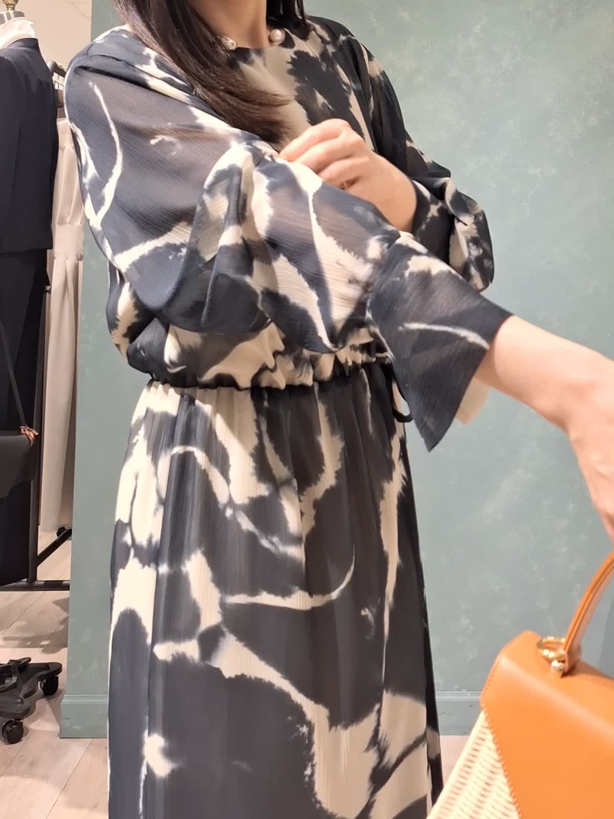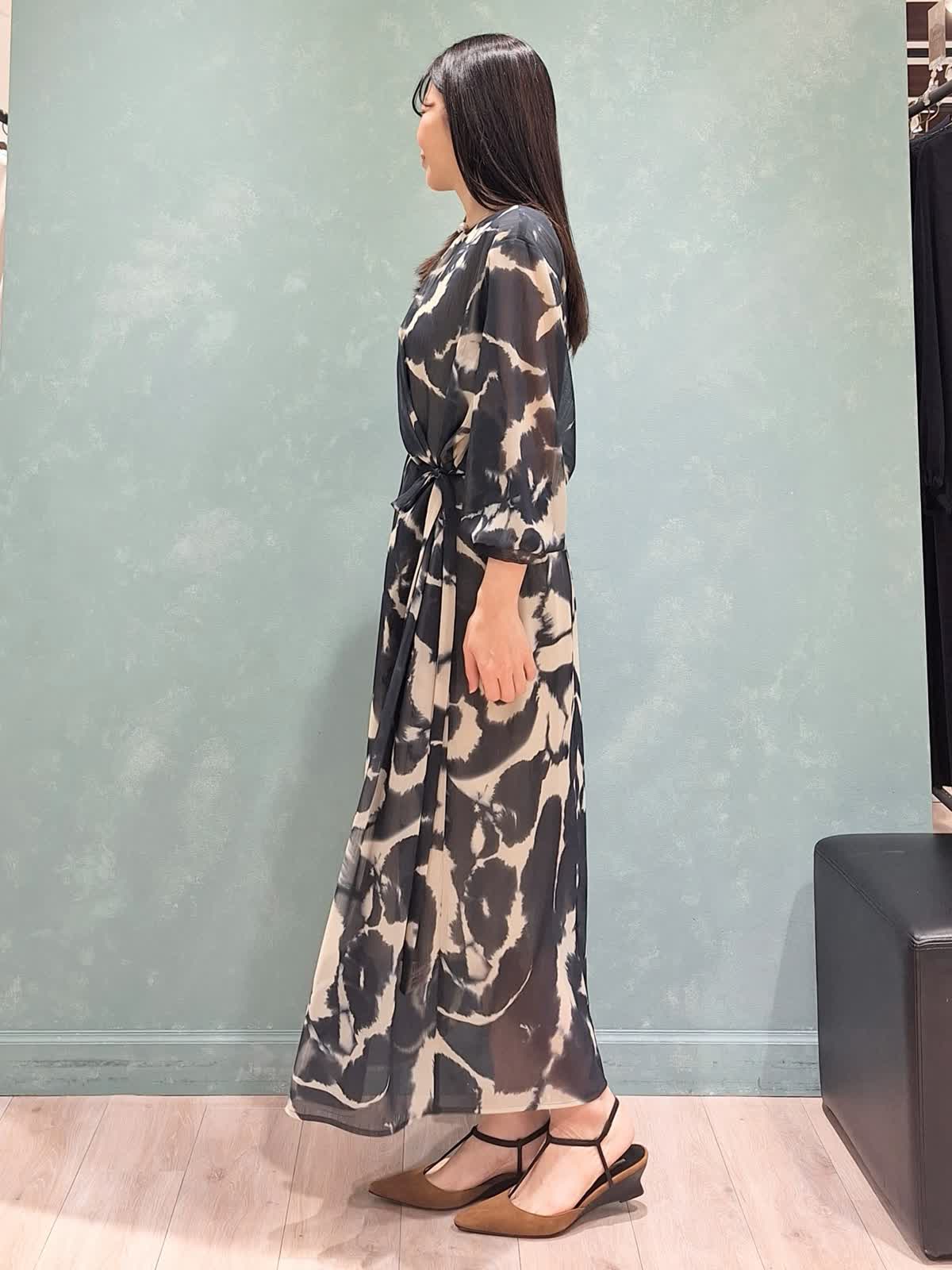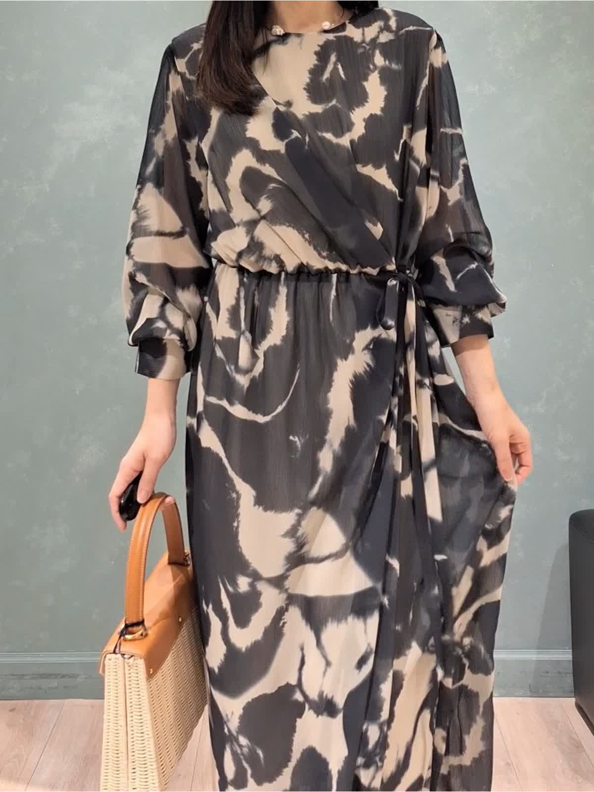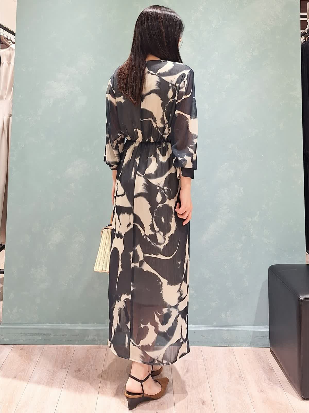 【着用サイズ、カラー】ワンピース:9号、ネイビー 大人のお洒落を楽しむなら、ラヴェイユの楊柳プリントワンピースがお勧め!一着で決まるプリントワンピース。ウエストはタイベルトで絞れるスタイルアップデザイン。歩く度に揺れる感じが女性らしくて上品。ラタンショルダーバッグを合わせて休日スタイルにコーディネートしました。