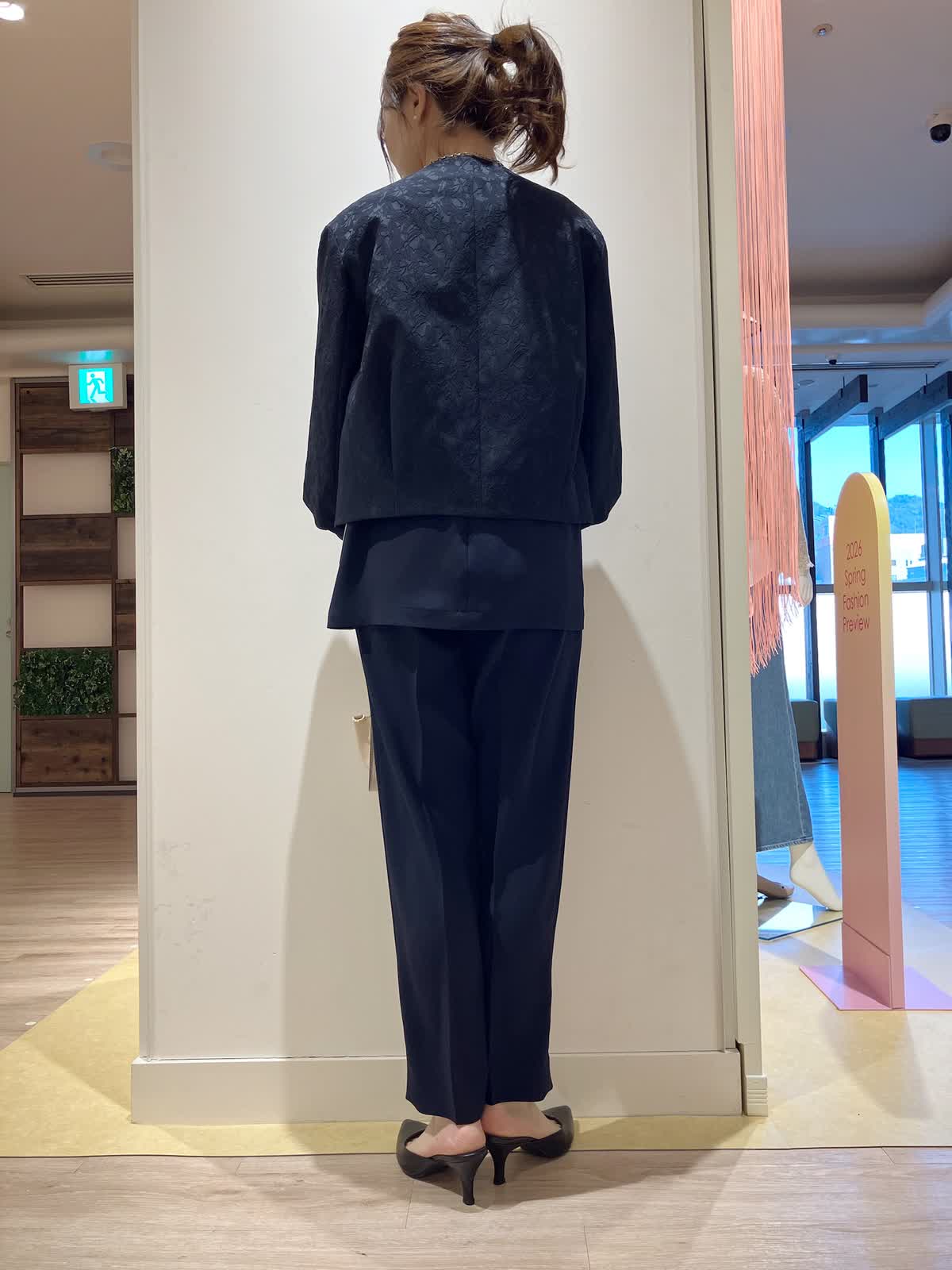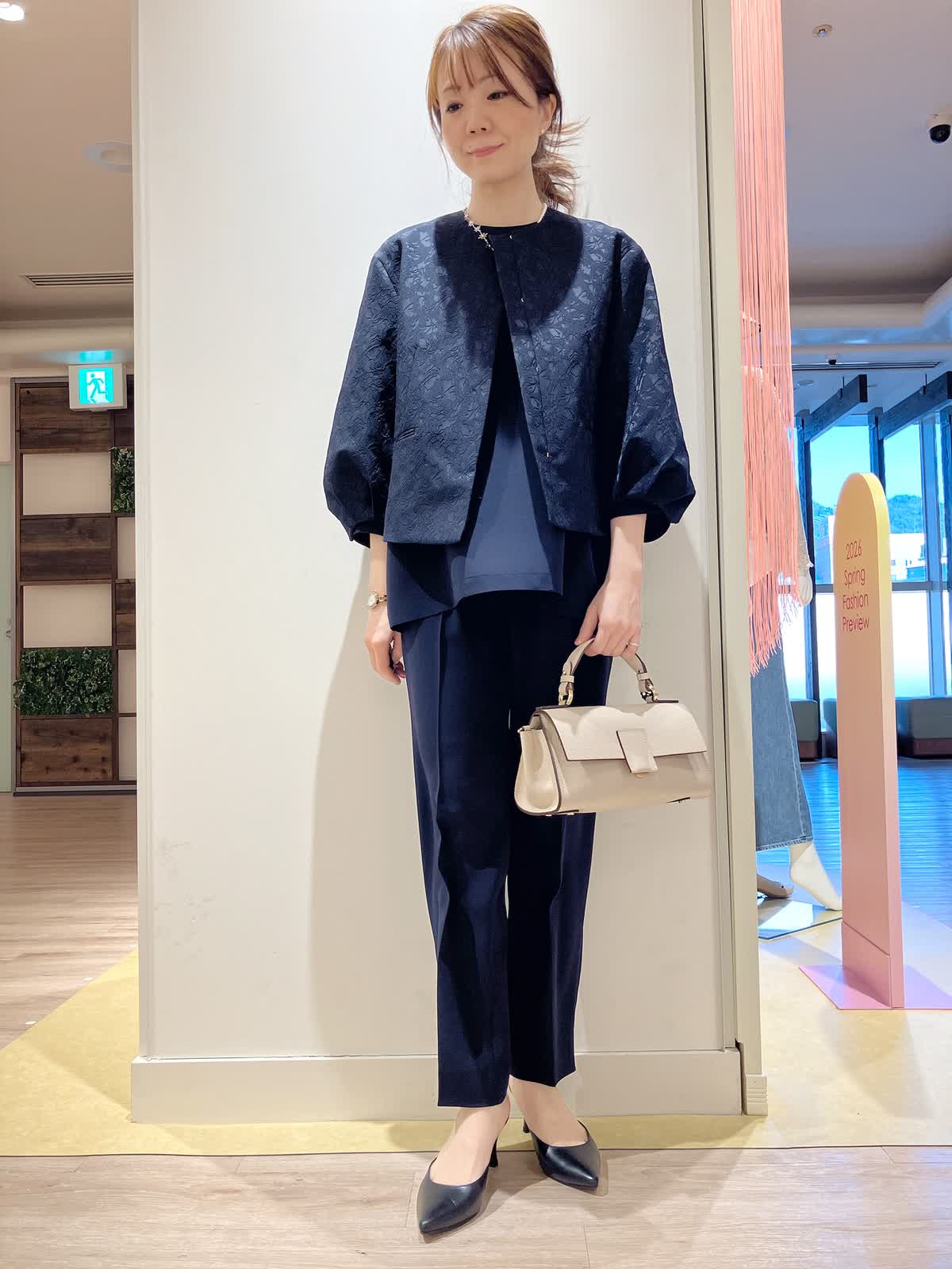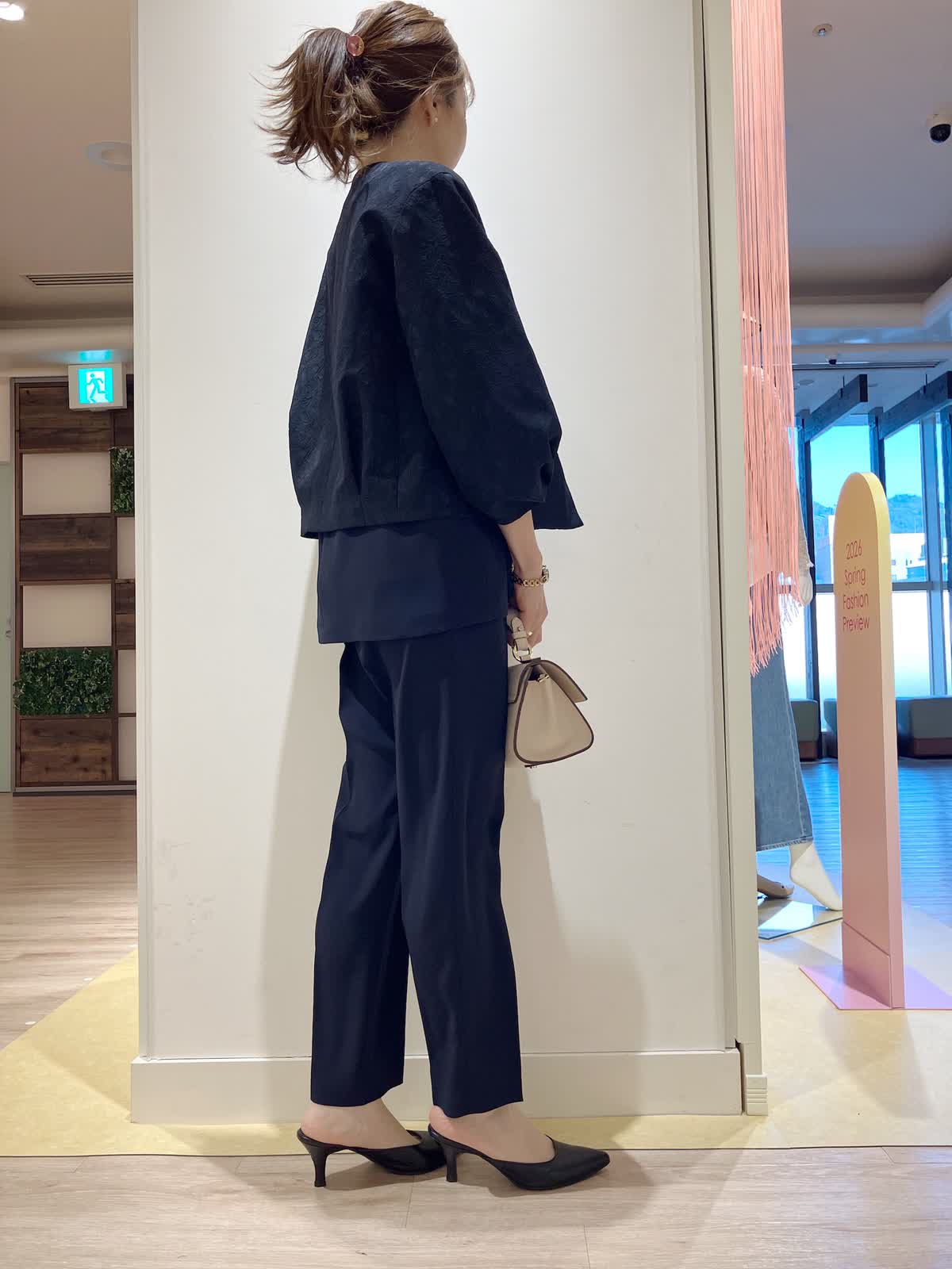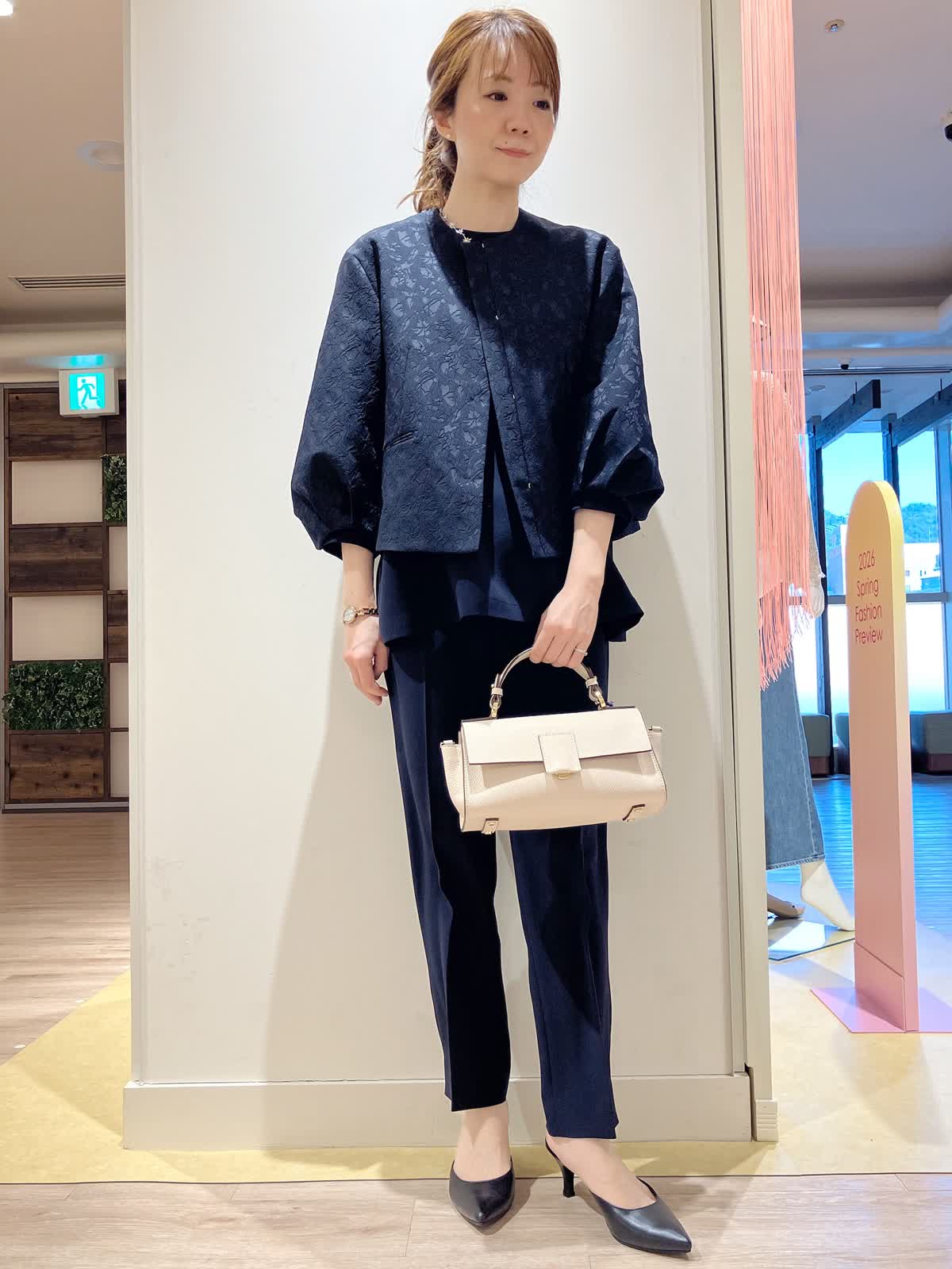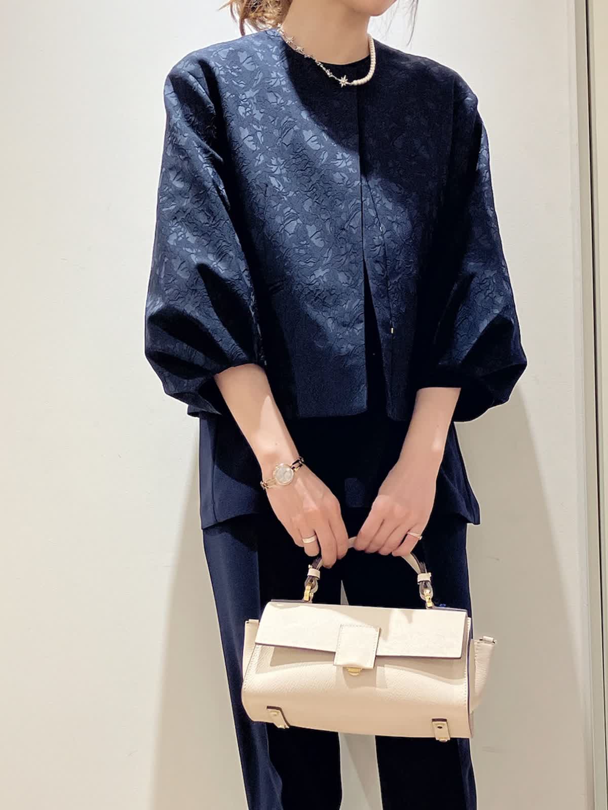 【着用サイズ】ジャケット:7号 ブラウス:9号 パンツ:7号 【着用カラー】ジャケット:ネイビー ブラウス:ネイビー パンツ:ネイビーコーディネートのテーマはセレモニースタイリングです。オールネイビーで揃えた。パンツ派さんを袖パフのフェミニンなジャケットを少し女性らしくまとめたコーディネート。 セレモニーにはもちろん、お出かけや、お食事会など、様々なシーンで大活躍間違いなしのおすすめコーディネートです。